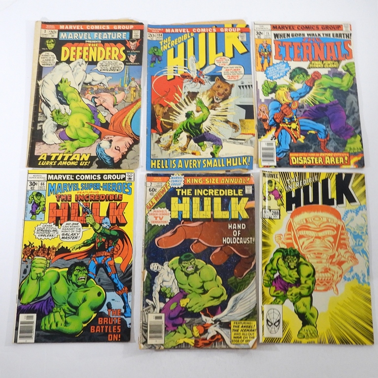 THE DEFENDERS #3 JUNE 1972 (VG) – THE INCREDIBLE HULK #154 AUG 1972 (FAIR) – THE ETERNALS #15 SEPT 1977 (VG) – #66 SEPT 1977 (VG) – THE INCREDIBLE HULK #7 1978 (GOOD) – THE INCREDIBLE HULK #288 OCT 1983 (VG)