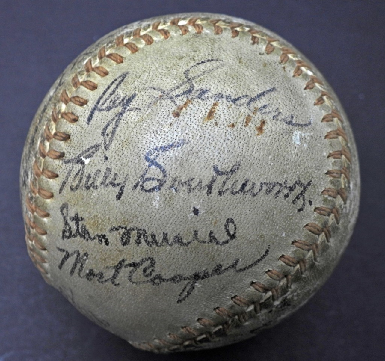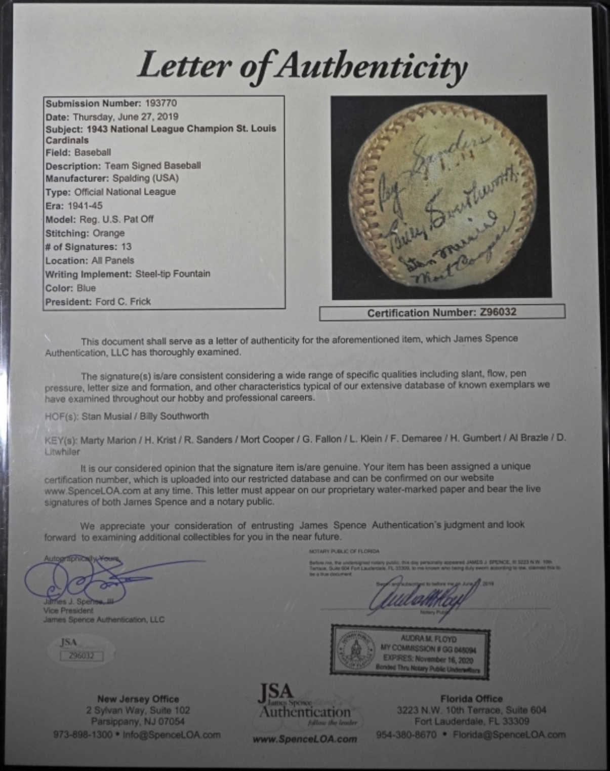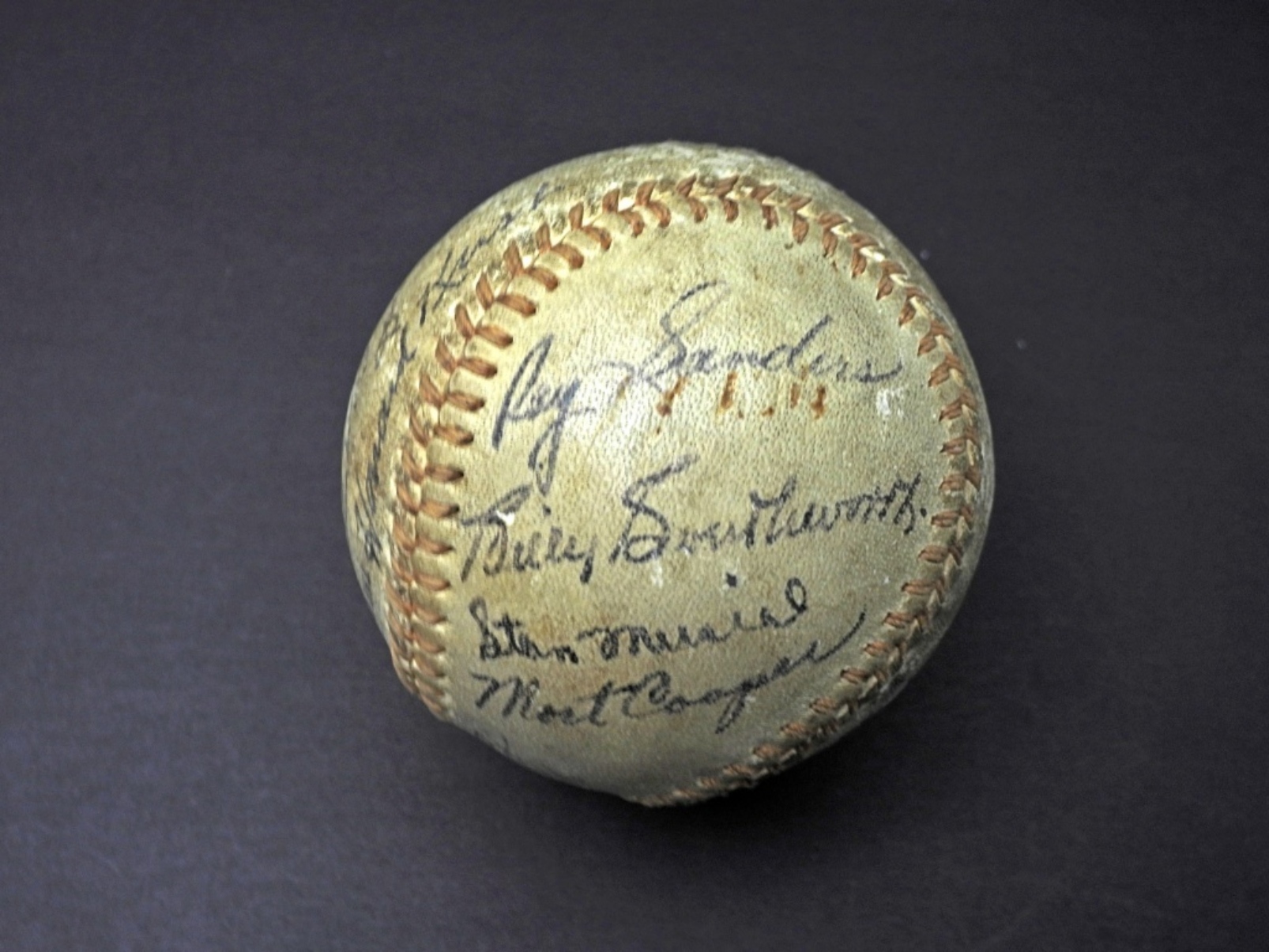 JSA LETTER OF AUTHENTICITY # Z96032, 13 SIGNATURES, SIGNED ON A SPALDING (USA) OFFICIAL NATIONAL LEAGUE BASEBALL, HOFS: STAN MUSIAL, BILLY SOUTHWORTH, KEYS: MARTY MARION, H.KRIST, R.SANDERS, MORT COPPER, G.