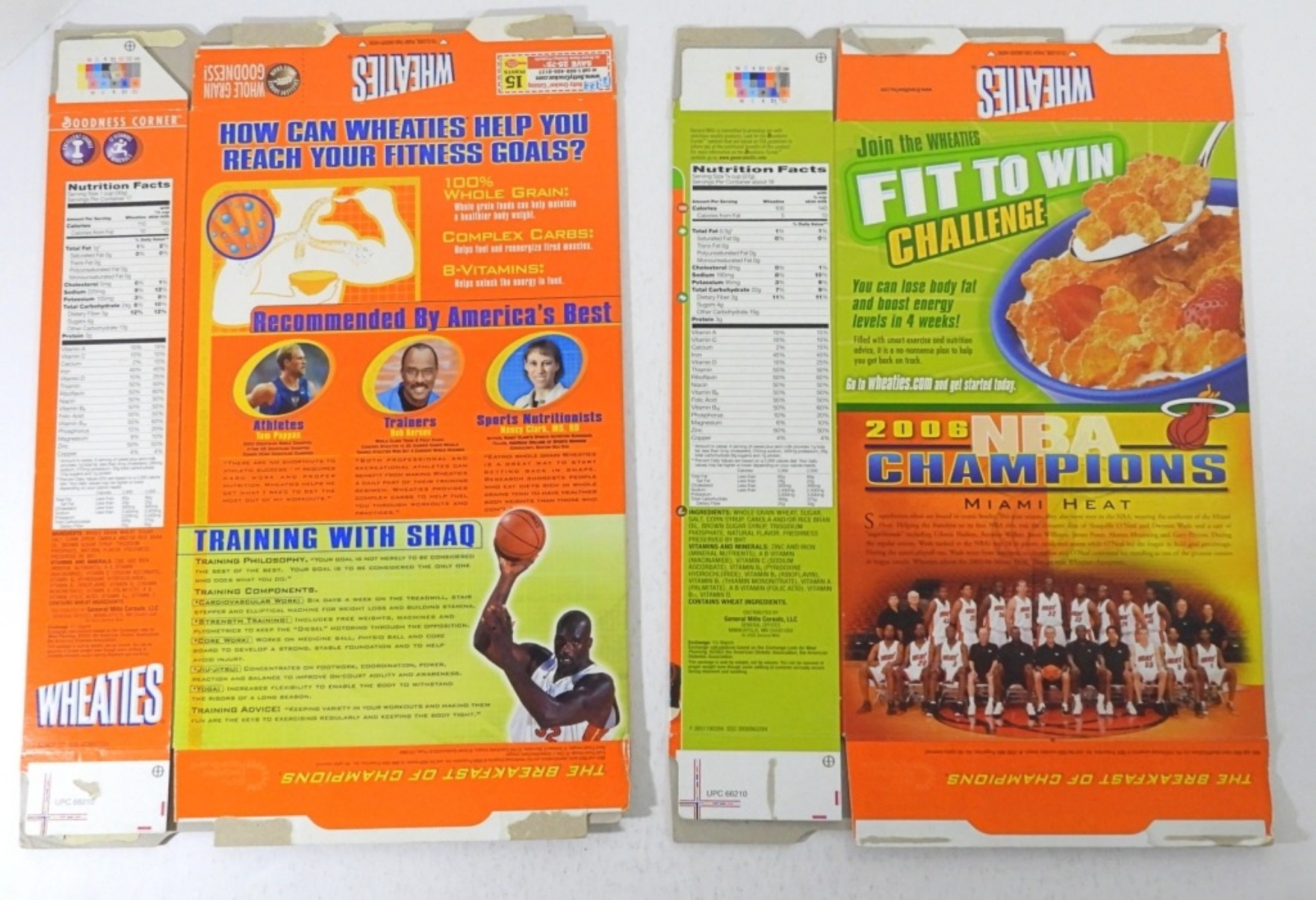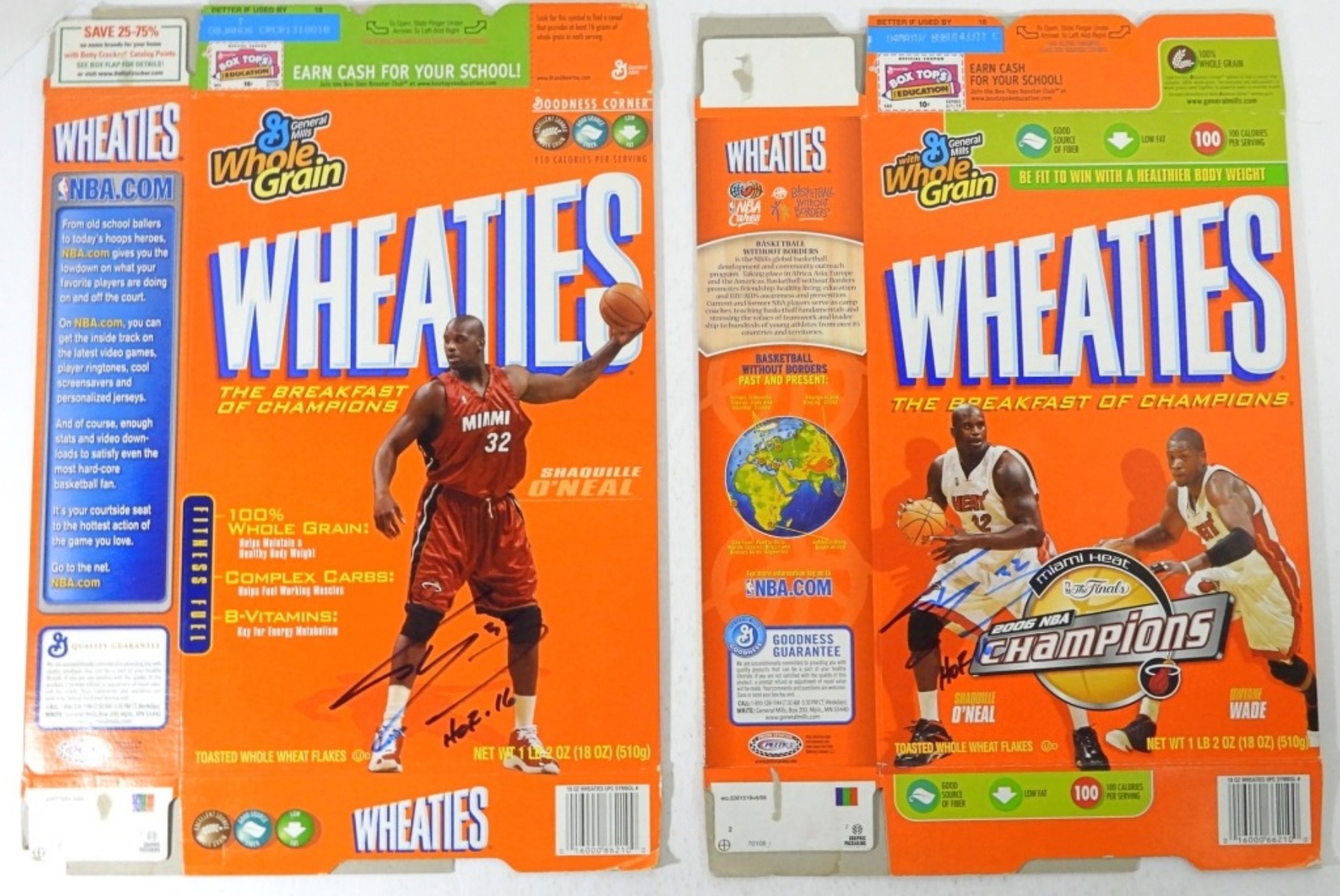 3 SIGNED SHAQUILLE ONEAL BOXES MIAMI HEAT 2006 NBA CHAMPIONS BOX WITH DWYANE WADE, 2005 WHEATIES BOX UNCERTIFIED