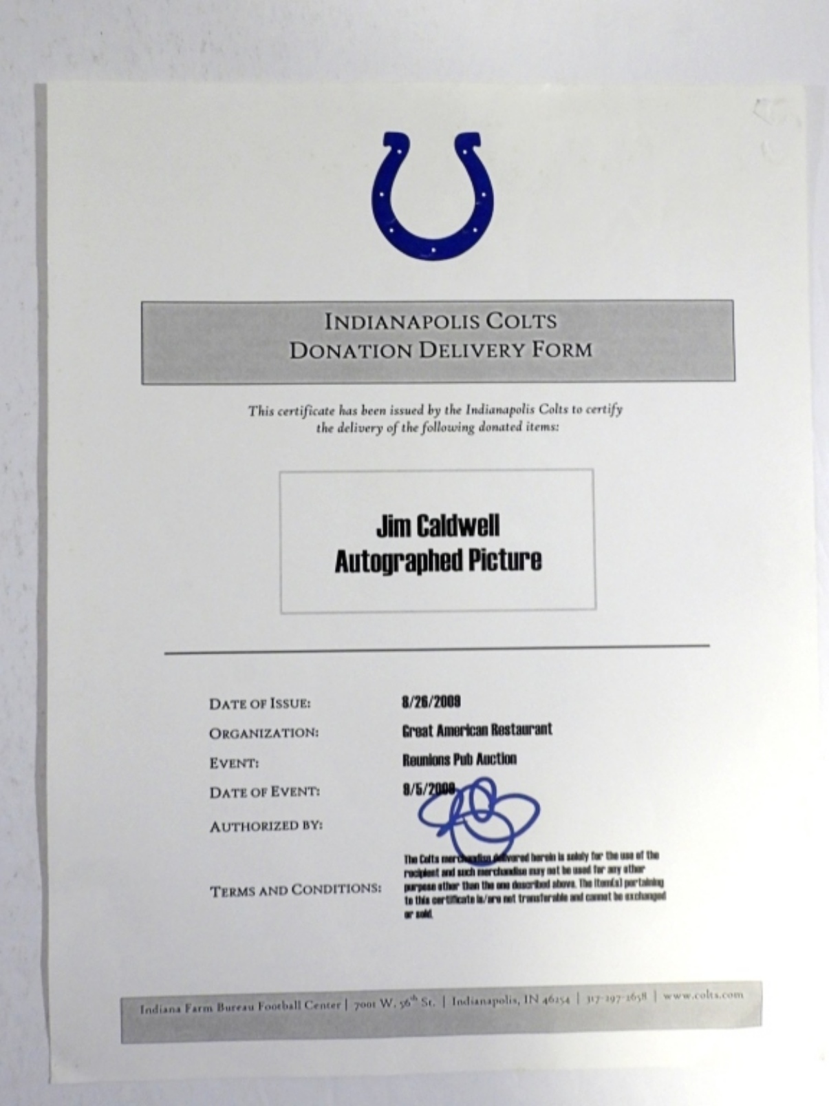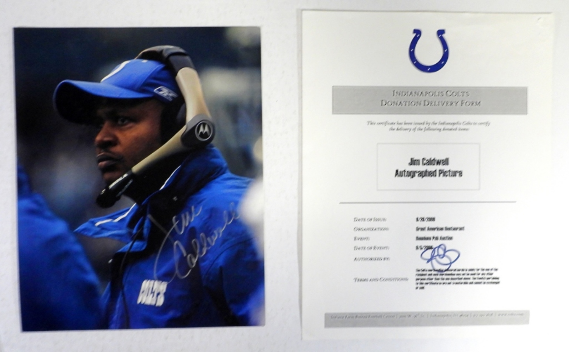 JIM CALDWELL AUTOGRAPHED COLTS PICTURE CERTIFIED