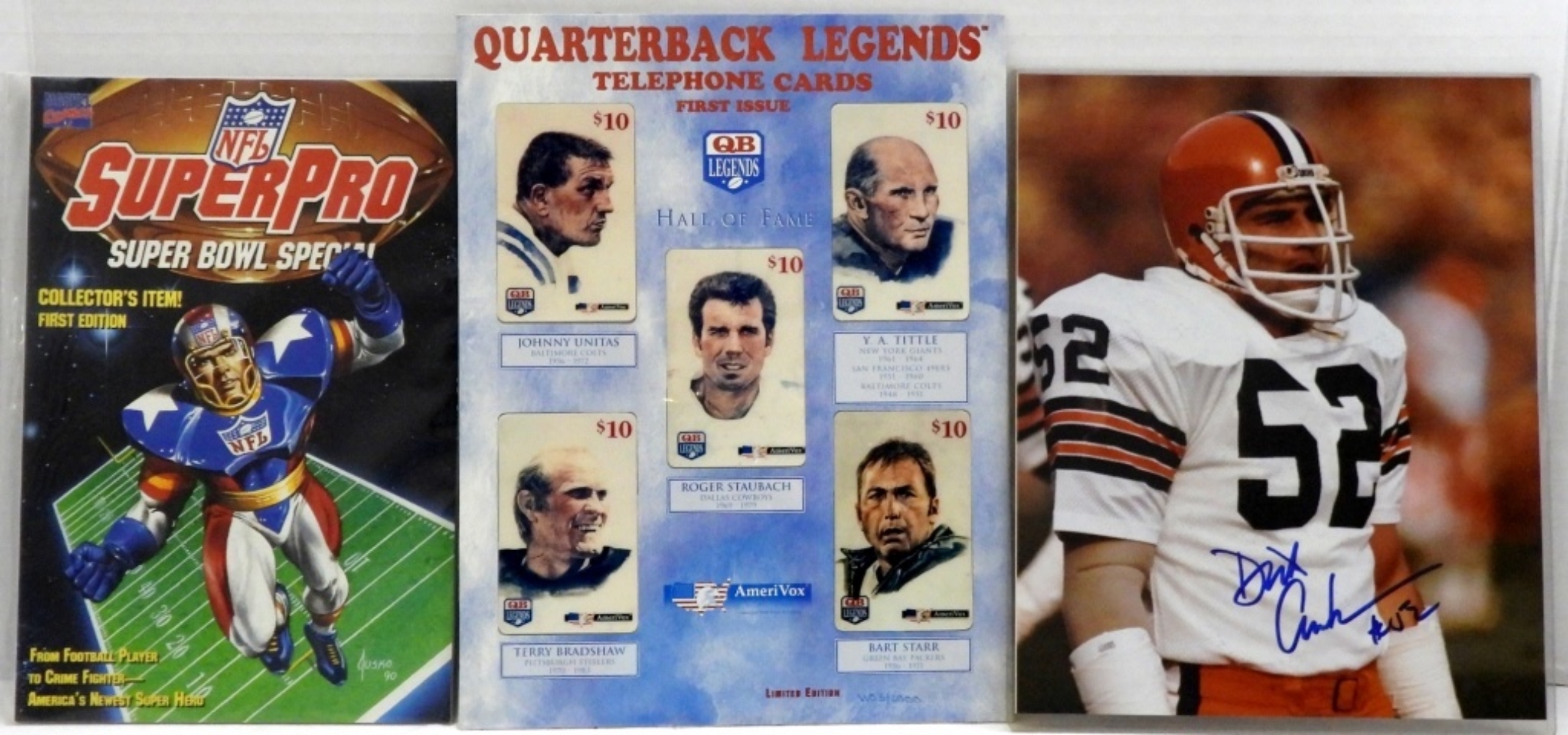 1-CLEVELAND BROWNS #52 DICK AMBROSE AUTOGRAPH, 2- McDONALD’S LIMITED EDITION 1993 BROWNS GAME DAY CARDS, 1- FLEER NFL 2004 BROWNS COLLECTORS 10 CARD SET, QUARTERBACK LEGENDS TELEPHONE CARDS FIRST ISSUE FROM