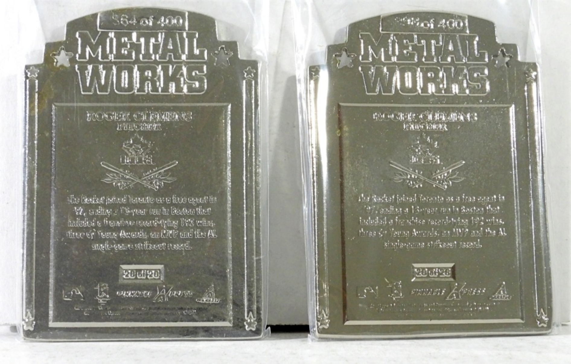 2 1997 ROGER CLEMENS PINNACLE SILVER X-PRESS METAL WORKS #398/400,364/400