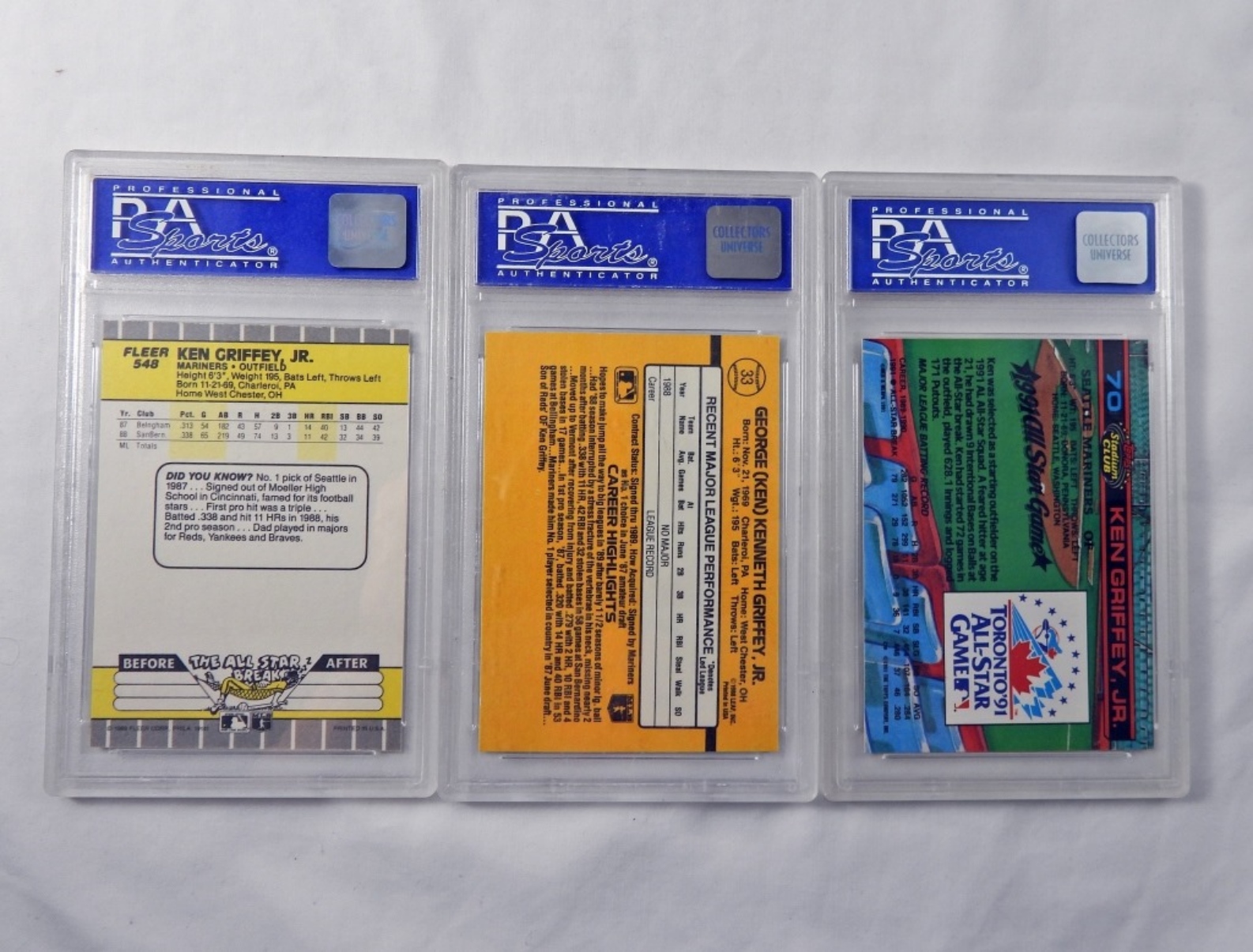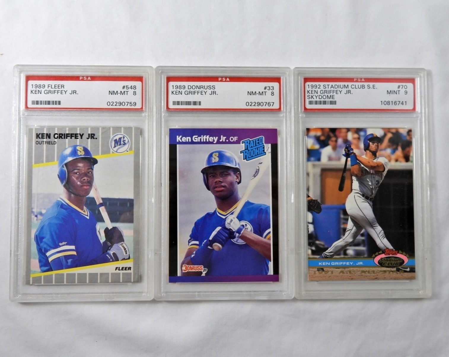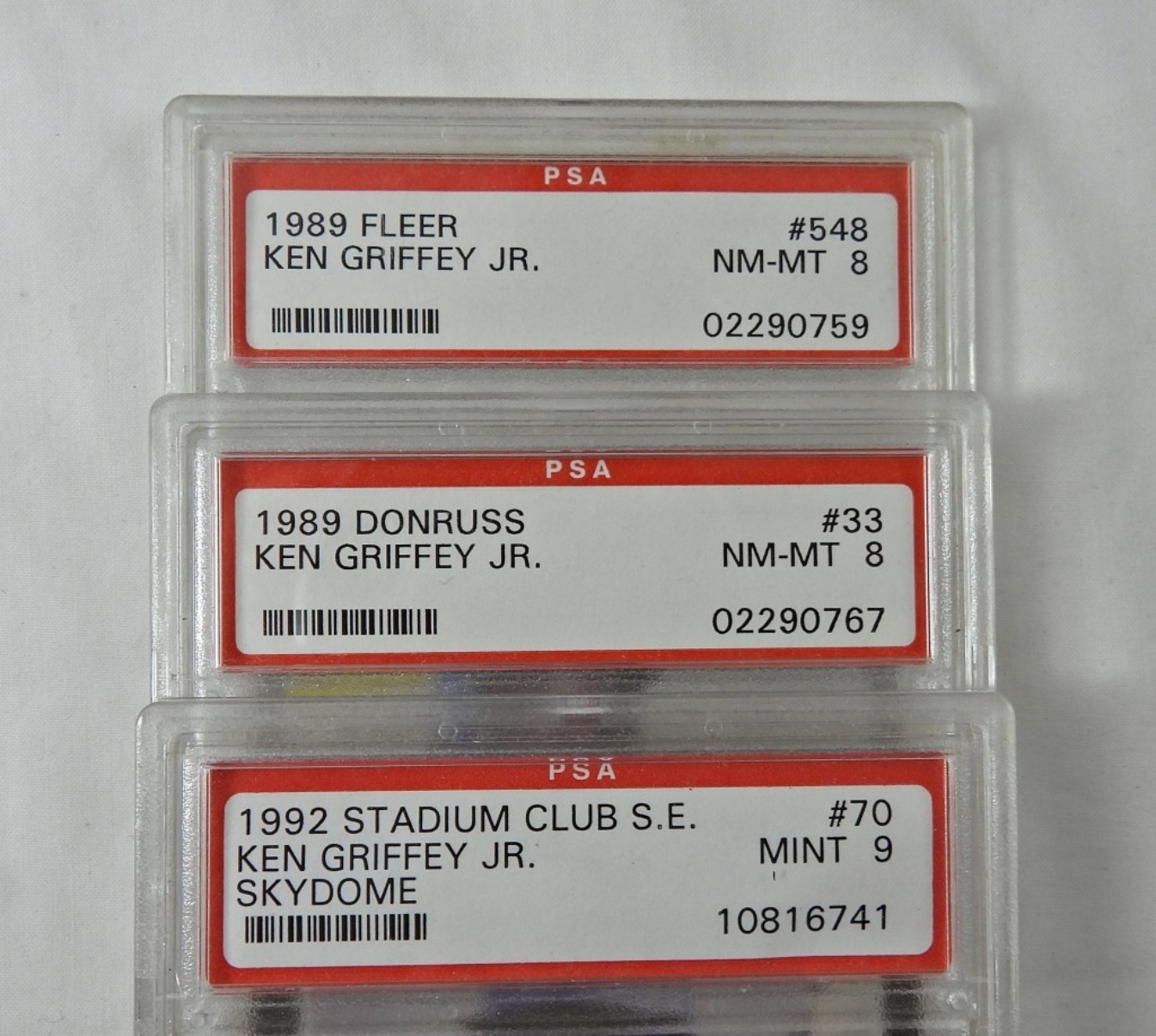 PSA FLEER 1989 KEN GRIFFEY JR #548 NM-MT 8, PSA DONRUSS 1989 KEN GRIFFEY JR #33 NM-MT 8, PSA STADIUM CLUB S.E. KEN GRIFFEY JR SKYDOME #70 MINT 9.