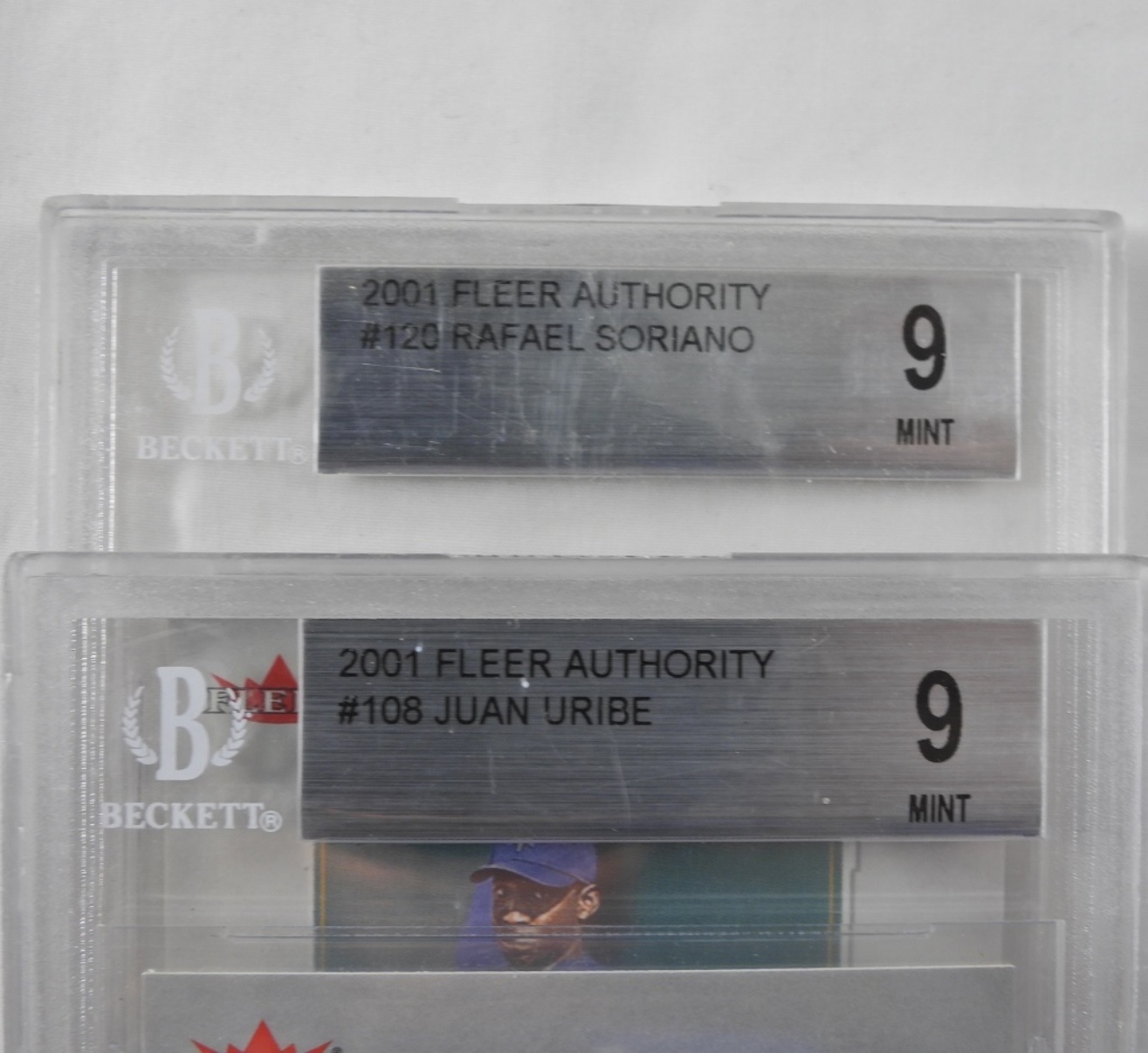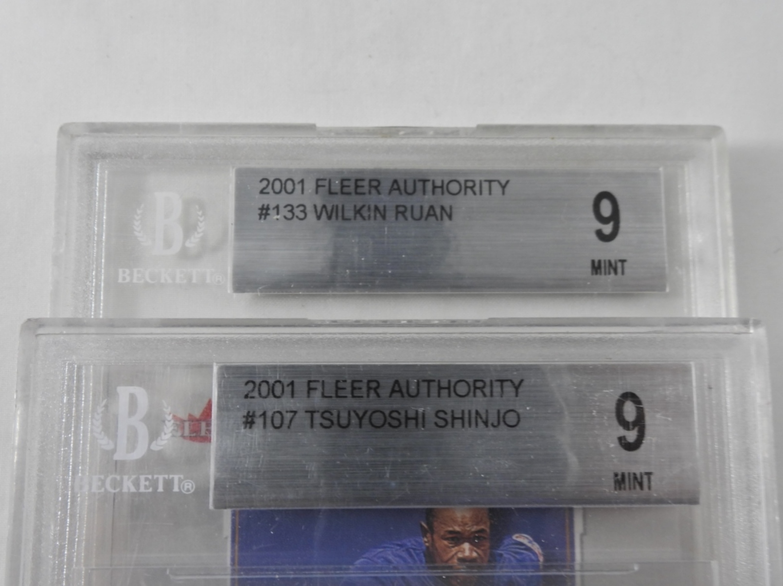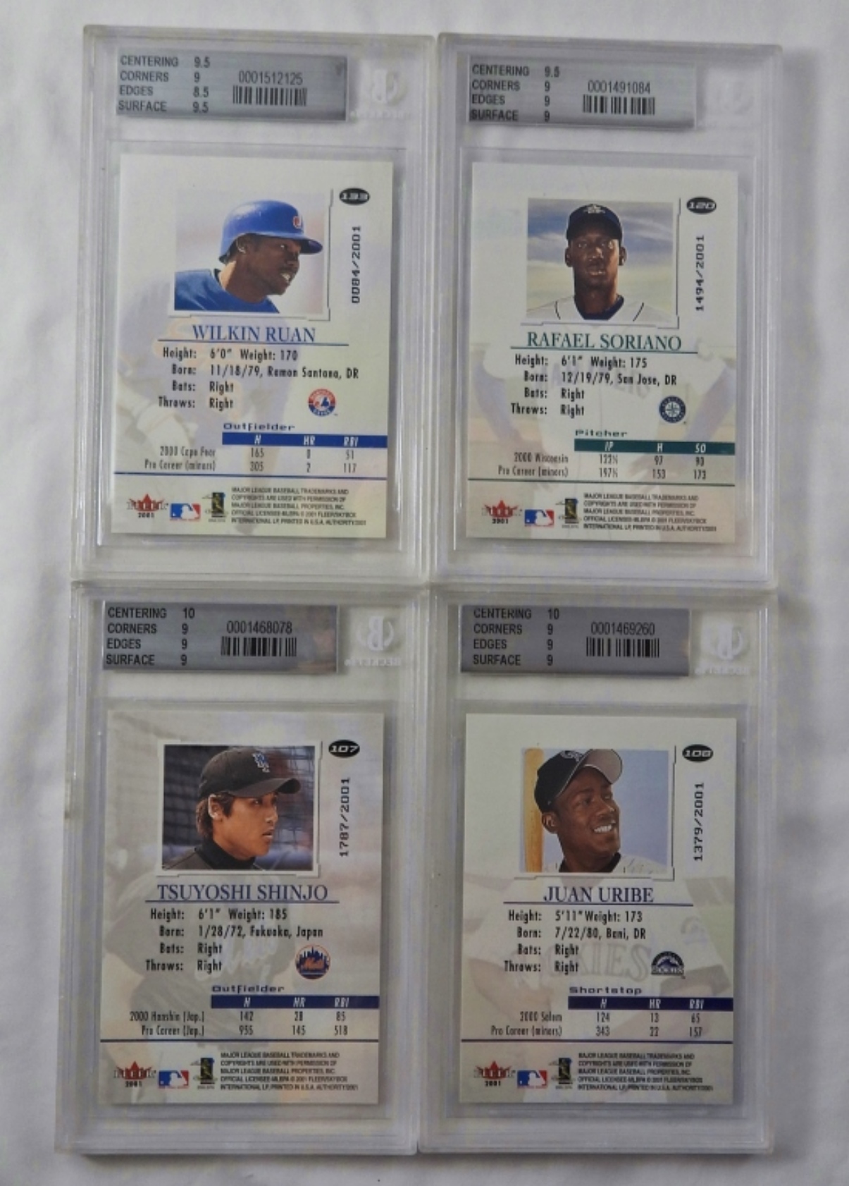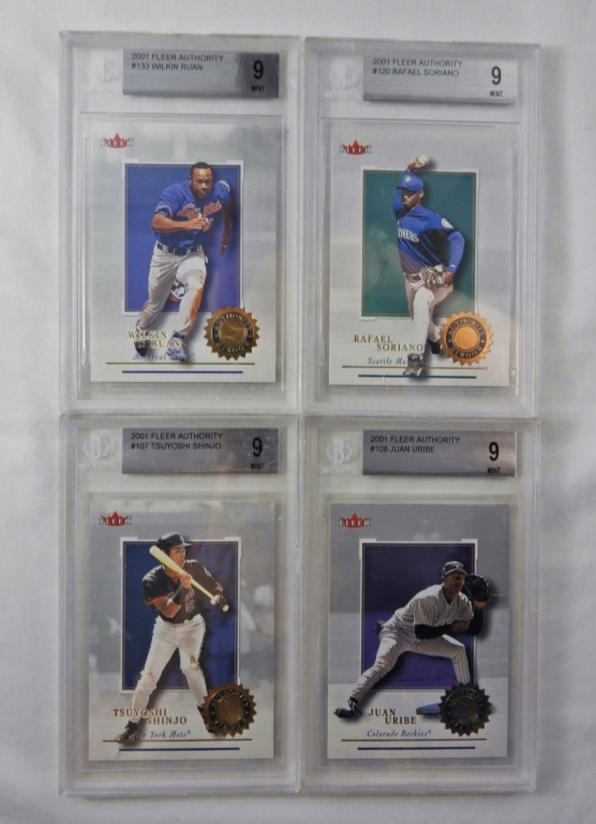 BECKETT FLEER AUTHORITY 2001 MINT 9 CARDS. WILKIN RUAN, RAFAEL SORIANO, TSUYOSHI SHINJO, JUAN URIBE.