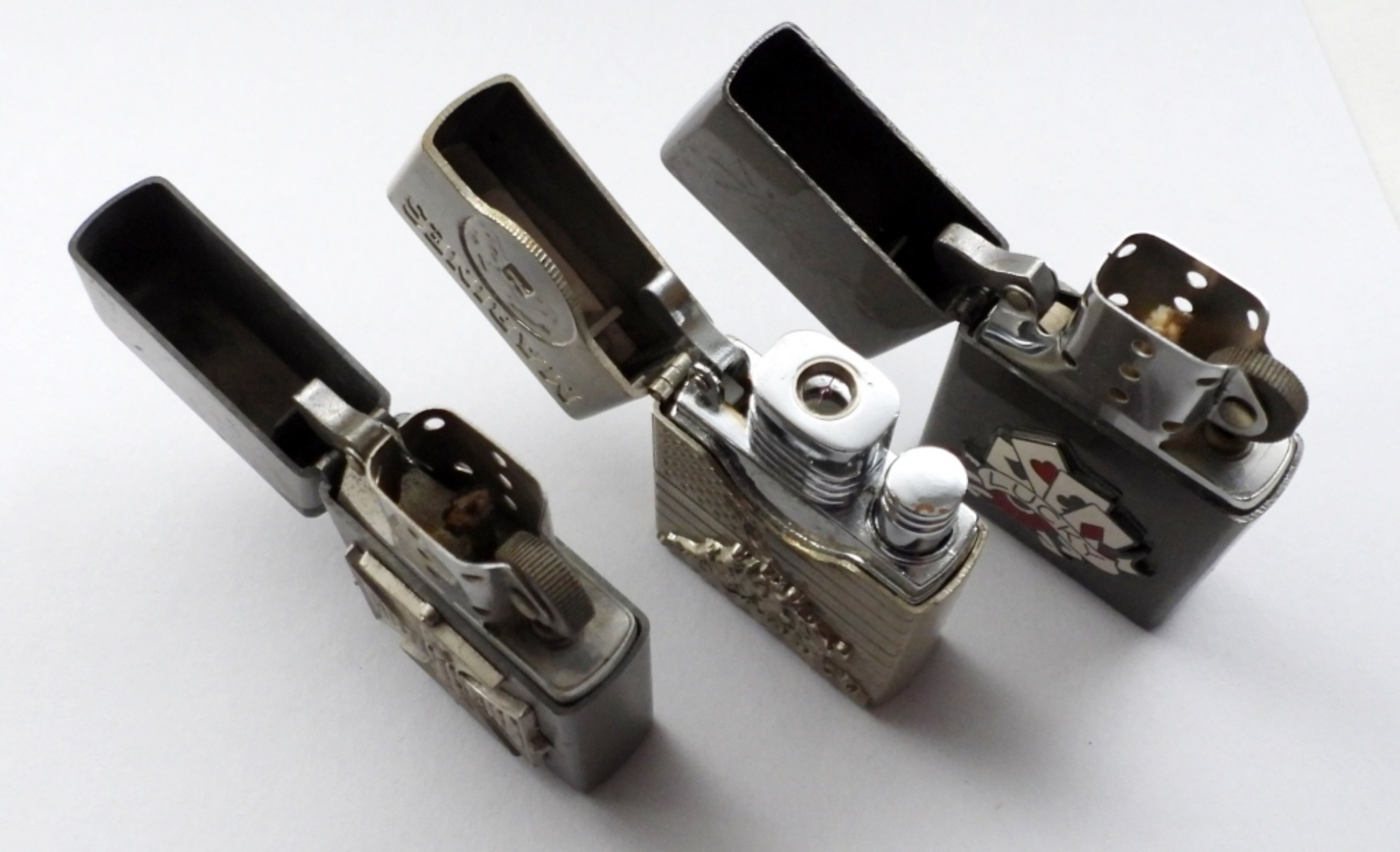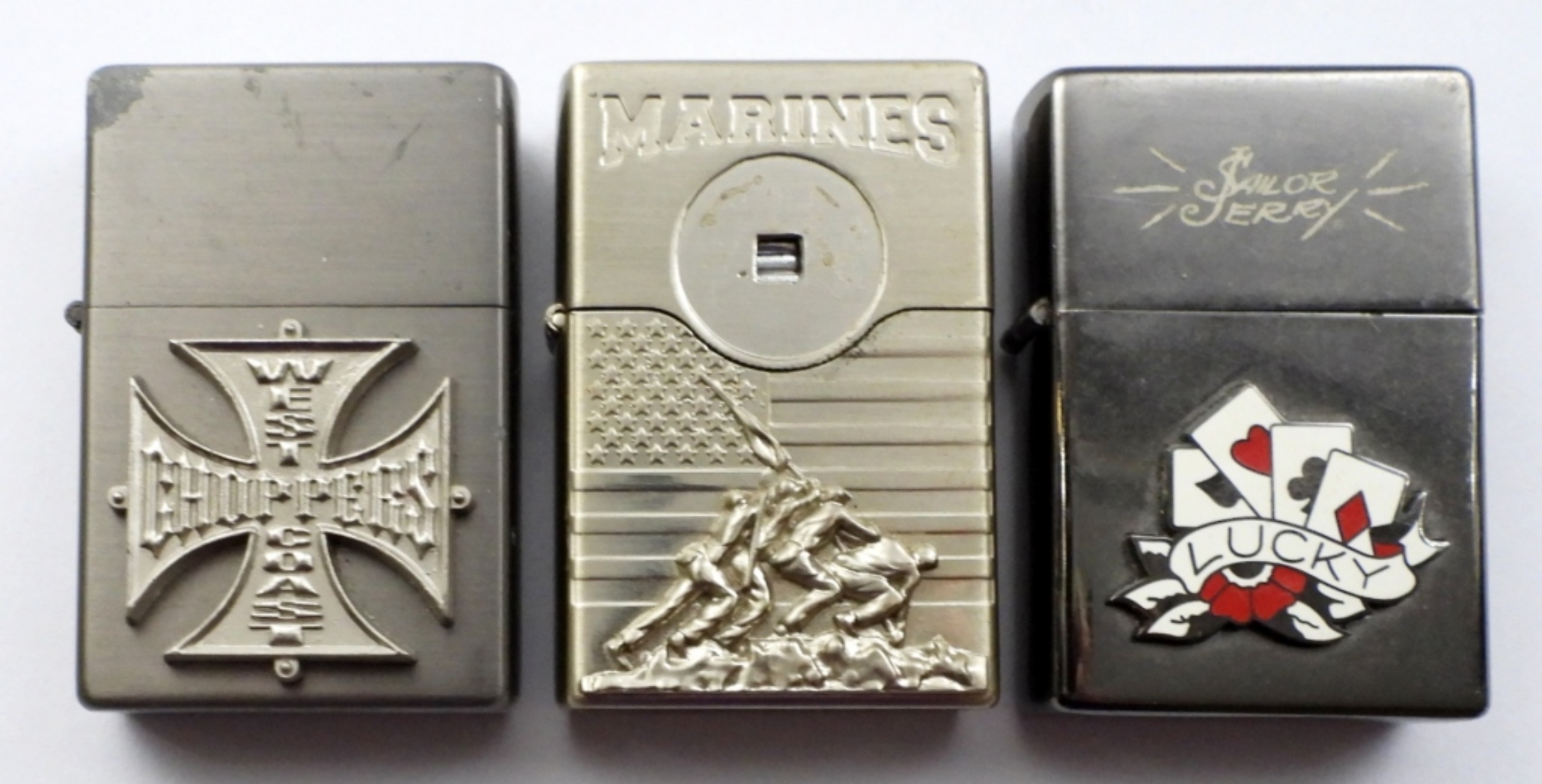 MARINES, WEST COAST CHOPPERS, SAILOR JERRY, FLIP TOP HANDHELD LIGHTERS, ALL USED CONDITION