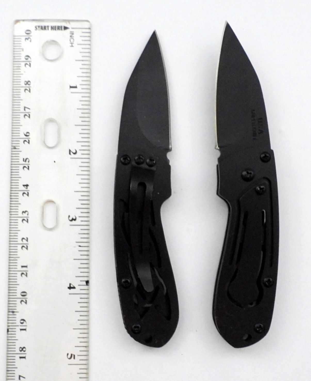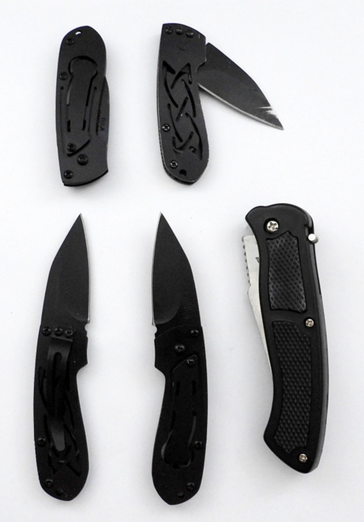 BLACK HANDLE FOLDING UTILITY KNIVES – (4) USA SUPER KNIFE 2″ BLADES, (1) UNABLE TO OPEN UTILITY KNIFE – NICE USED CONDITION