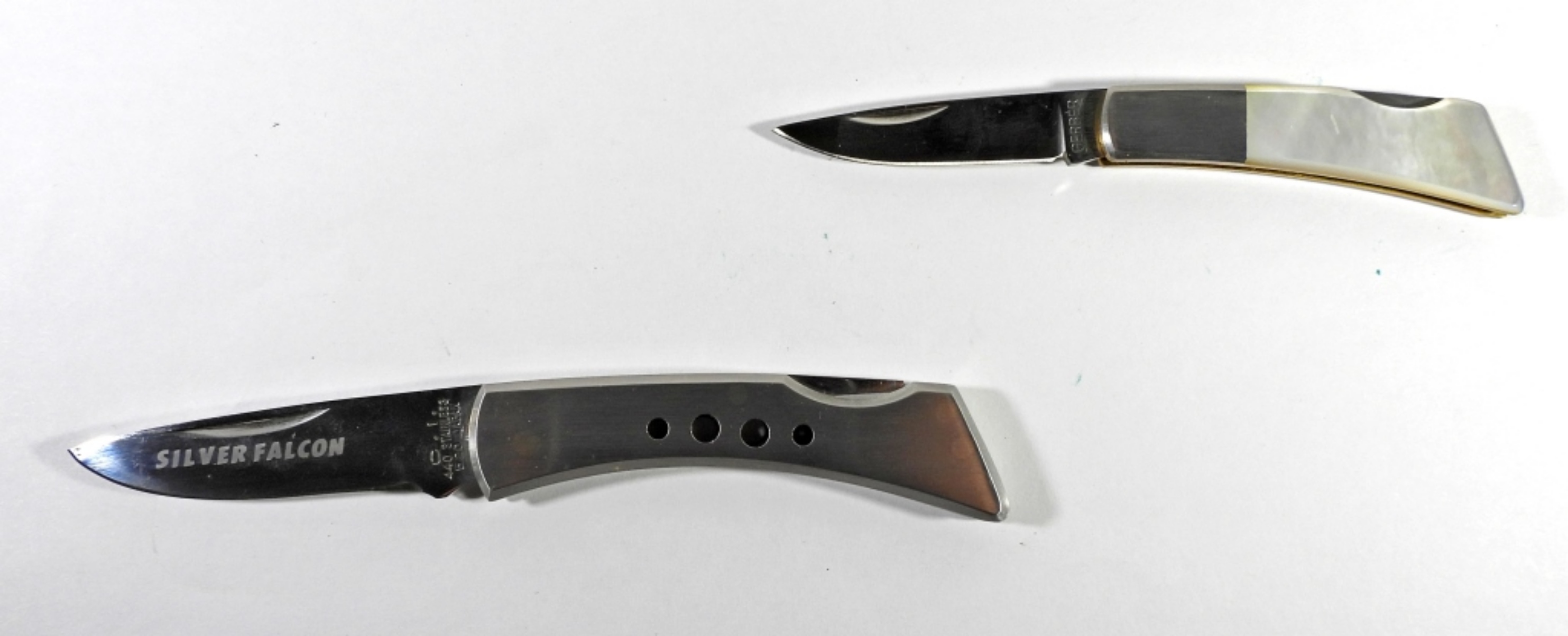 1 GERBER SILVER KNIGHT MOTHER OF PEARL HANDLE 1 COMPASS SILVER FALCON 440 SS