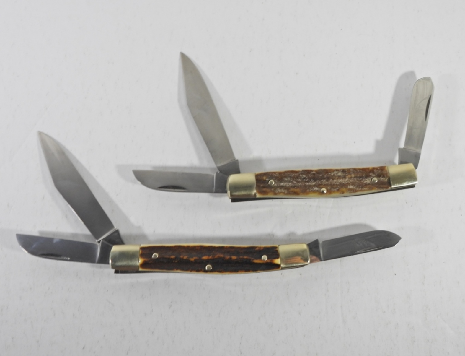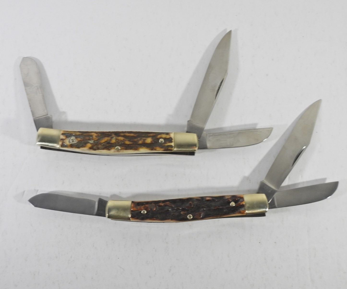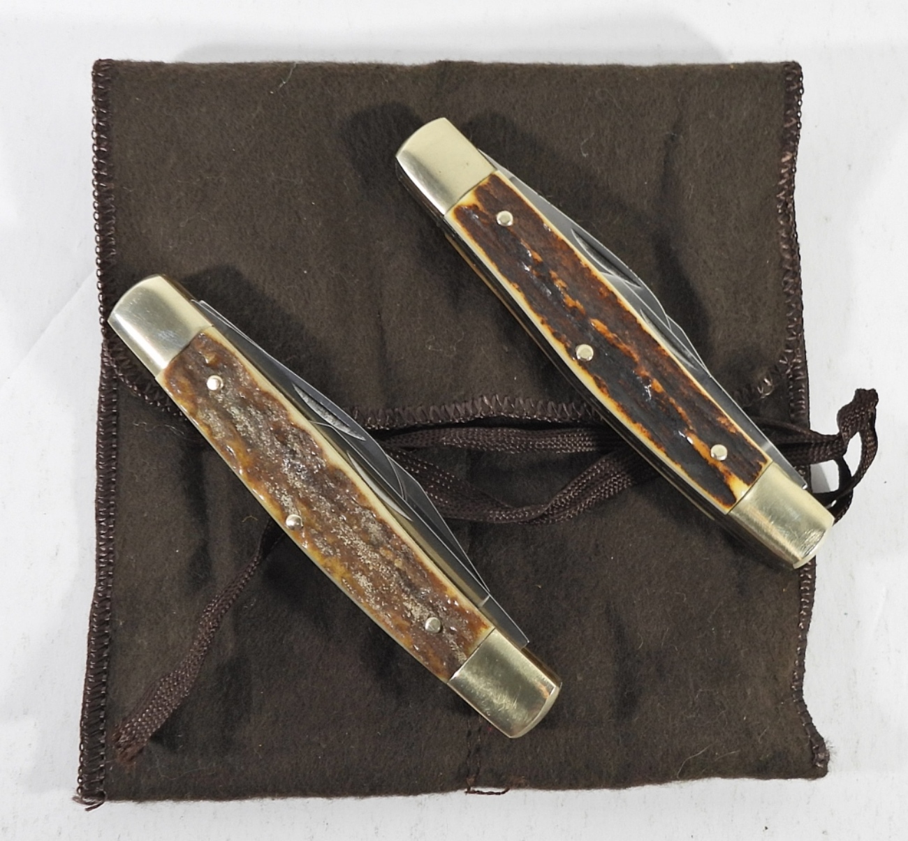 SET OF 2 HOFFRITZ N.Y. GERMANY POCKET KNIVES IN A BROWN FELT CARRY CASE. 4″ LONG CLOSED WITH 3 KNIFE OPTIONS.