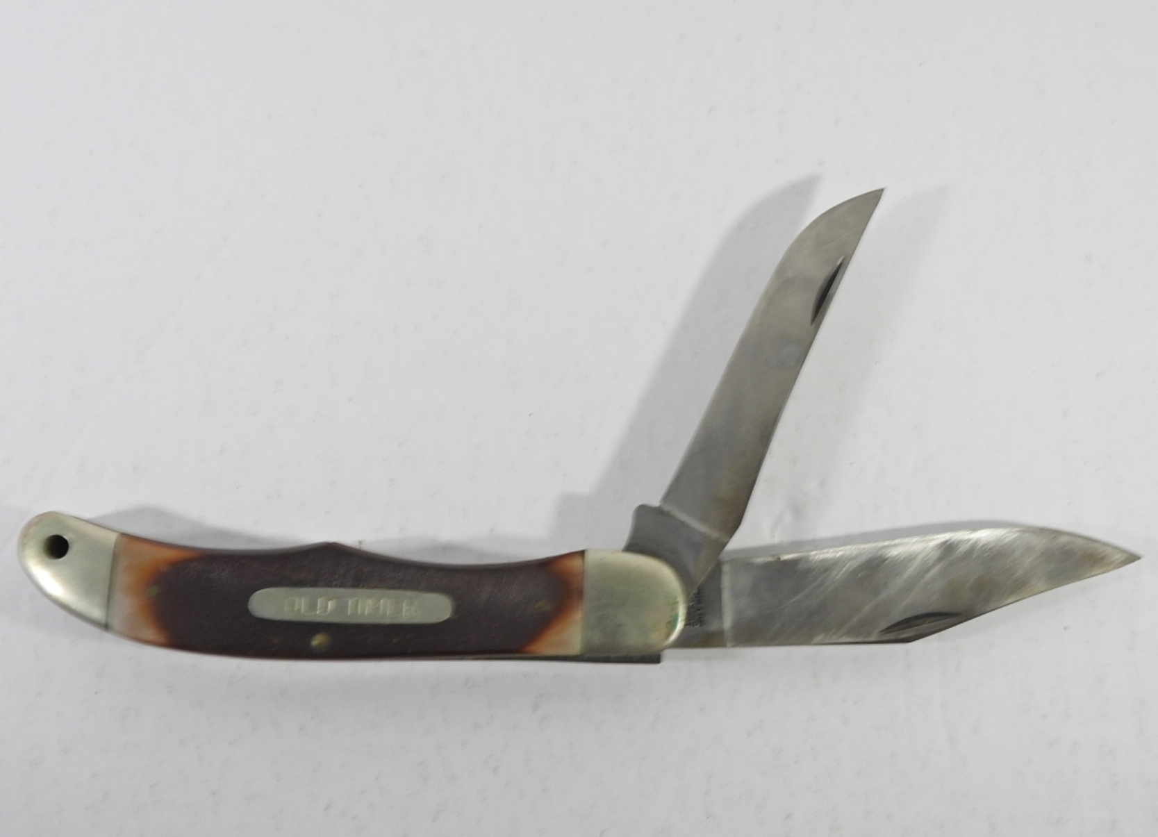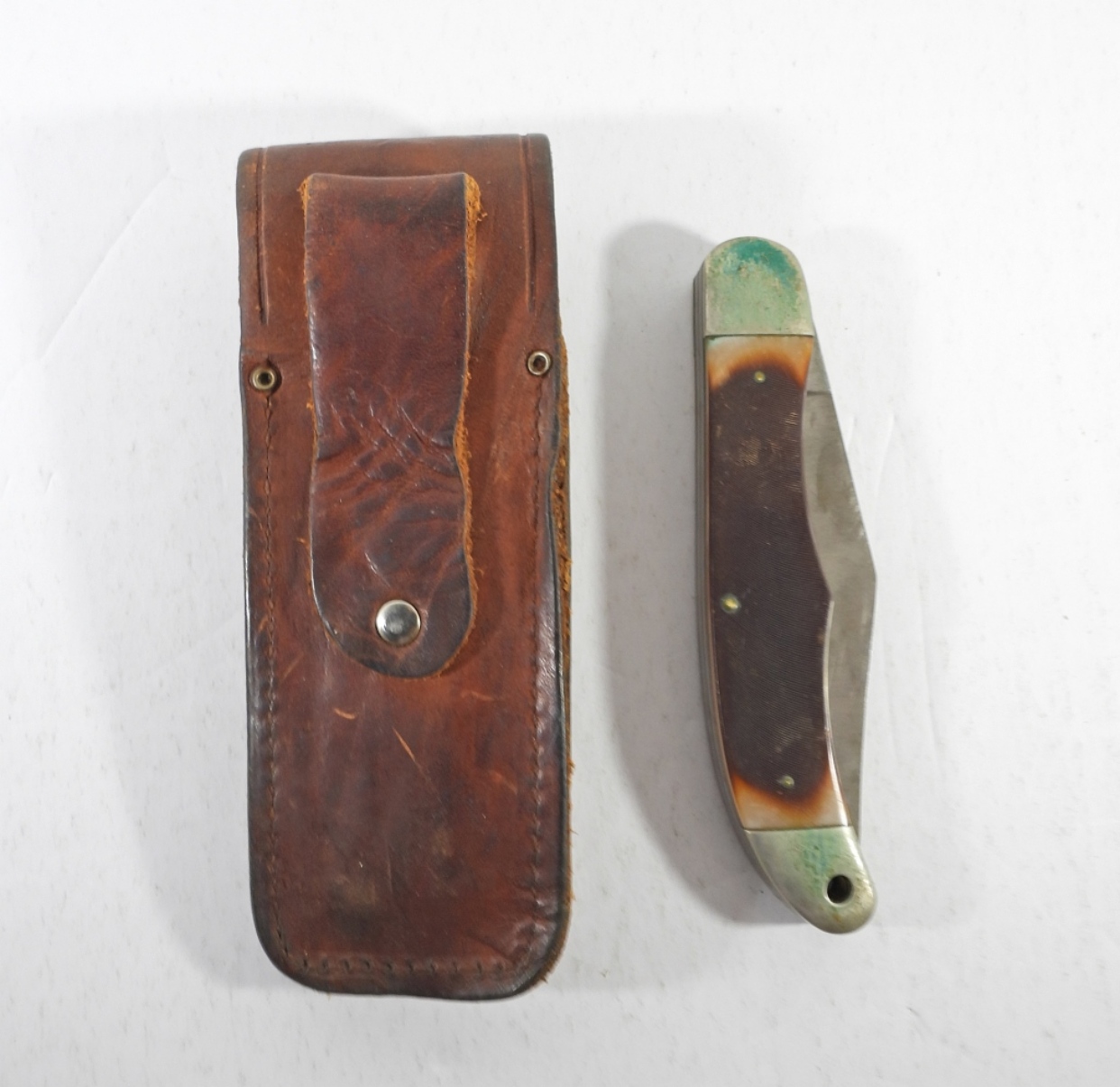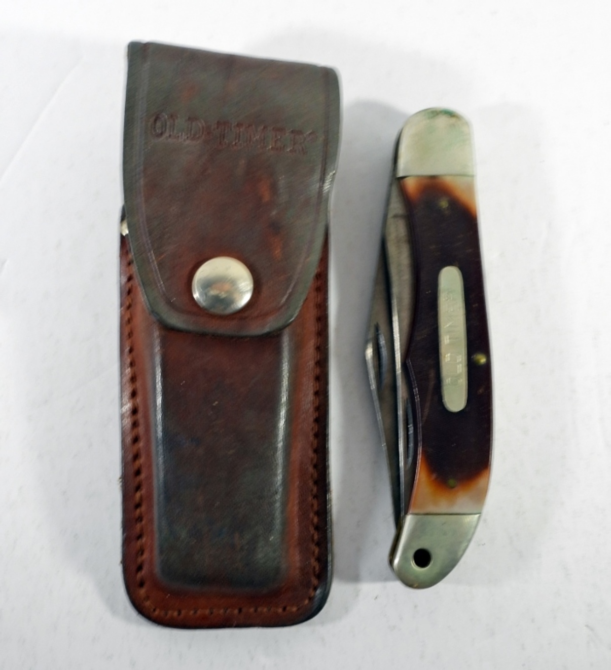 VINTAGE SCHRADE OLD TIMER 250T WITH BROWN LEATHER SHEATH. NORMAL WEAR. 9″ LONG OPEN, 5″ CLOSED.