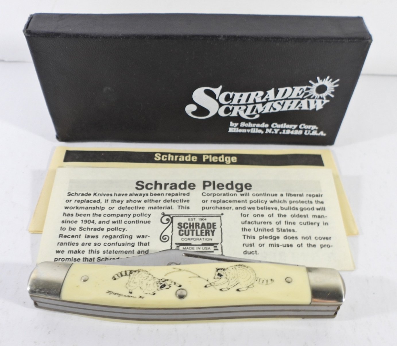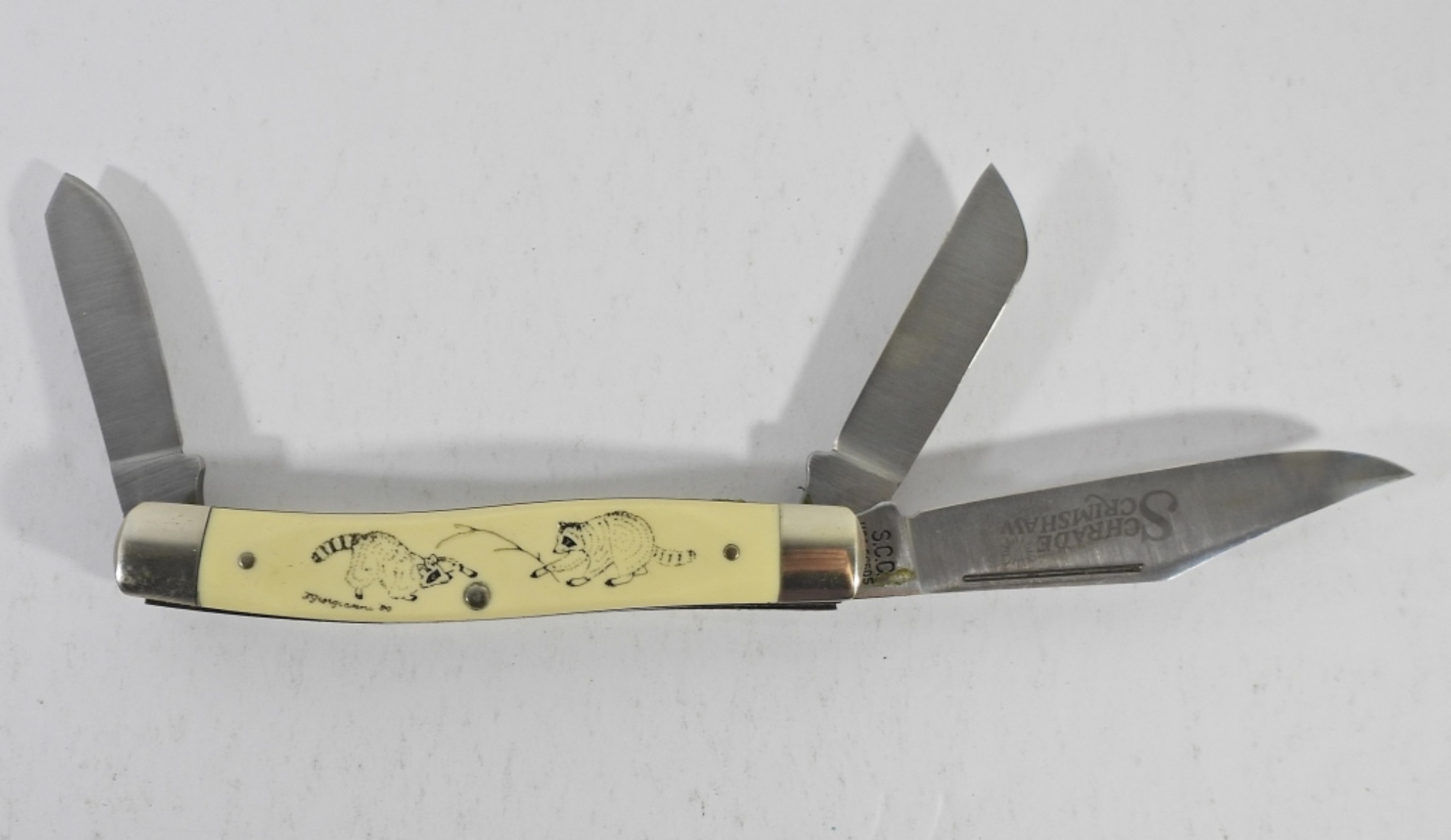 SCHRADE SCRIMSHAW 505 SC POCKET KNIFE WITH RACCOONS ON IT. ORIGINAL BOX AND PAPERS. VERY NICE.
