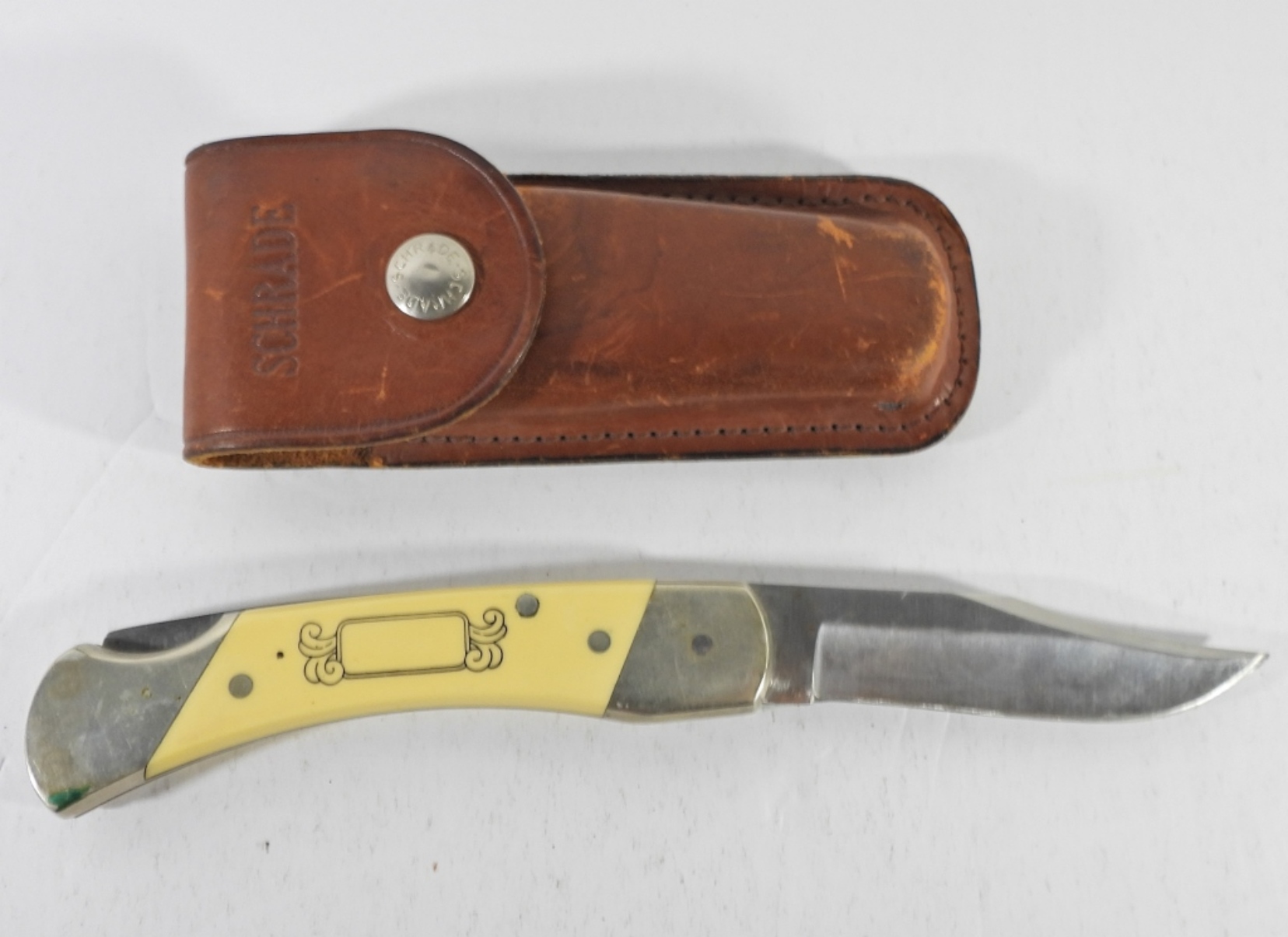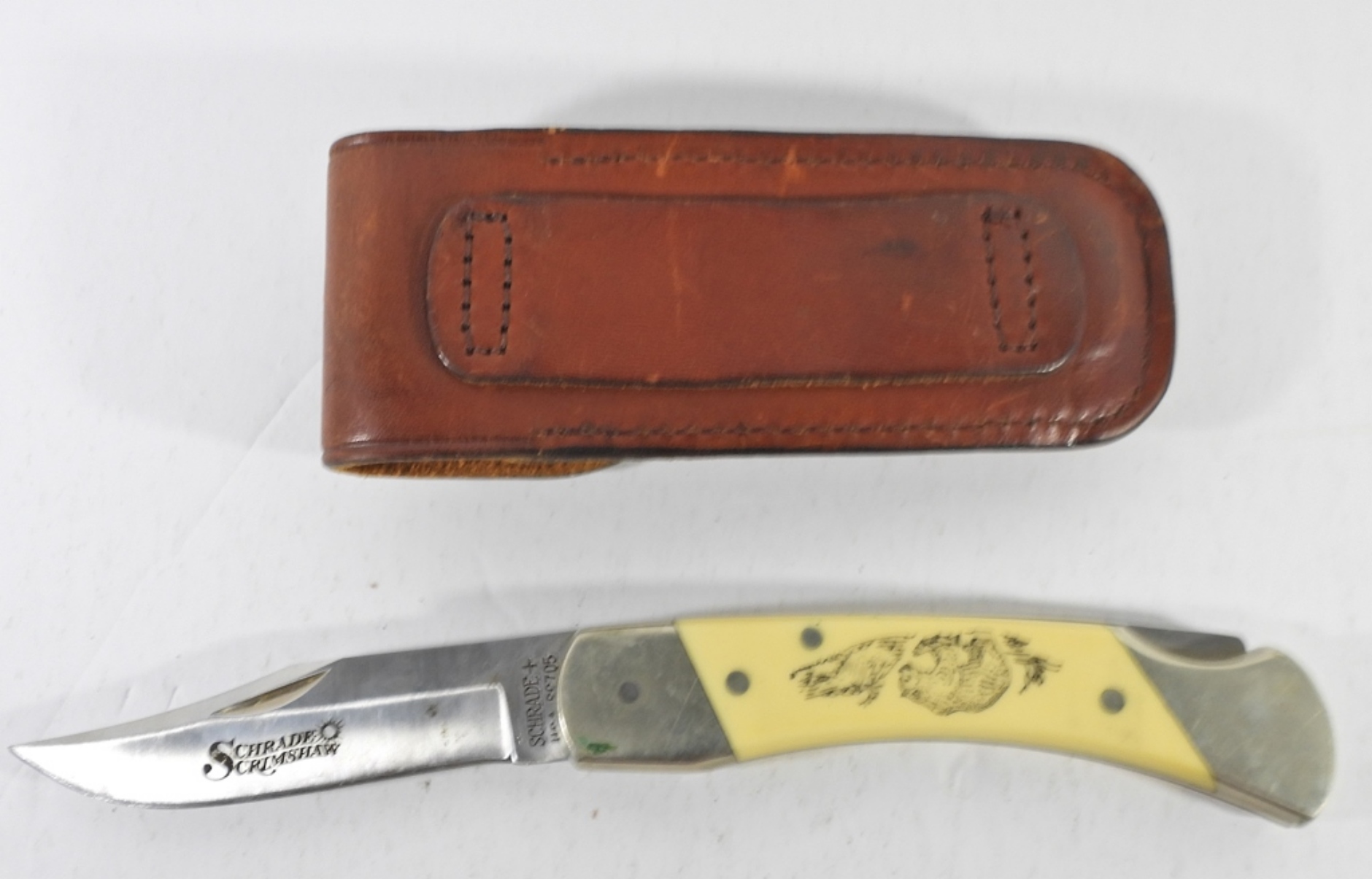 SCHRADE + USA SC705 FOLDING KNIFE WITH BROWN LEATHER SHEATH. CARVED BEAR HANDLE. SHOWS WEAR, BUT NICE. 9″ OPEN.