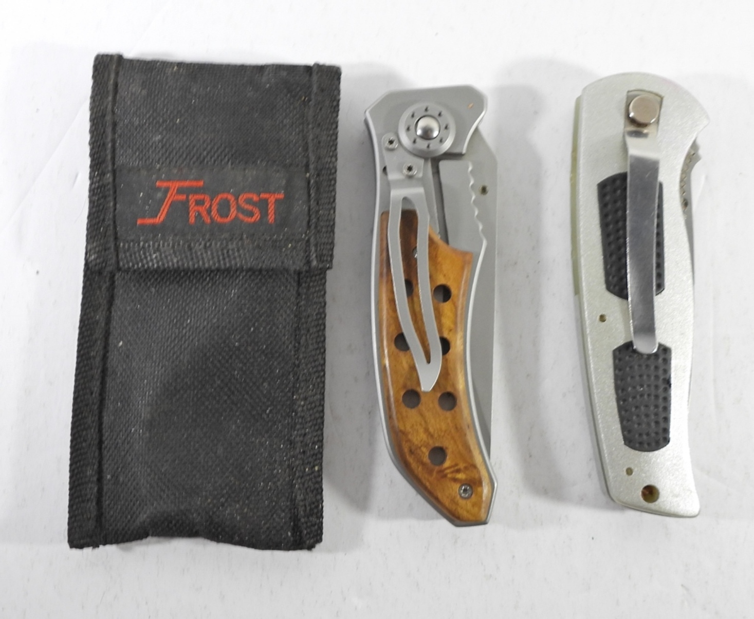 TWO TACTICAL KNIVES. FROST BRAND WITH NYLON CASE (8″ OPEN). UNBRANDED SILVER AND BLACK TACTICAL KNIFE (8.5″ OPEN).