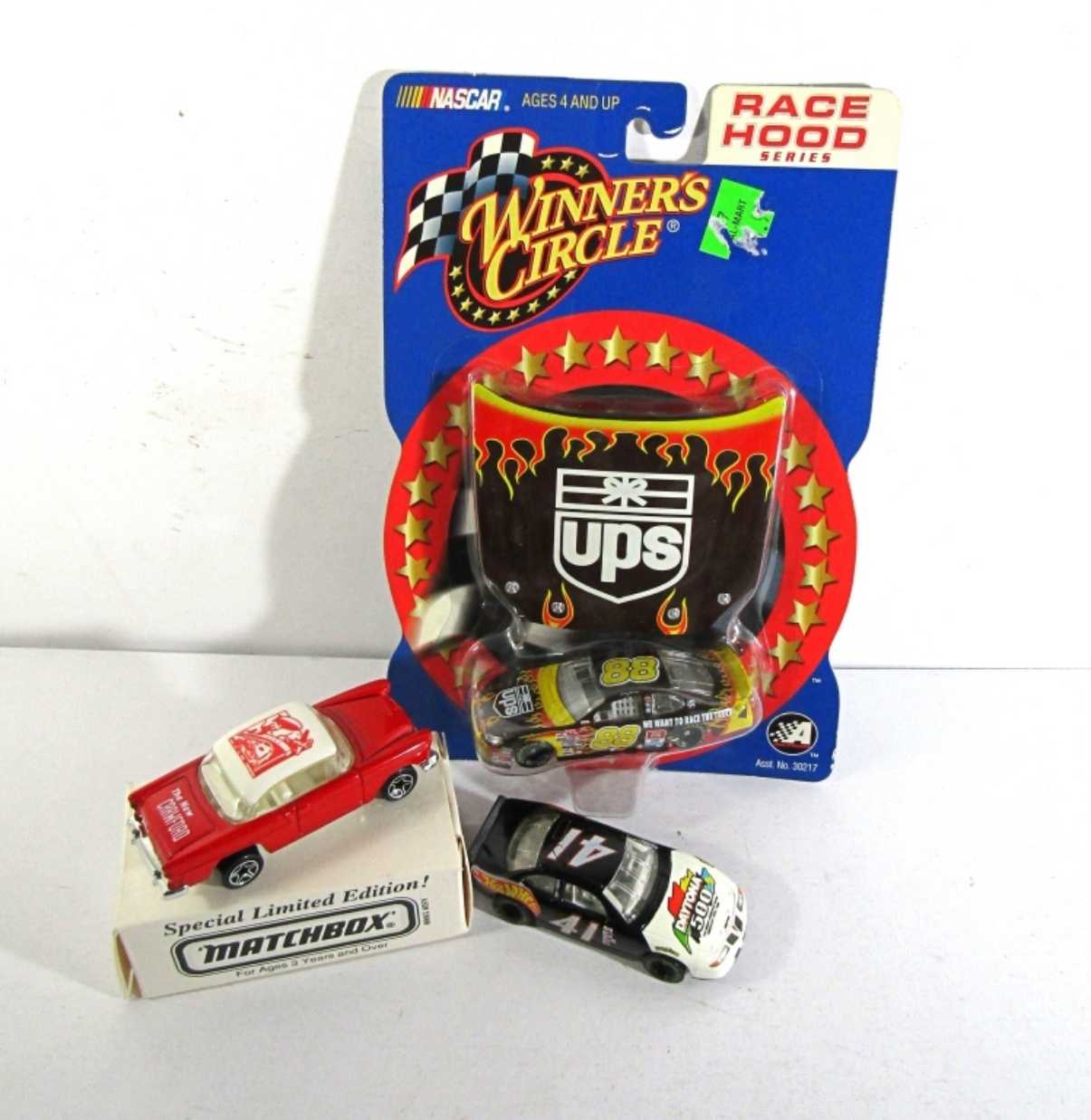 NASCAR WINNERS CIRCLE RACE HOOD SERIES #88 UPS CAR, NIB. DAYTONA 500 #41 HOT WHEELS CAR (NO BOX). MATCHBOX LIMITED EDITION “THE NEW CRAWFORD”. GREAT CONDITION.