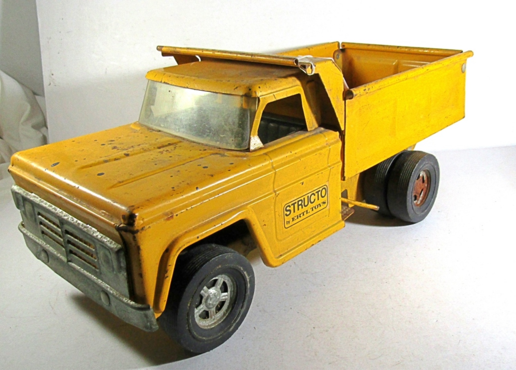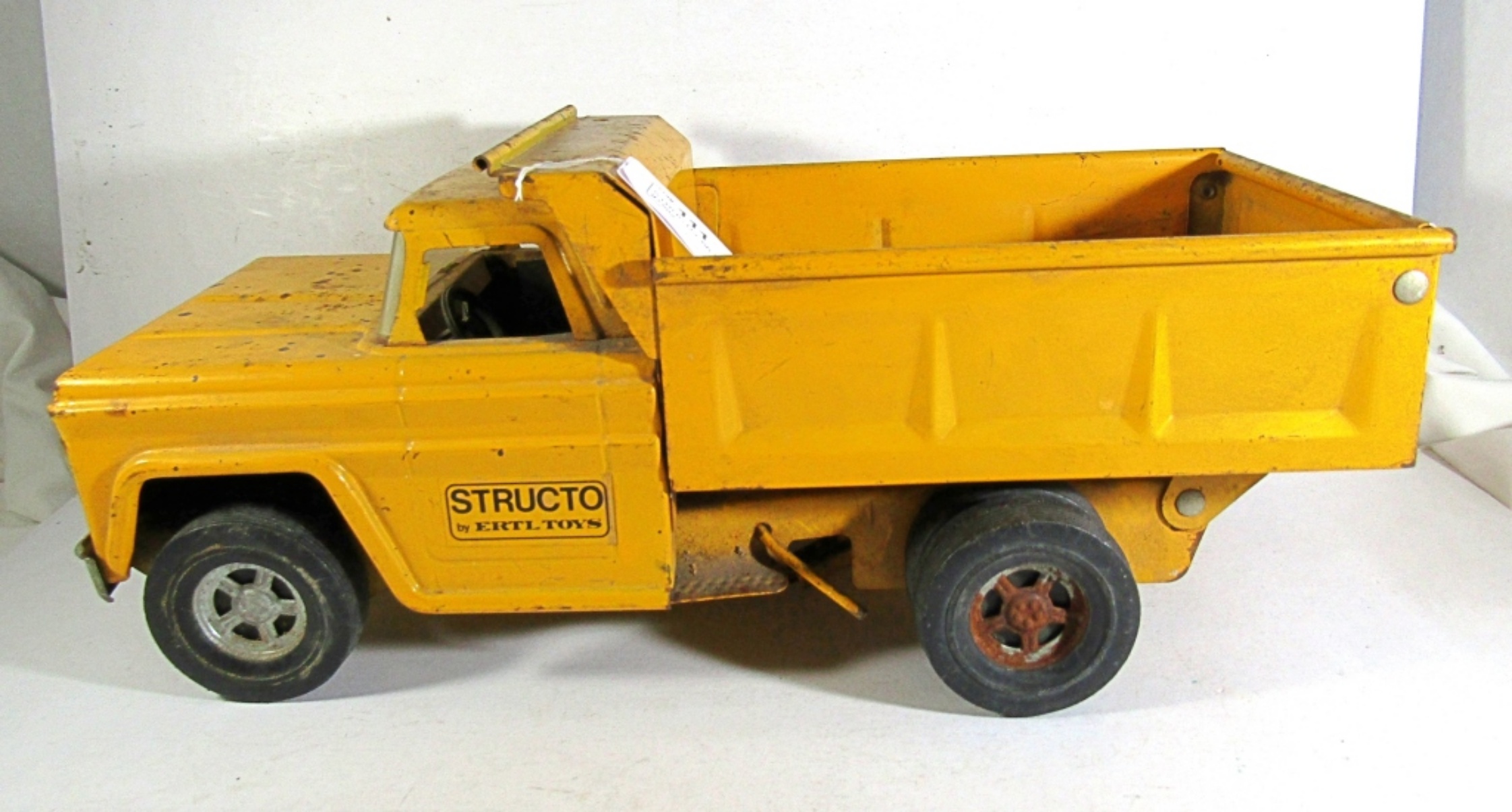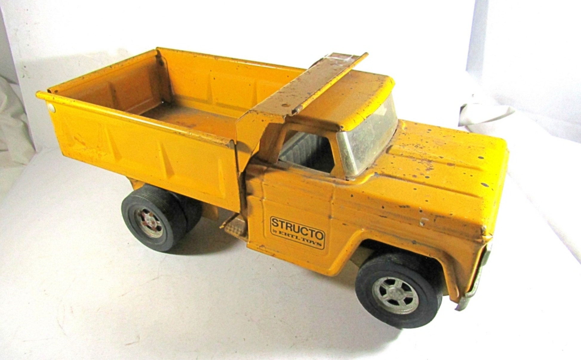 STRUCTO BY ERTL TOYS 1966 YELLOW METAL DUMP TRUCK. MOVING PARTS STILL MOVE. SOME RUST, DIRTY.