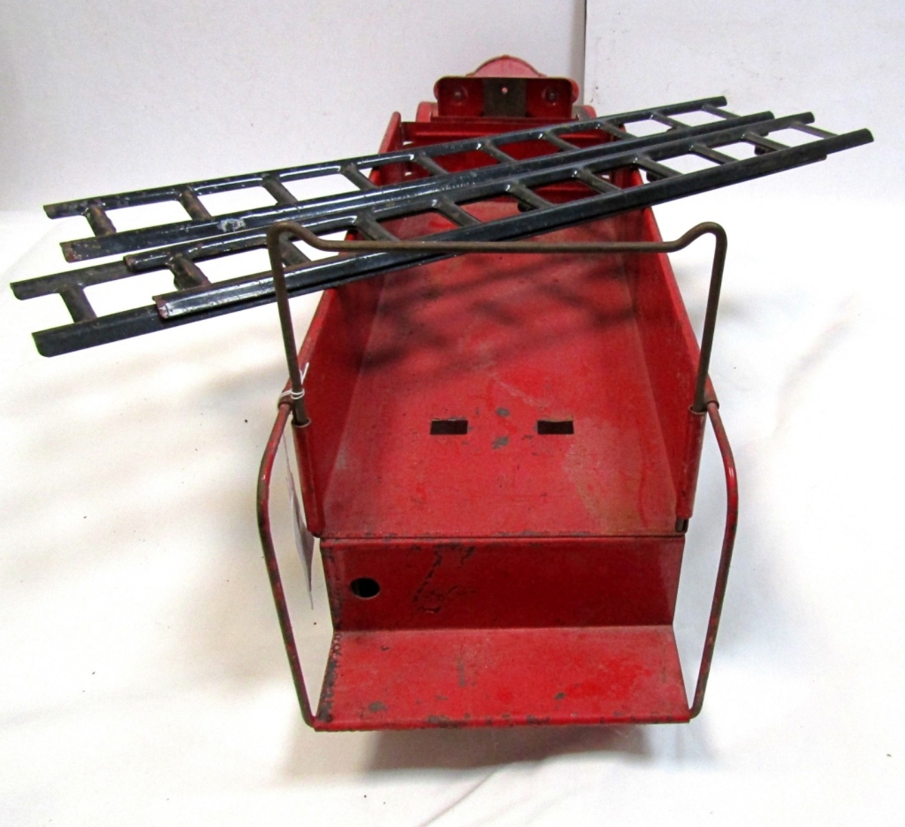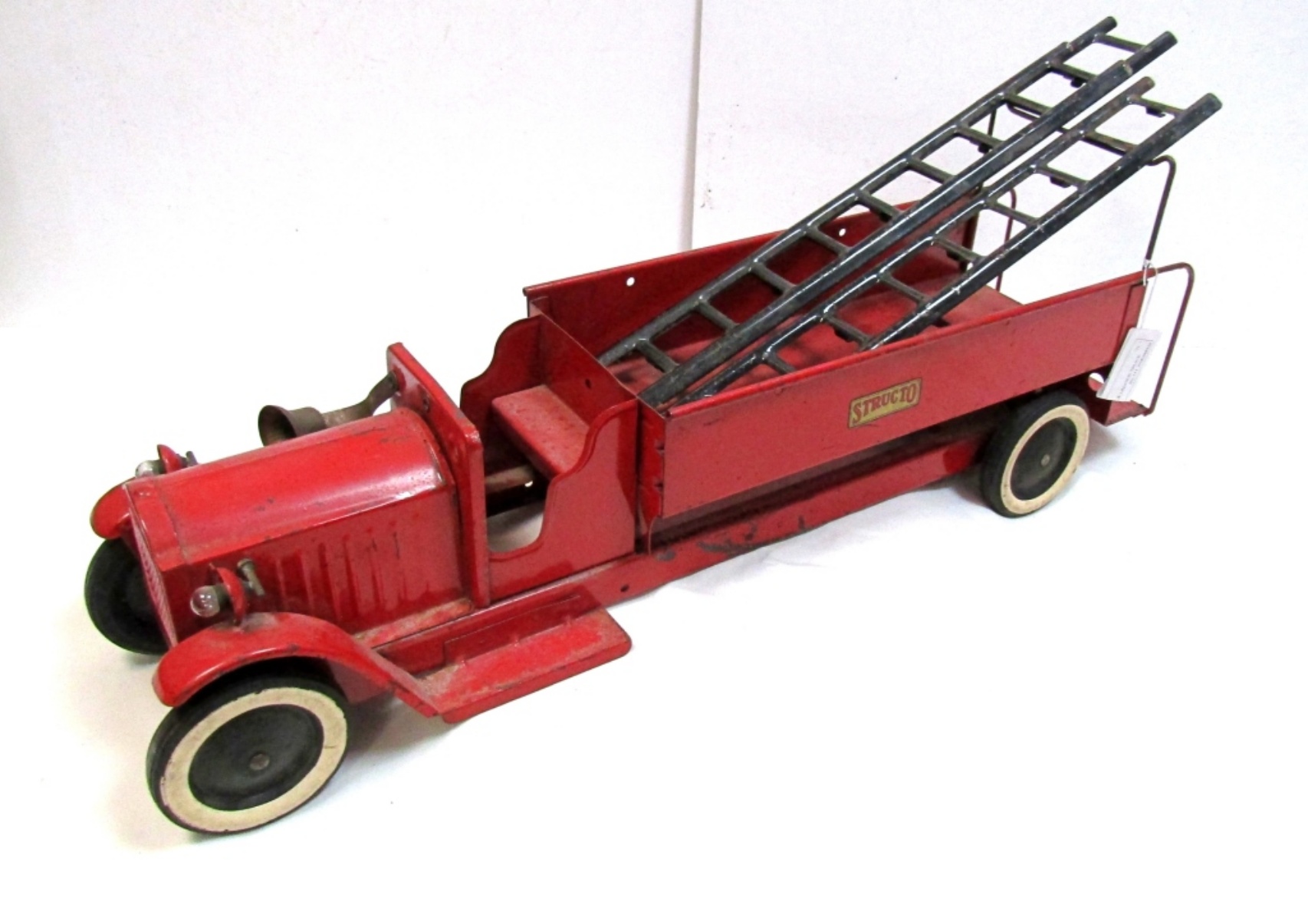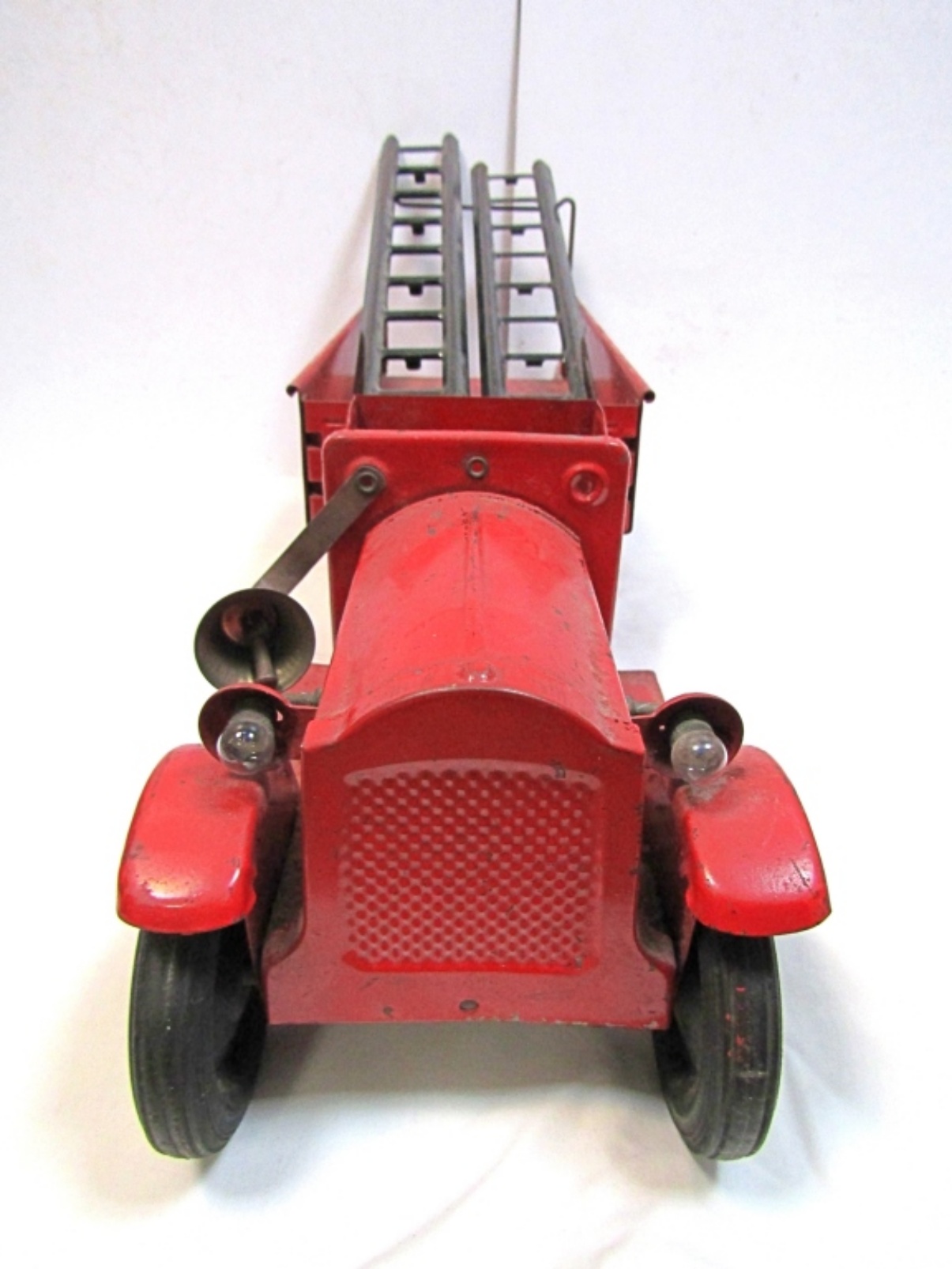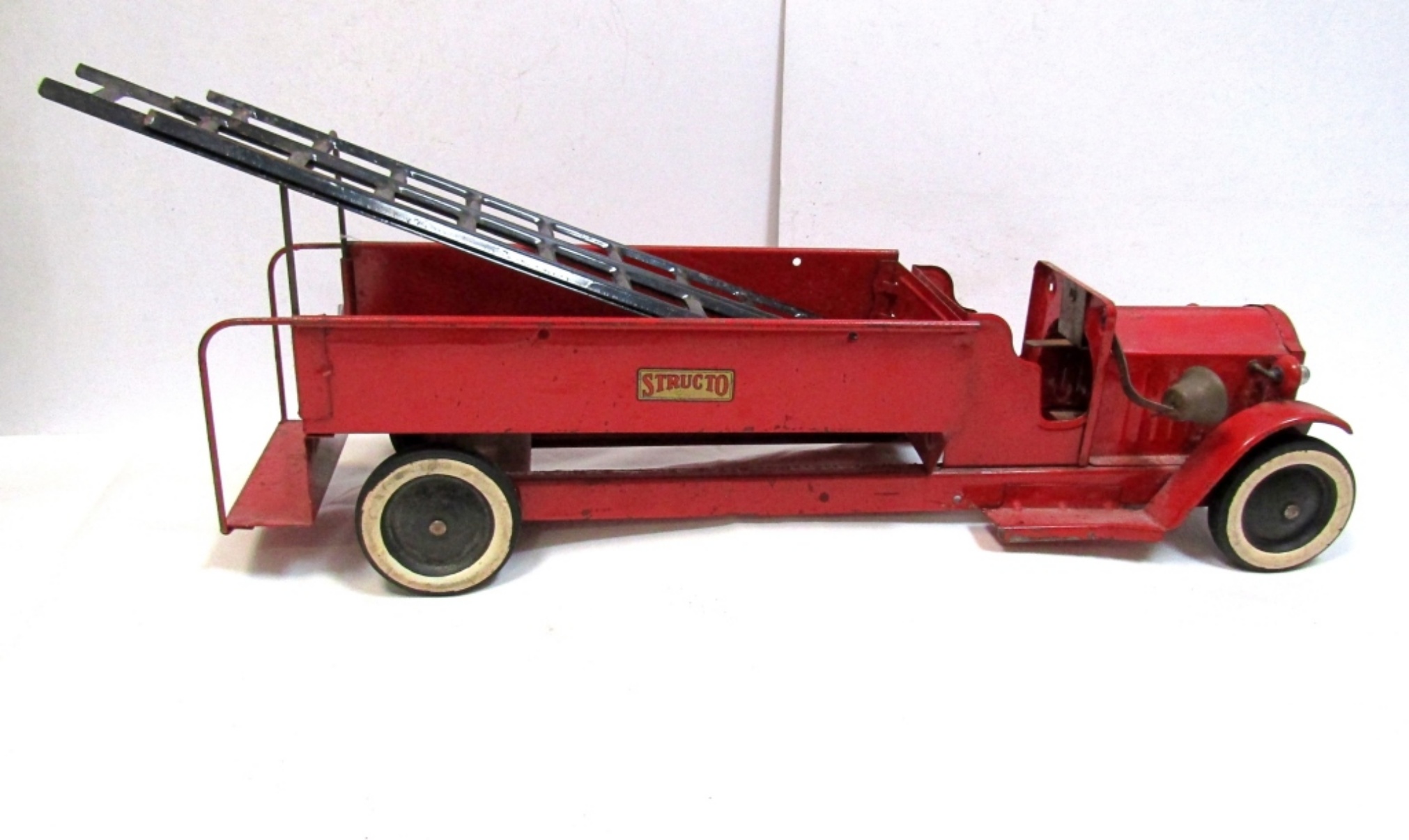 STRUCTO 1920’S PRESSED STEEL PAKCARD HOOK & LADDER TRUCK WITH LADDER, BELL & BOTH HEADLIGHTS. LIGHT RUST, DIRTY. IN GREAT SHAPE!