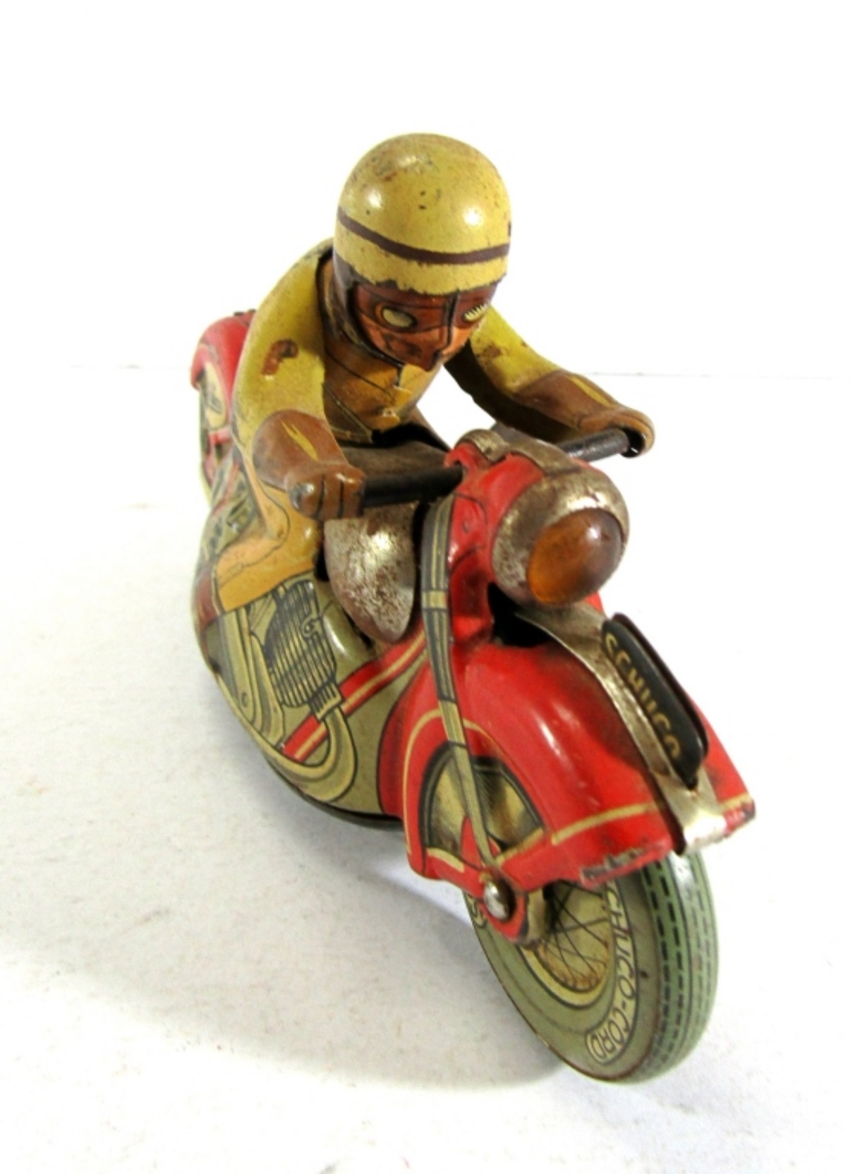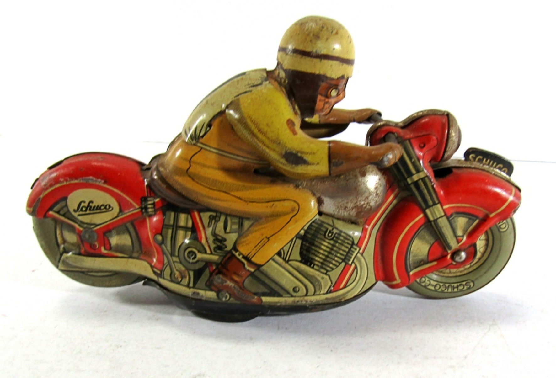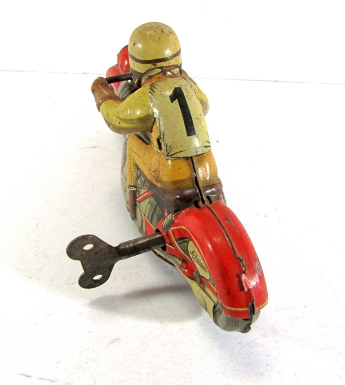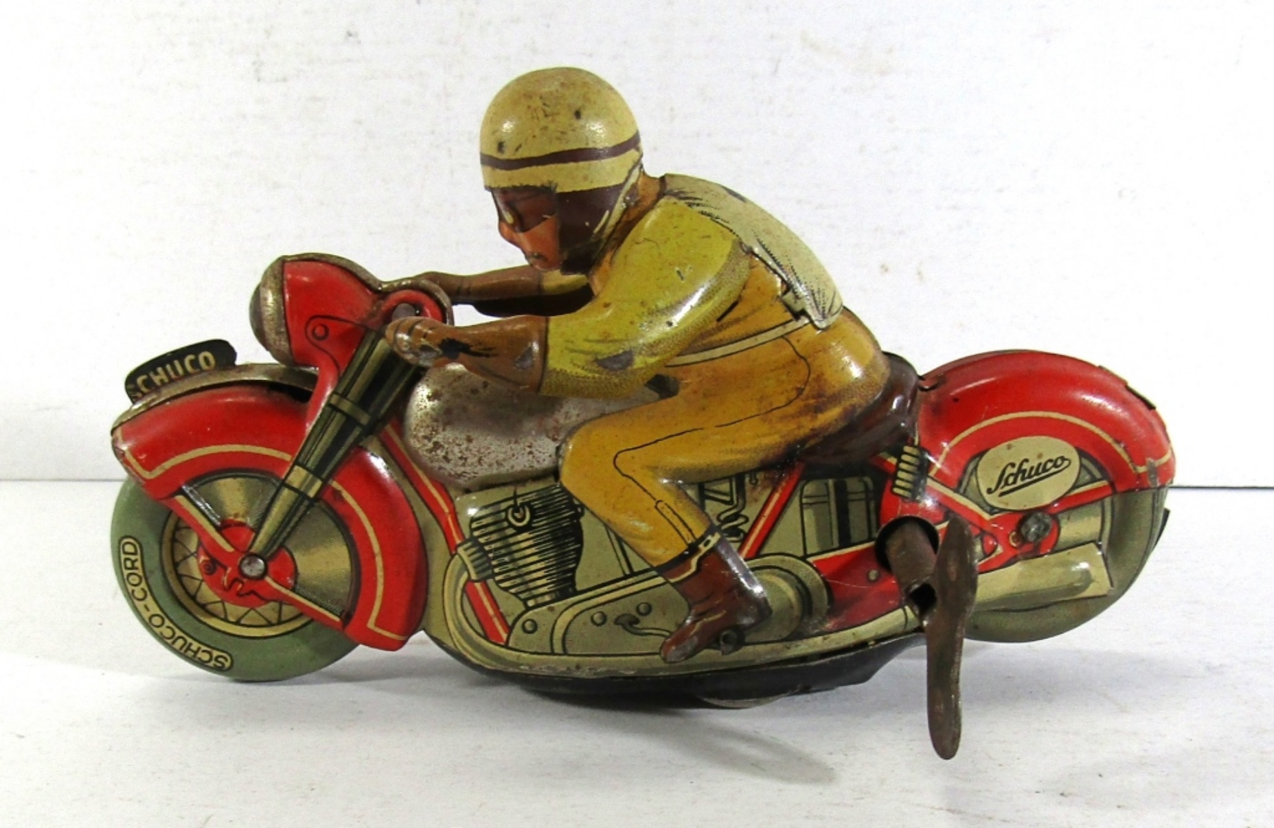 SCHUCO-CORD VINTAGE TIN WIND UP MOTORCYCLE, MIRAKOMOT 1012 WITH KEY. IT WINDS UP AND RUNS (SLOWLY). WESTERN GERMANY.
