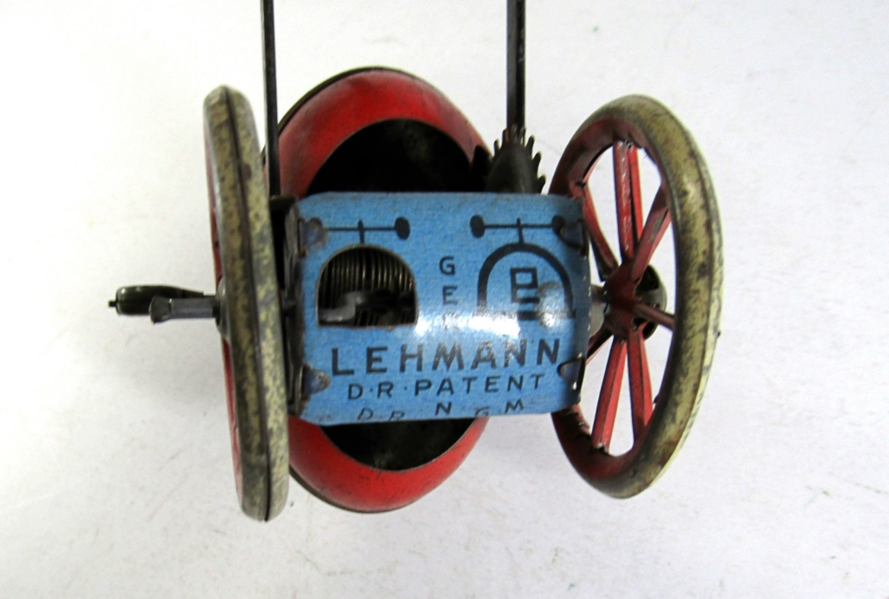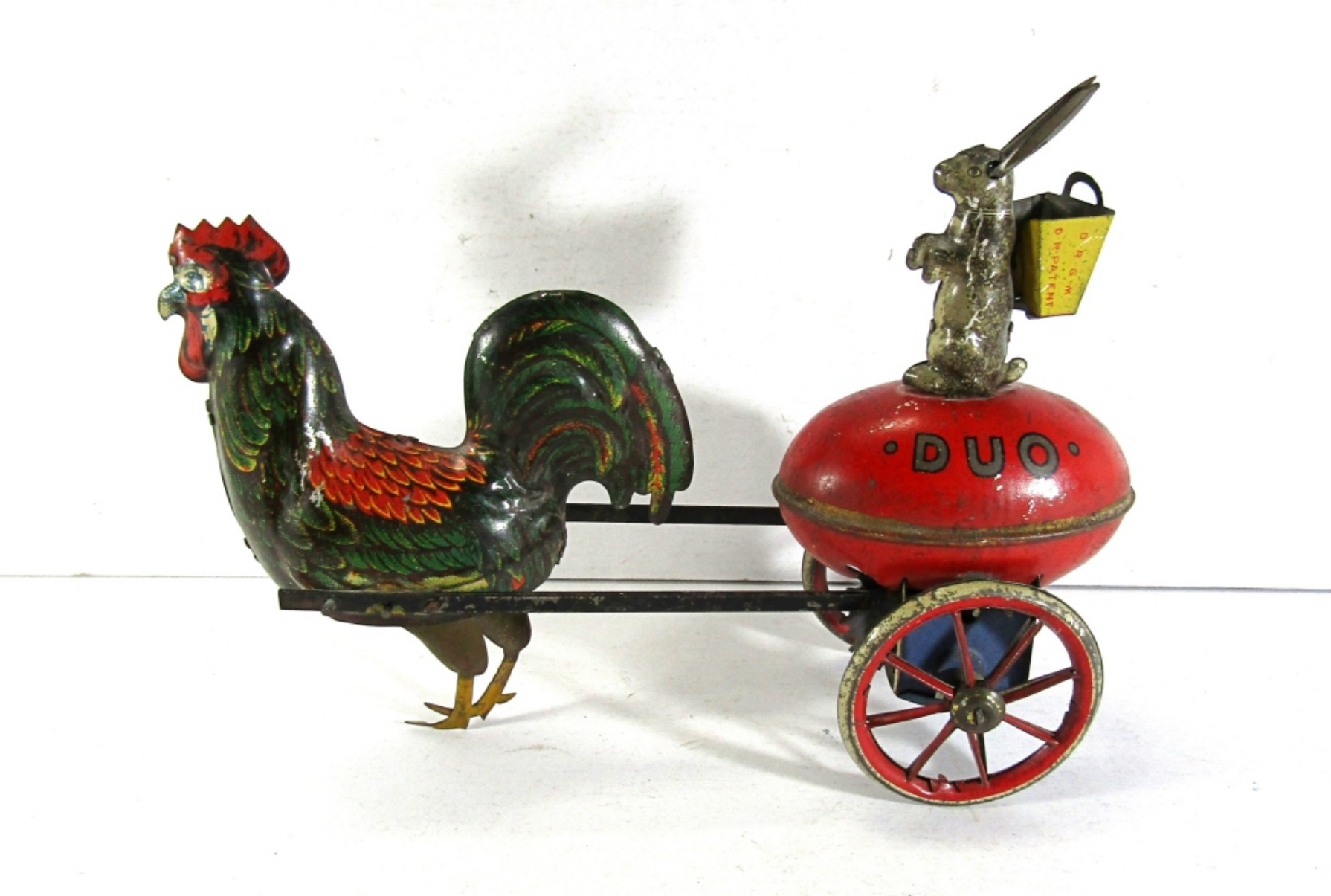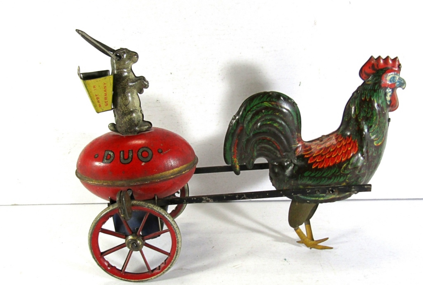 LEHMAN TIN LITHO DUO ROOSTER & RABBIT TIN WIND UP TOY CIRCA 1920s. MARKED “DUO 722” GERMANY. HAS KEY! CLOCKWORK SORT OF WORKS. GOOD CONDITION.