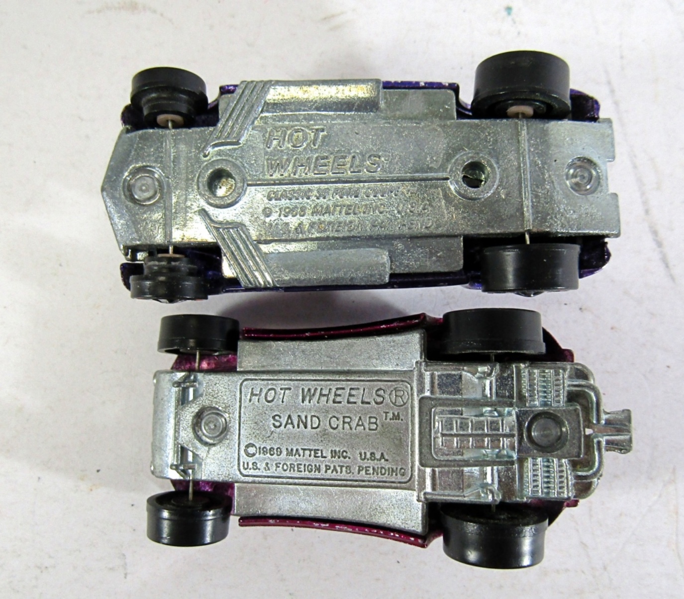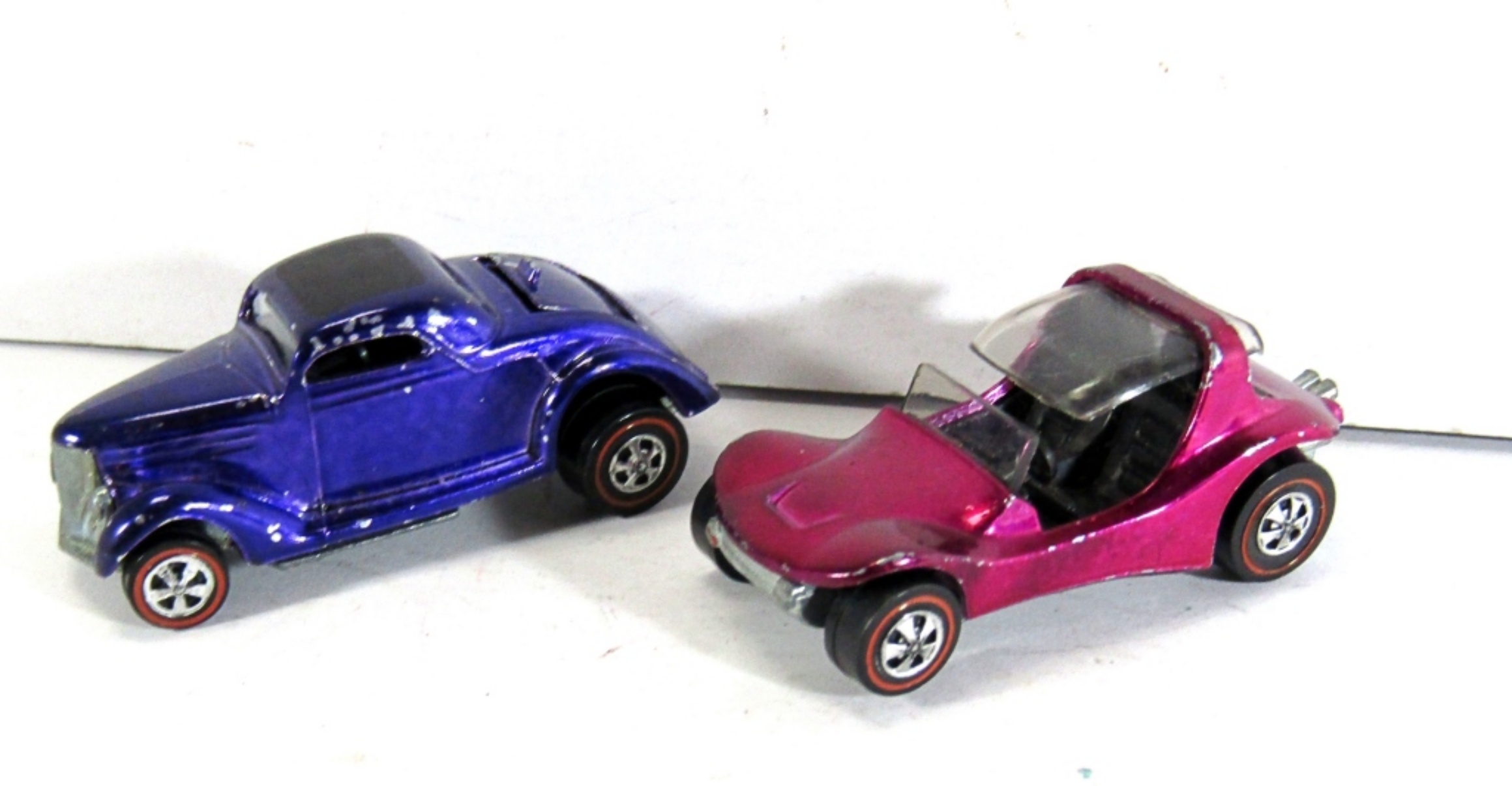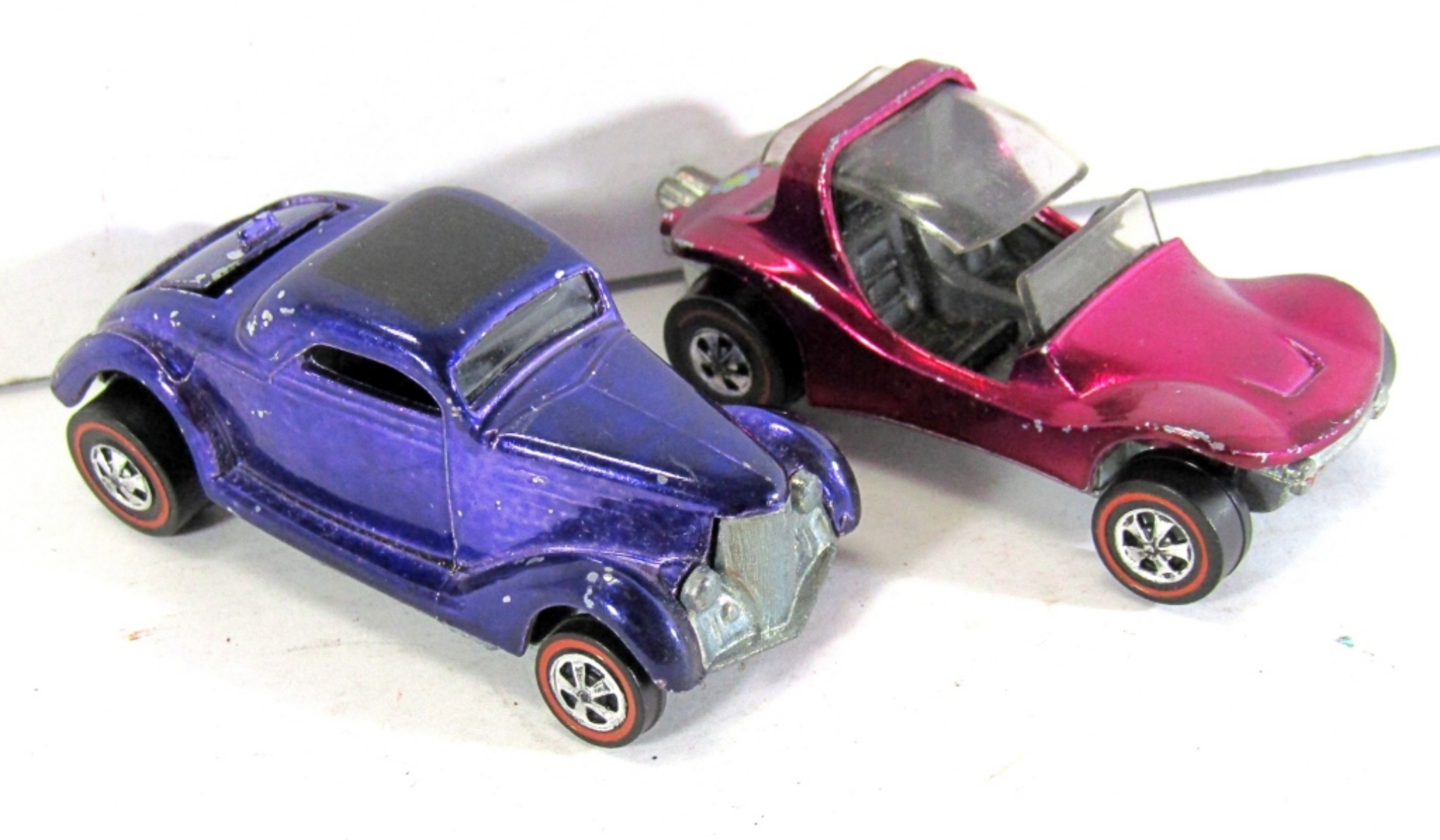 TWO RED LINE HOT WHEELS CARS. 1968 CLASSIC 36 FORD COUPE, PURPLE. 1969 SAND CRAP, MAGENTA.