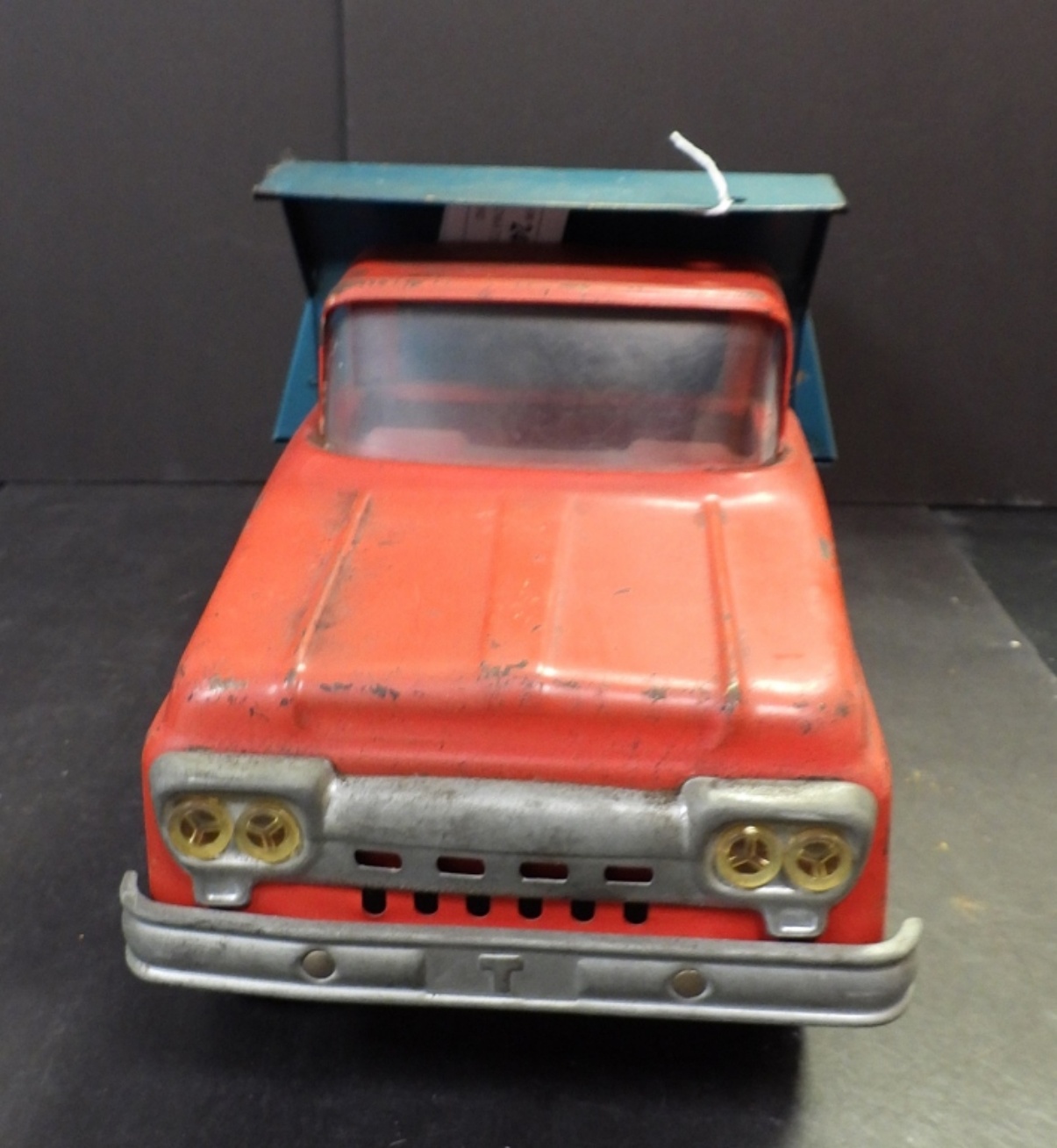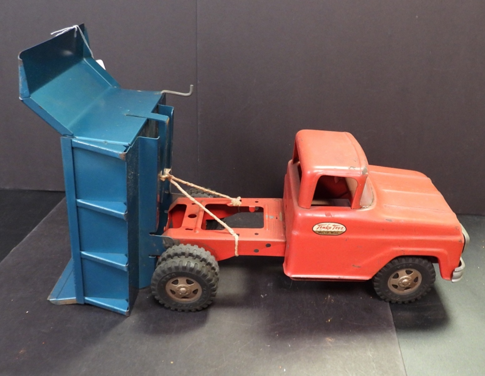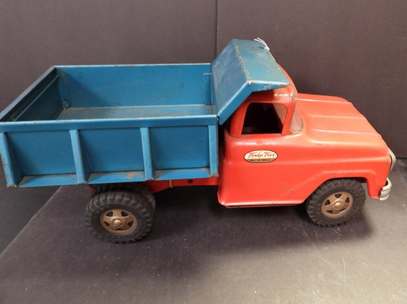 VINTAGE TONKA TOYS, MANUAL DUMP TRUCK. METAL TOY. 13″L, 7″W & 6″ TALL. SCRATCHED PAINT, SMALL AMOUNT OF RUST.