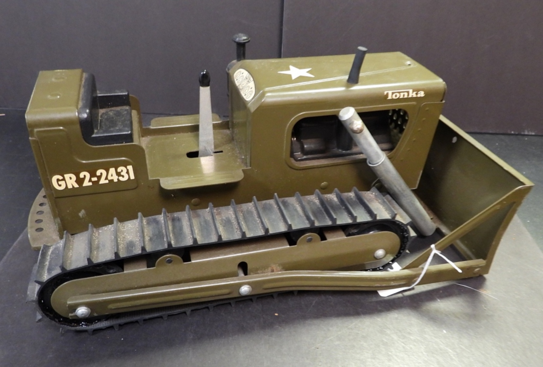 VINTAGE TONKA TOYS PRESSED STEEL ARMY BULLDOZER. 1960’s. 12″L, 7.5″W & 5.5″ TALL. GOOD CONDITION.