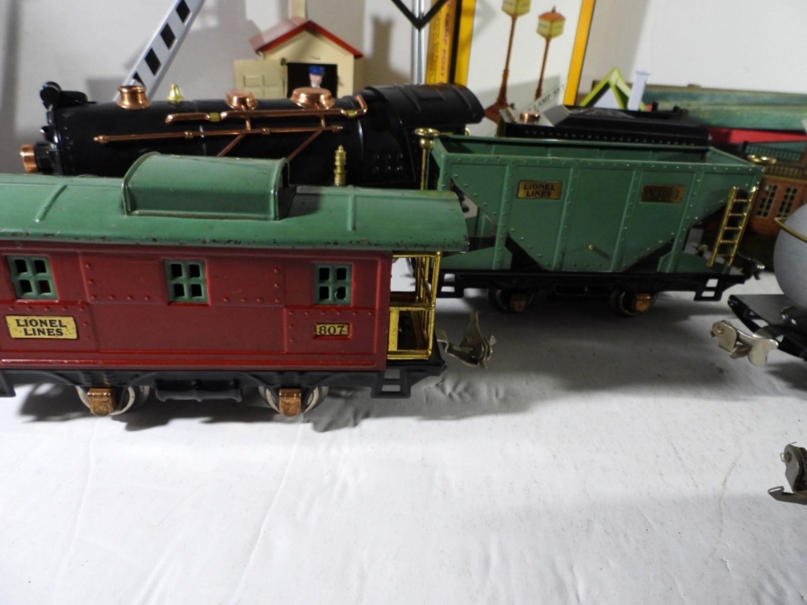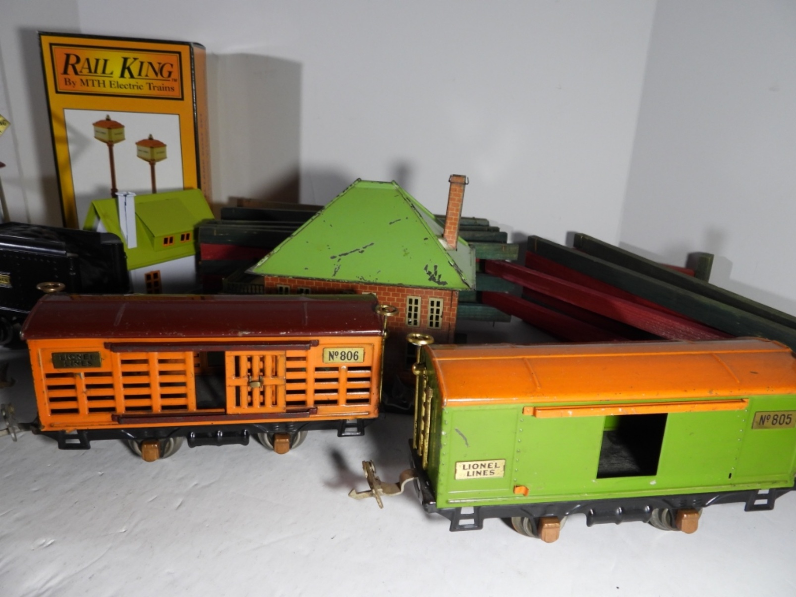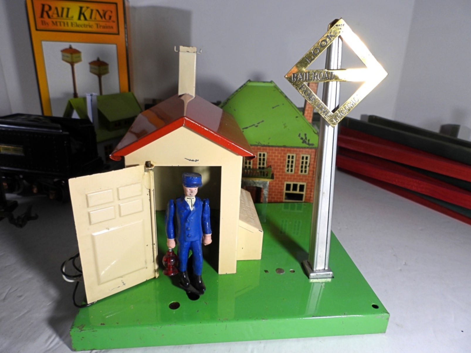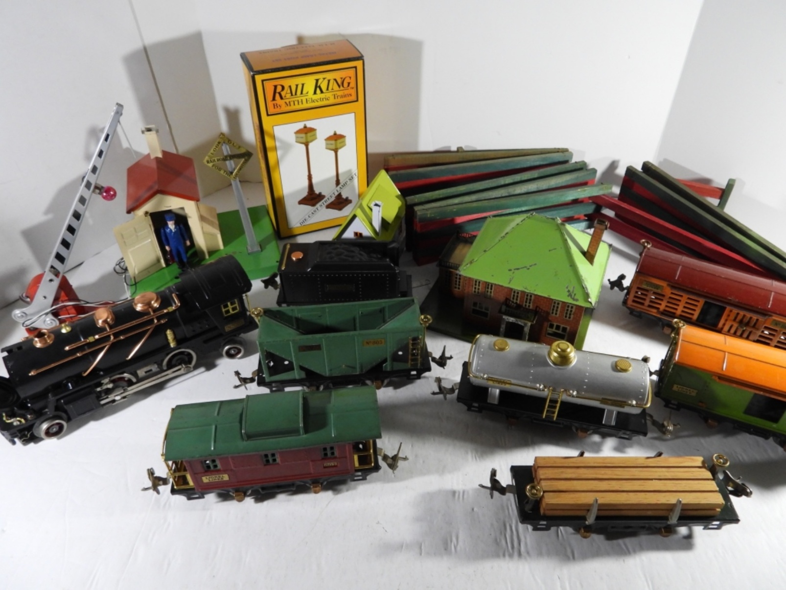 (6) CARS (1) CABOOSE, (3) TIN STATIONS / BUILDINGS, CROSSING GATE, WOOD FENCE & MORE – VERY NICE CONDITION but UINTESTED