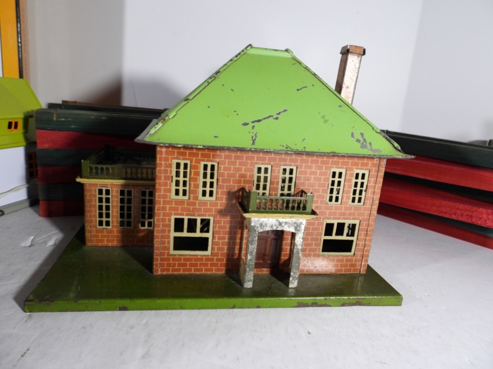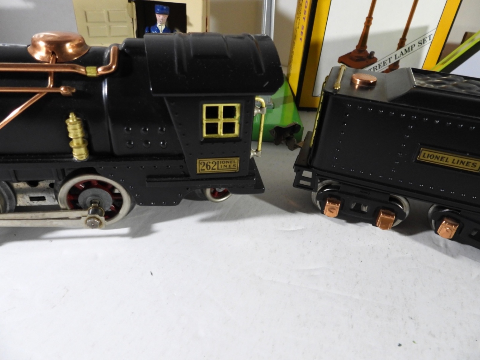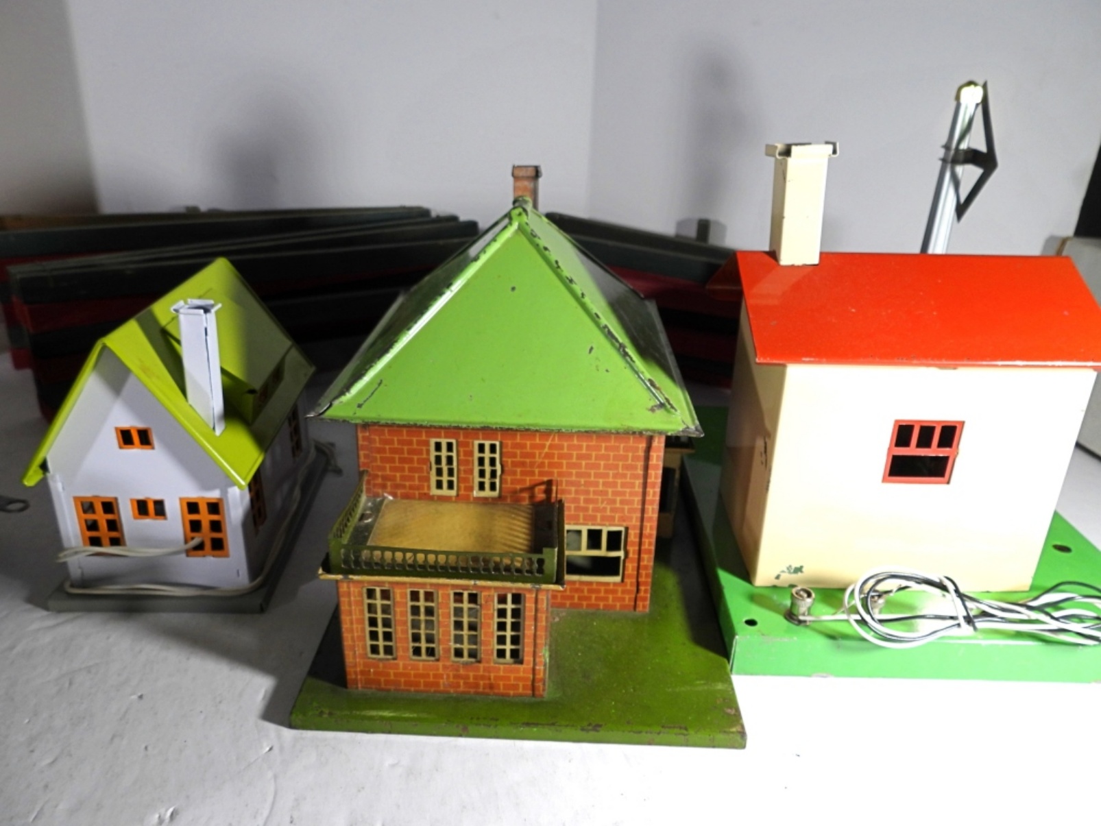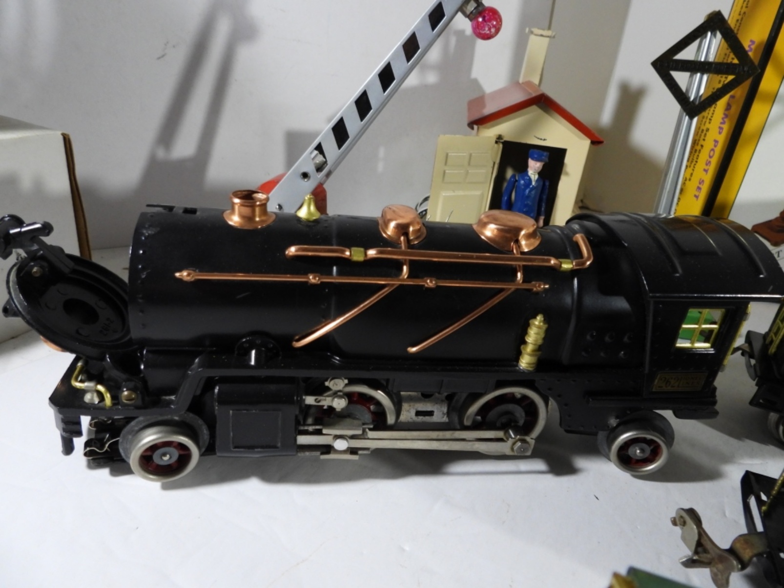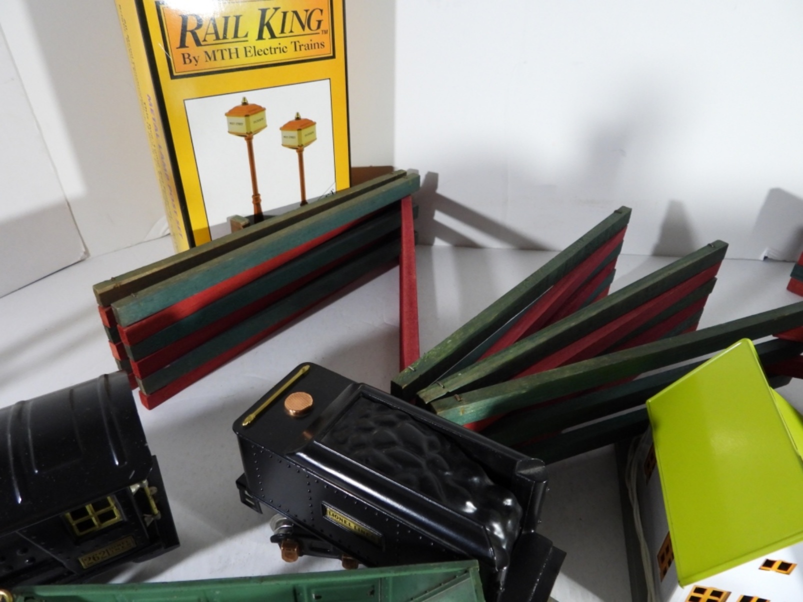 (6) CARS (1) CABOOSE, (3) TIN STATIONS / BUILDINGS, CROSSING GATE, WOOD FENCE & MORE – VERY NICE CONDITION but UINTESTED