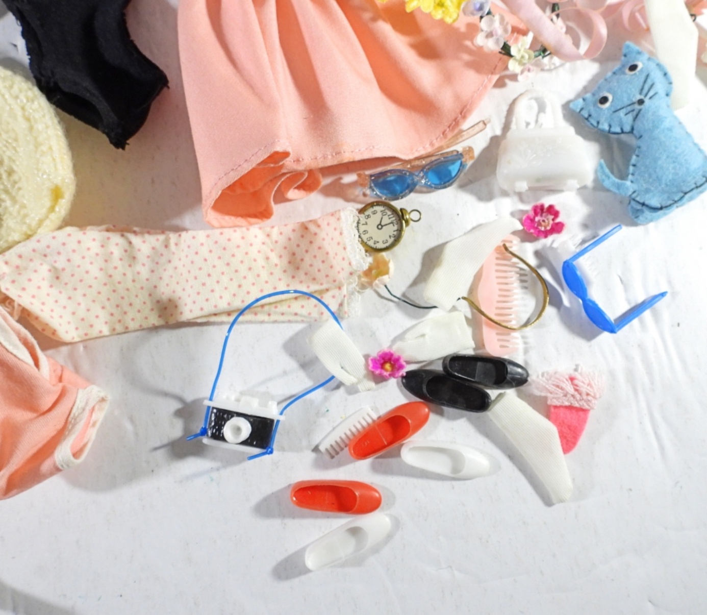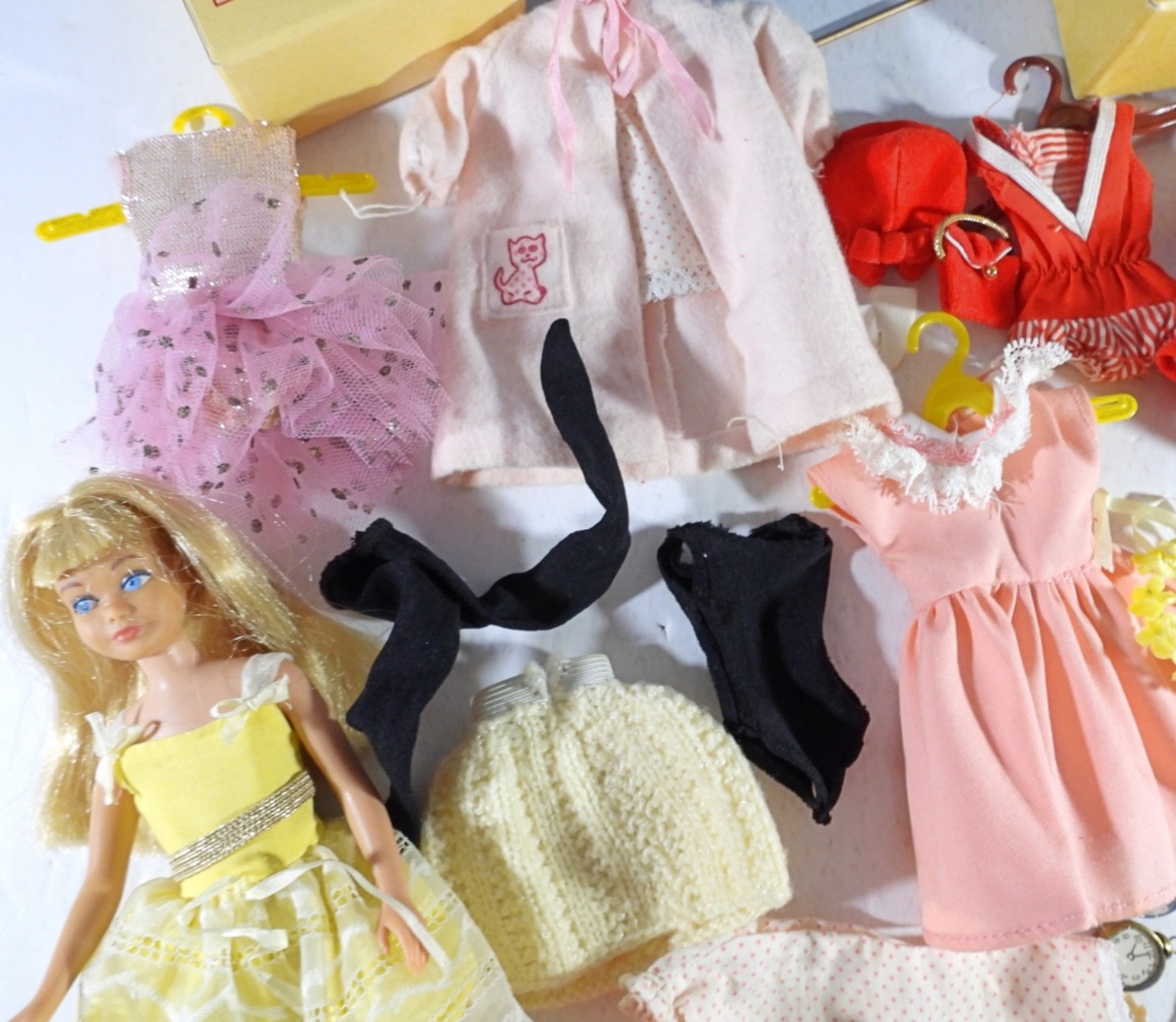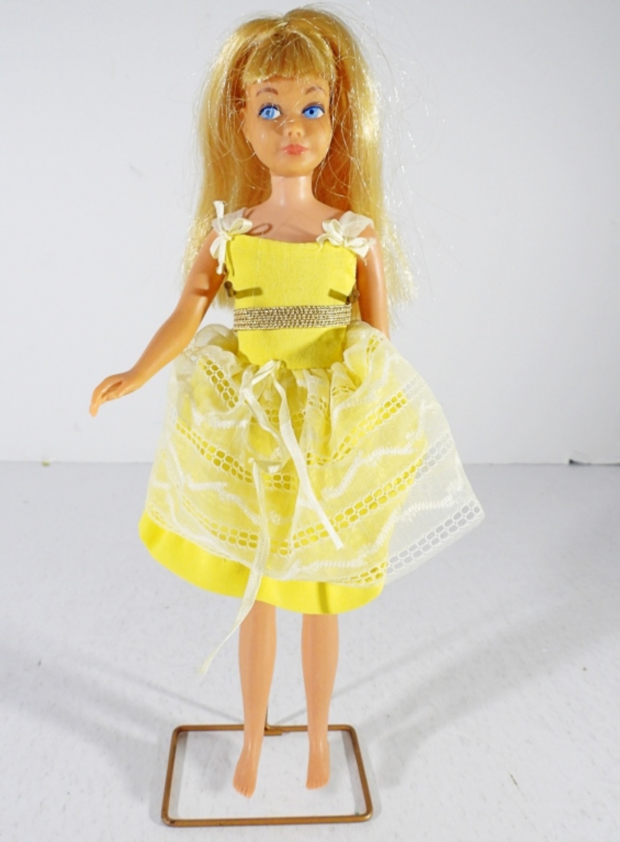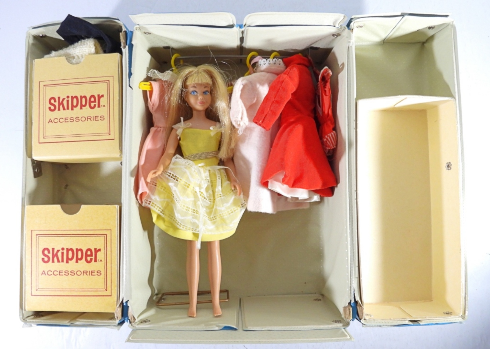 SKIPPER DOLL BLONDE, STRAIGHT LEG, TRADEMARK ON THE BUTT, DOLL IN GOOD CONDITION, SKIPPER CARRYING CASE 1964, IN GOOD CONDITION, WITH 5 OUTFITS AND SOME ACCESSORIES AND A PEDESTAL