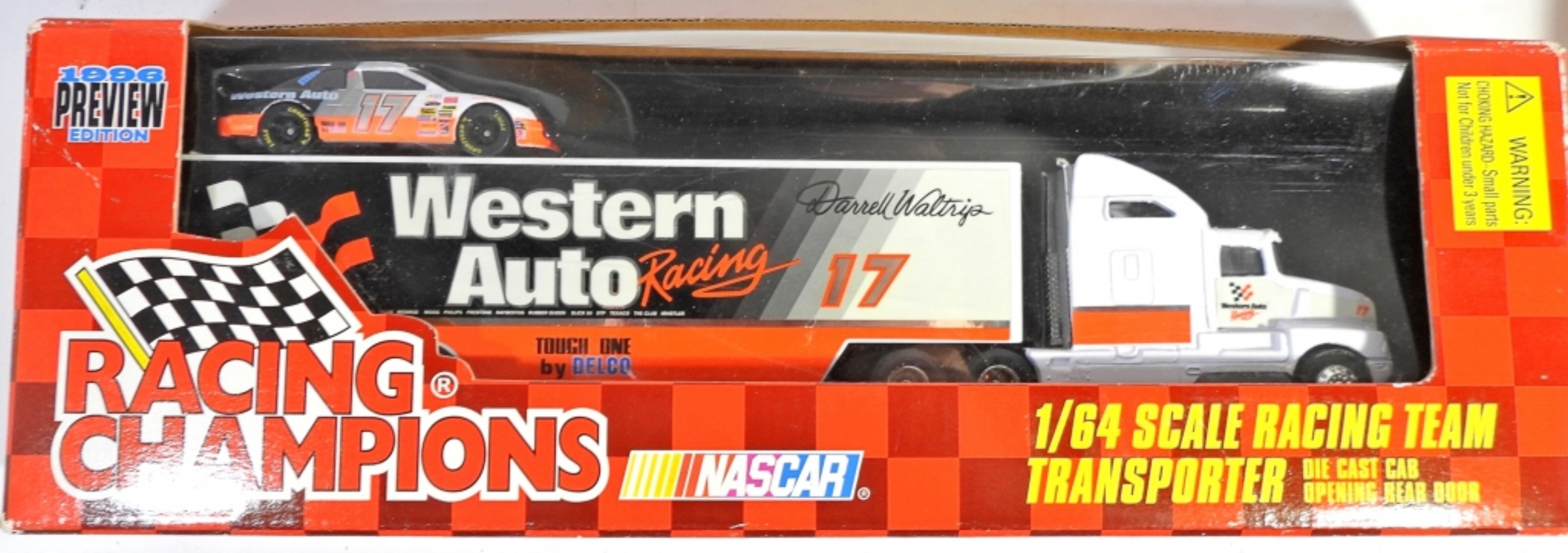 1 1/64 SCALE RACING TEAM WESTER AUTO #17 TRANSPORTER DIE CAST, 1 1/24 SCALE DIE CAST #24 STOCK CAR REPLICA, 1 1/64 SCALE FUNNY MCDONALDS CAR