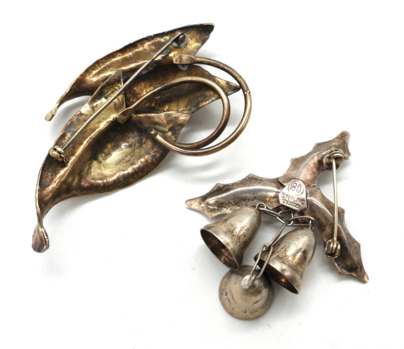 NAPIER STERLING LEAF BROOCH, 3.5″x2″. STERLING TAXCO HOLLY BROOCH WITH BELLS, 2.5″x2″. 24.6 DWT