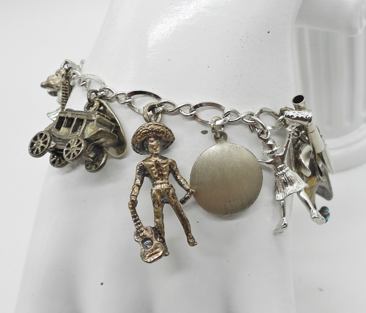 VINTAGE STERLING CHARM BRACELET WITH 16 CHARMS. 7″ 38.6 DWT