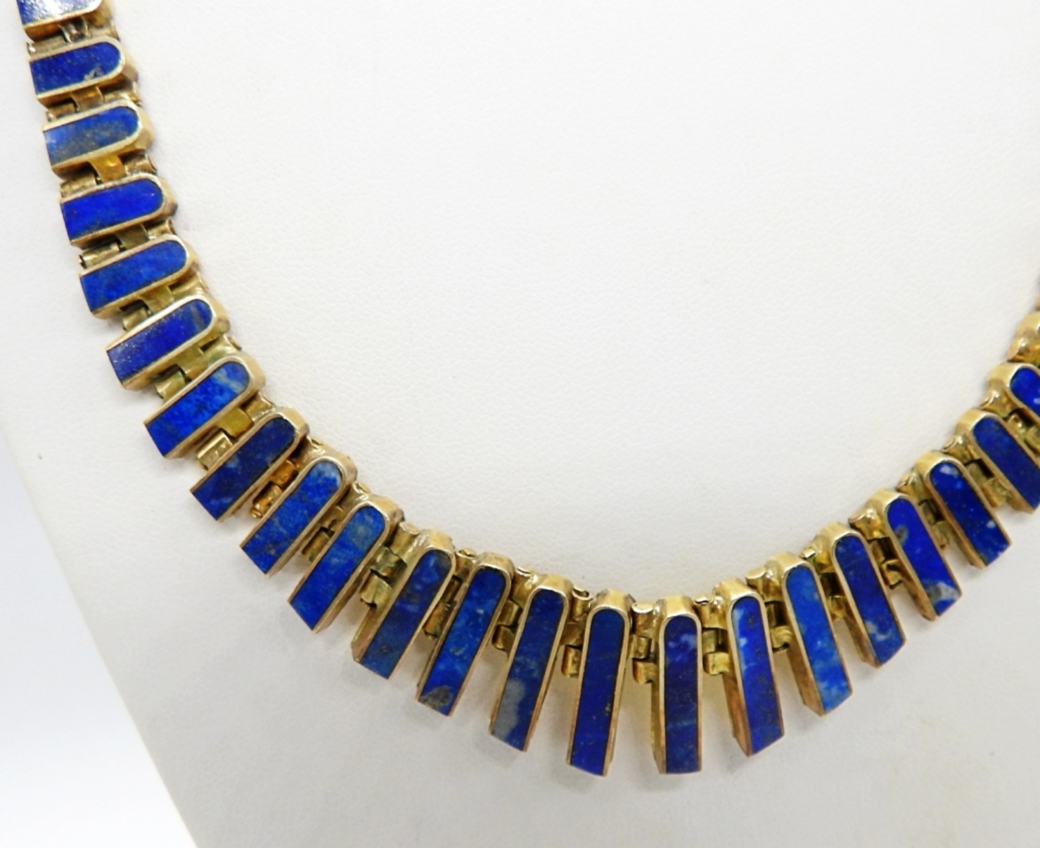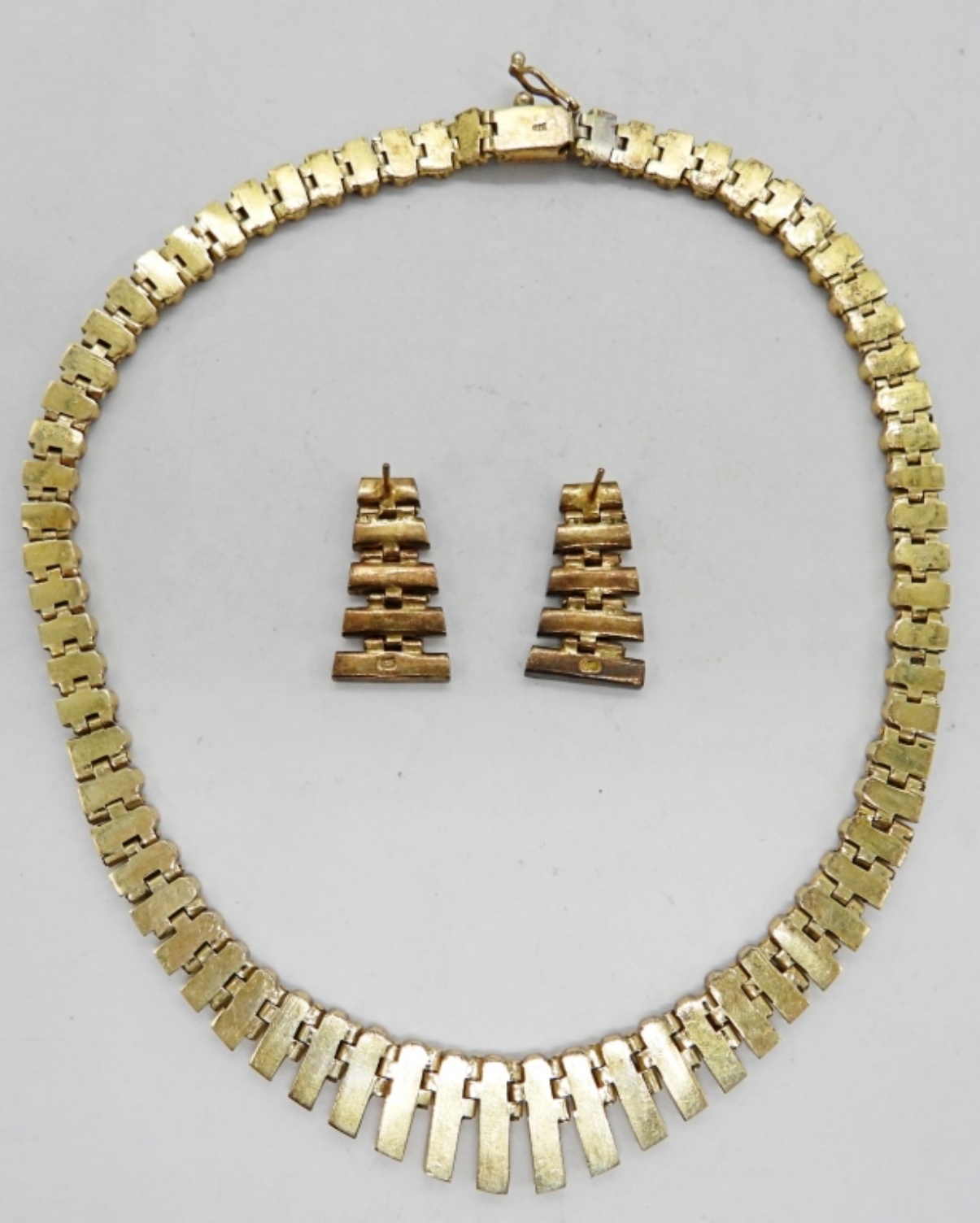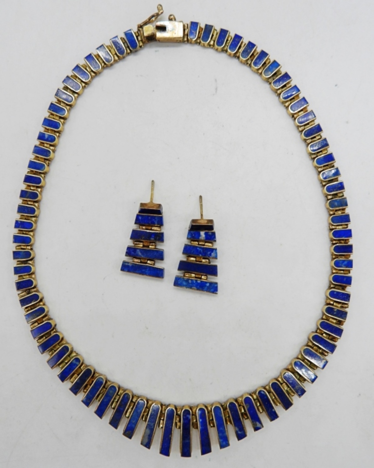 36DWT, GOLD TONE STERLING 16″ LONG FOR NECKLACE, MATCHING DANGLED EARRING PIERCED, ALL STAMPED 925, WITH BLUE GEMSTONE INLAY