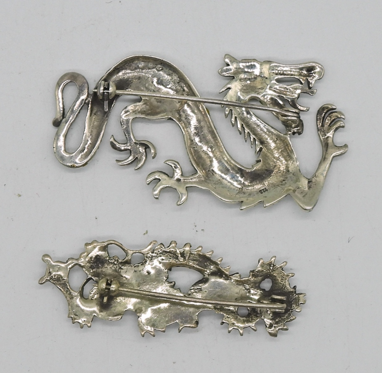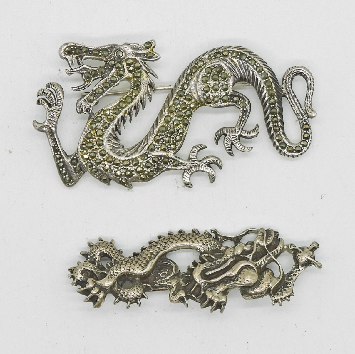 TWO STERLING VINTAGE DRAGON PINS, ONE WITH MARCASITE. 16.3 DWT