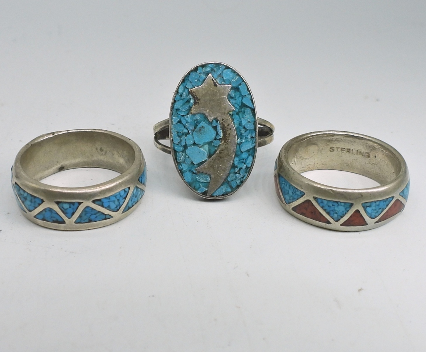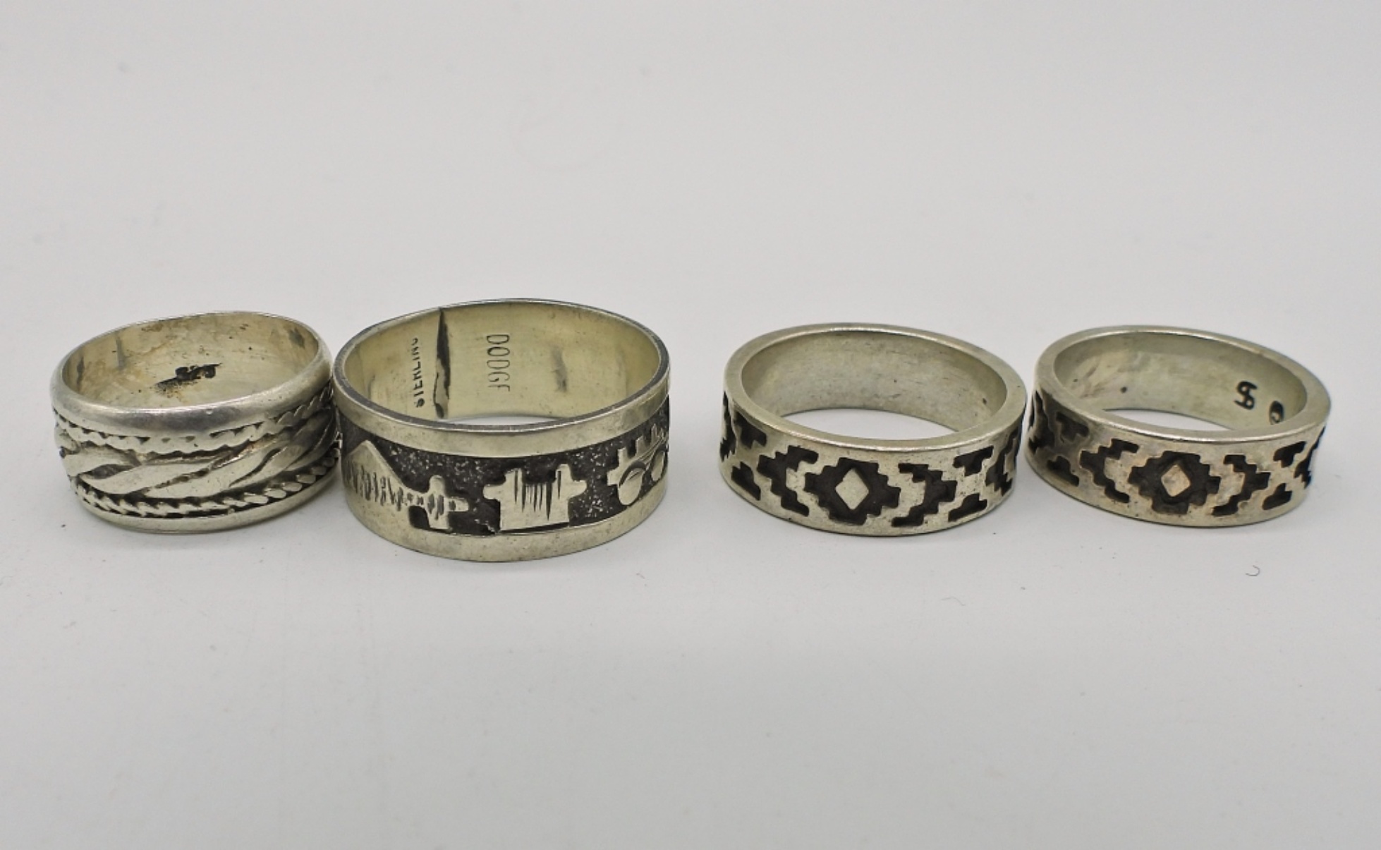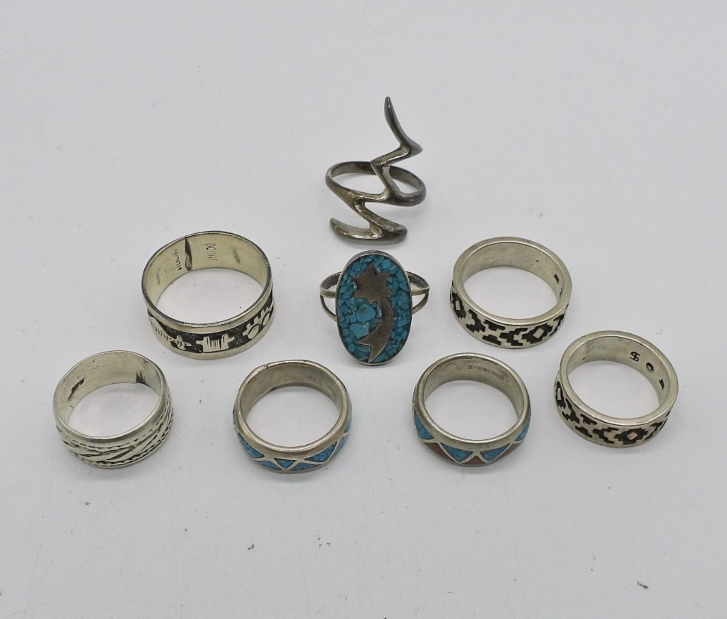 8 STERLING RINGS IN THE SOUTHWEST STYLE. SIZES 4, 4.5, 5, 6, 7, 9.5. 19.3 DWT