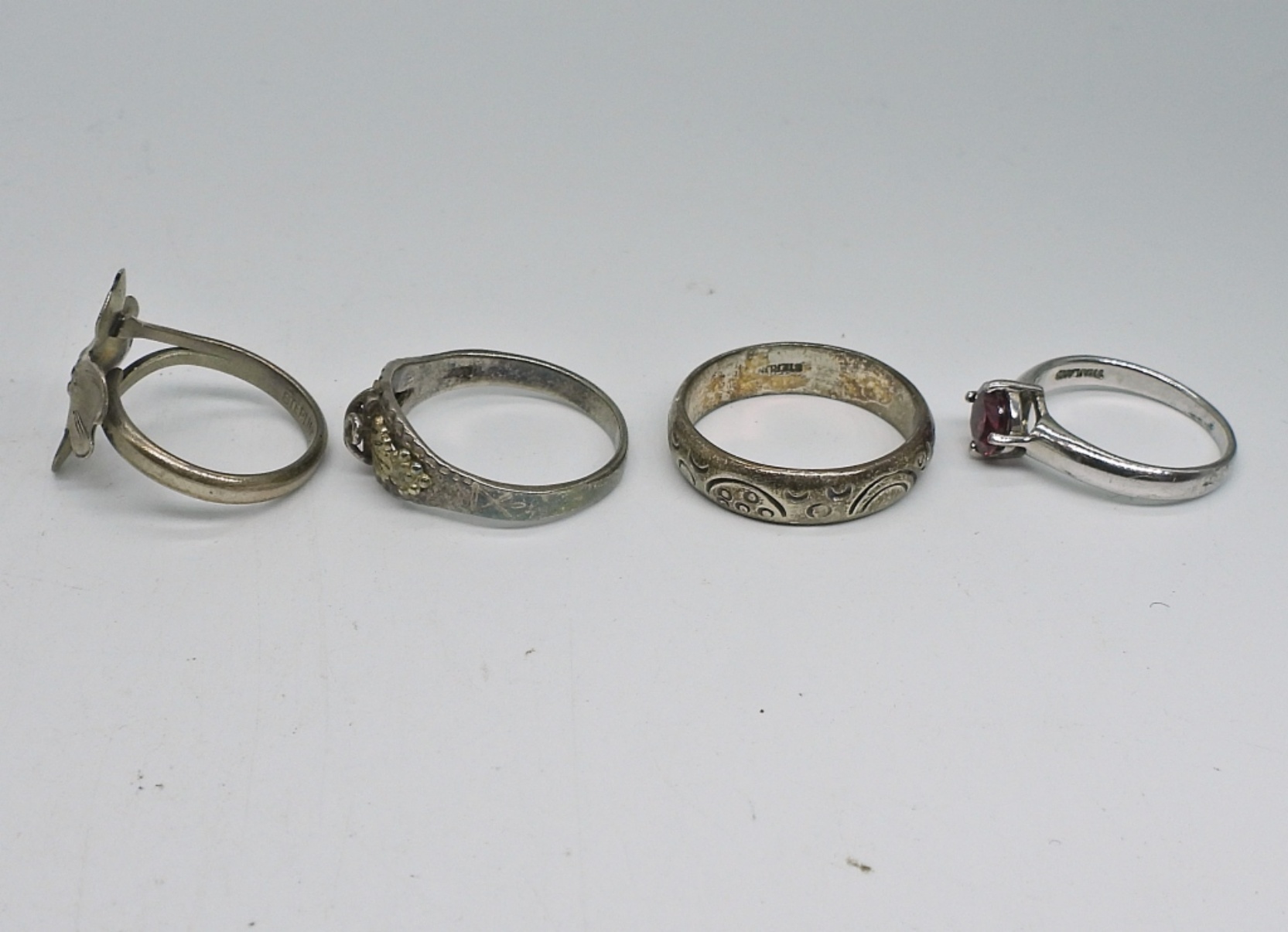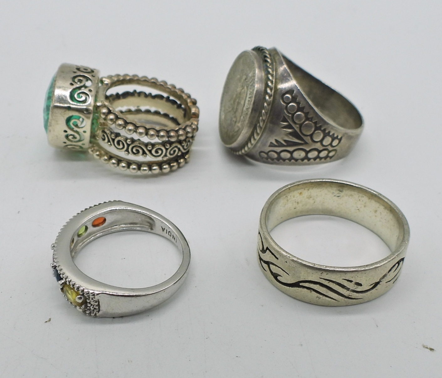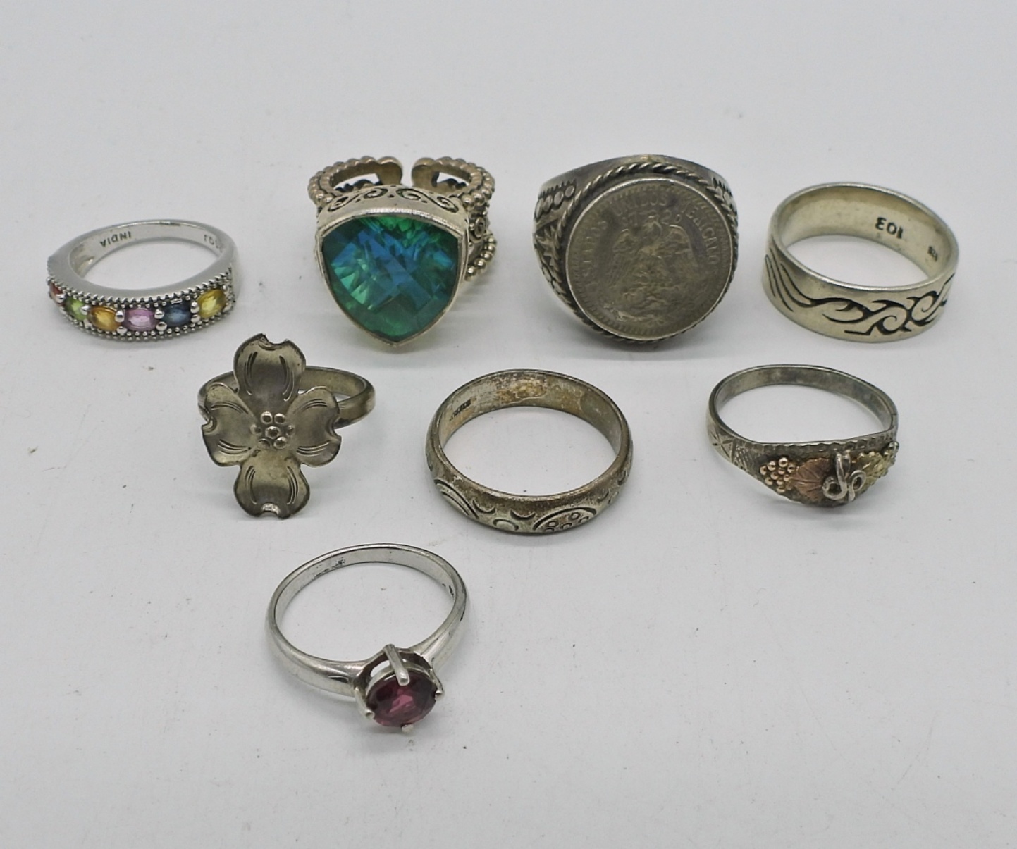 8 STERLING LADIES RINGS, SOME WITH GEMSTONES, SOME BANDS. SIZES 5,6, 7, 8, 9, 10,12. 32.6 DWT