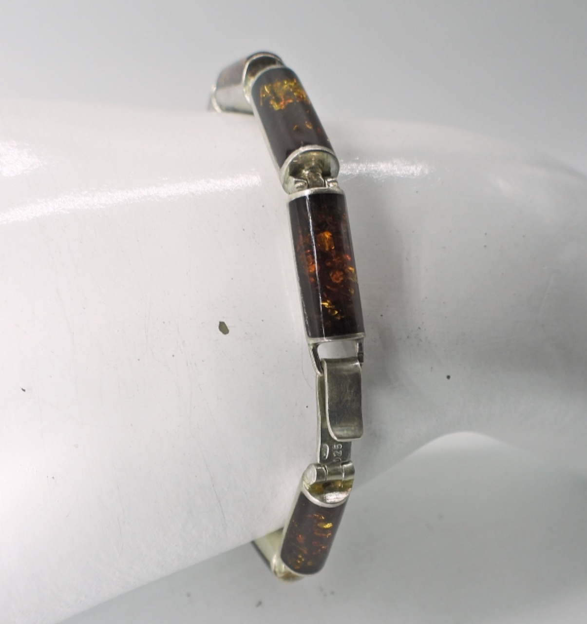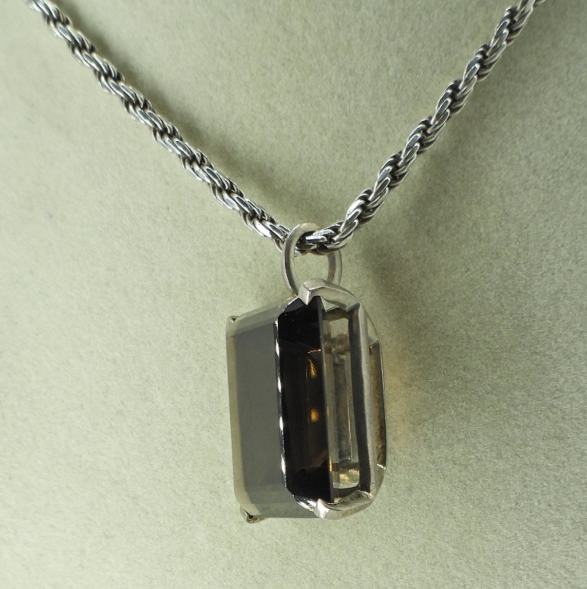 LARGE SMOKEY QUARTZ GEMSTONE (1″) WITH A 22″ STERLING CHAIN. VINTAGE STERLING AMBER BRACELET, 7″. 33.8 DWT