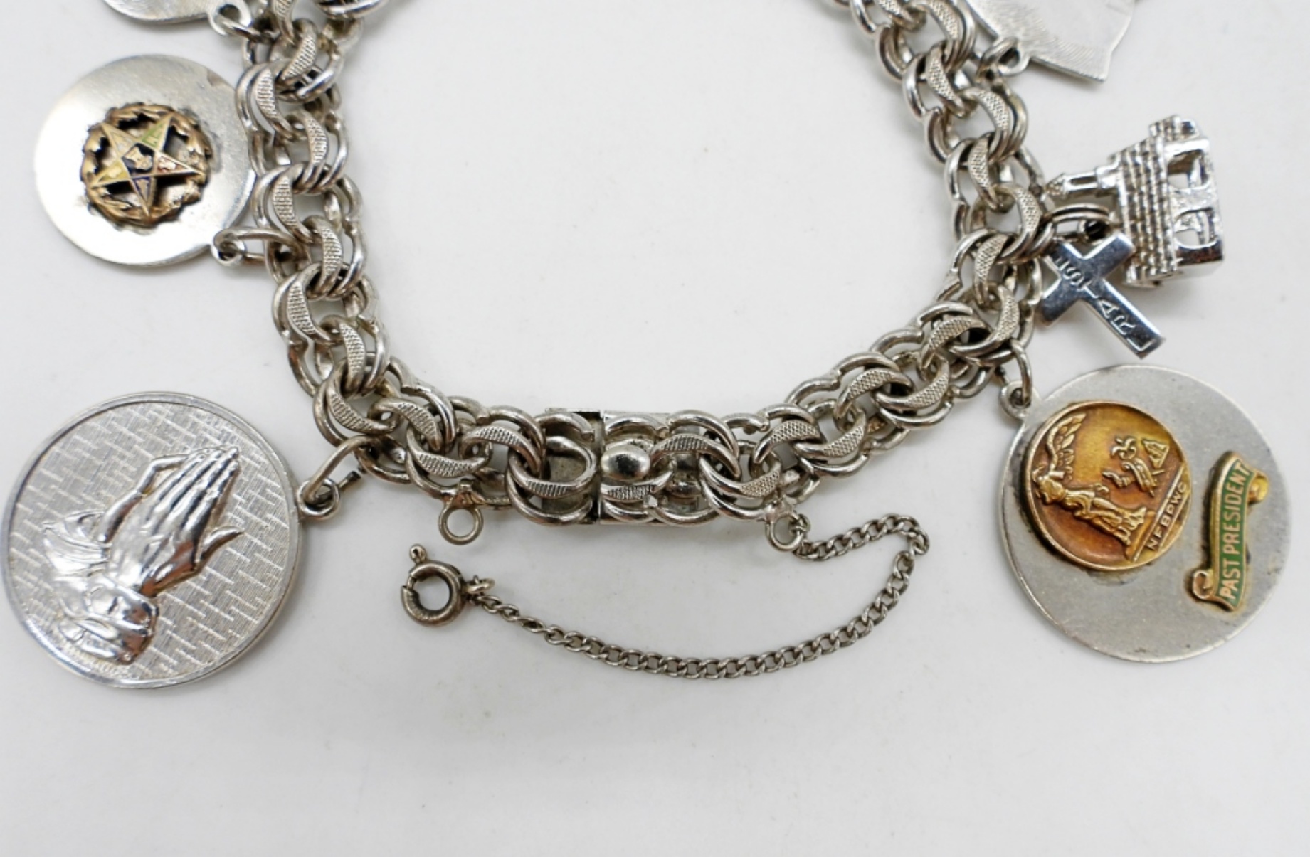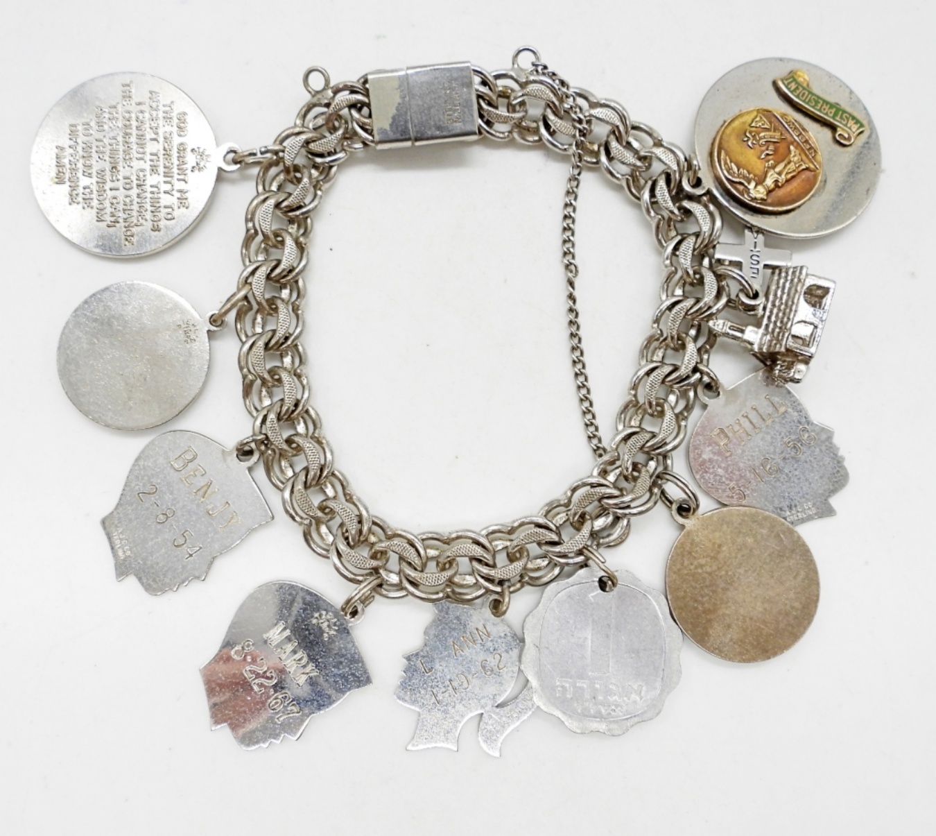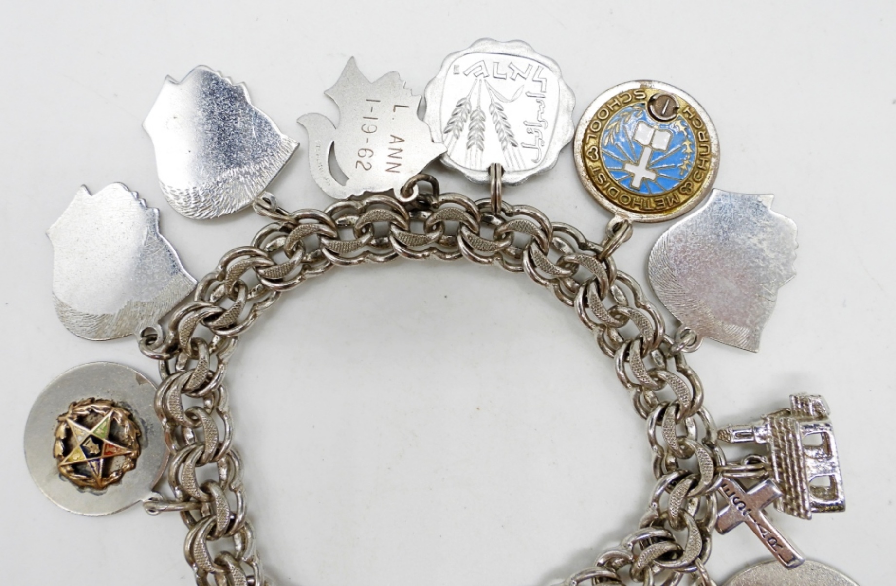 VINTAGE STERLING CHARM BRACELET, 7″ WITH 10 CHARMS. 34 DWT