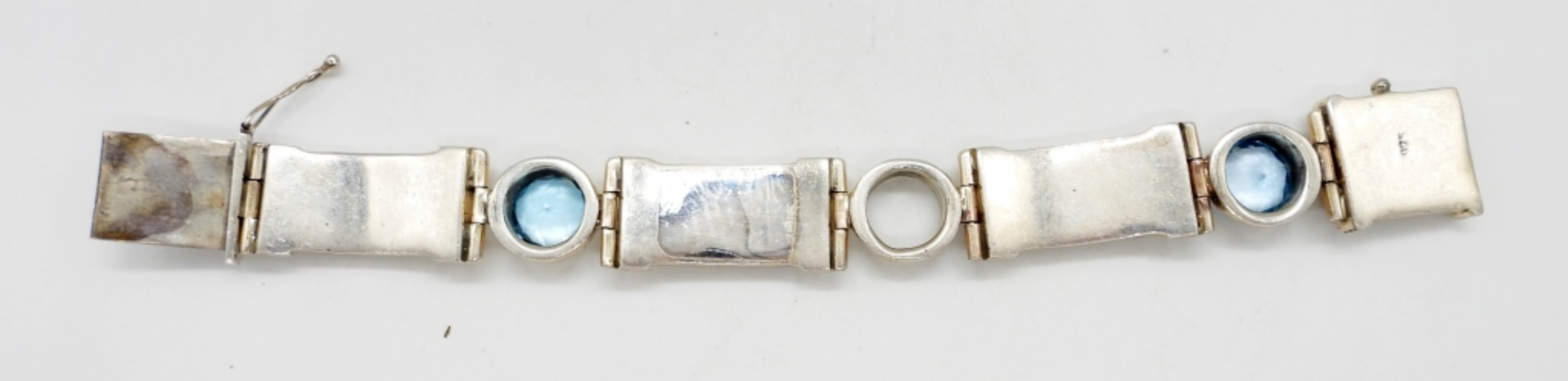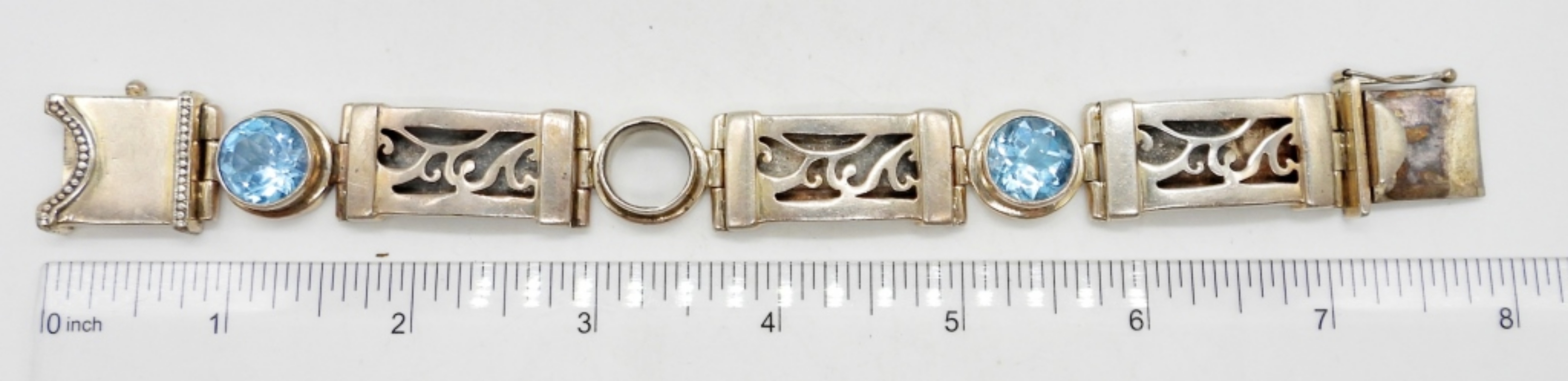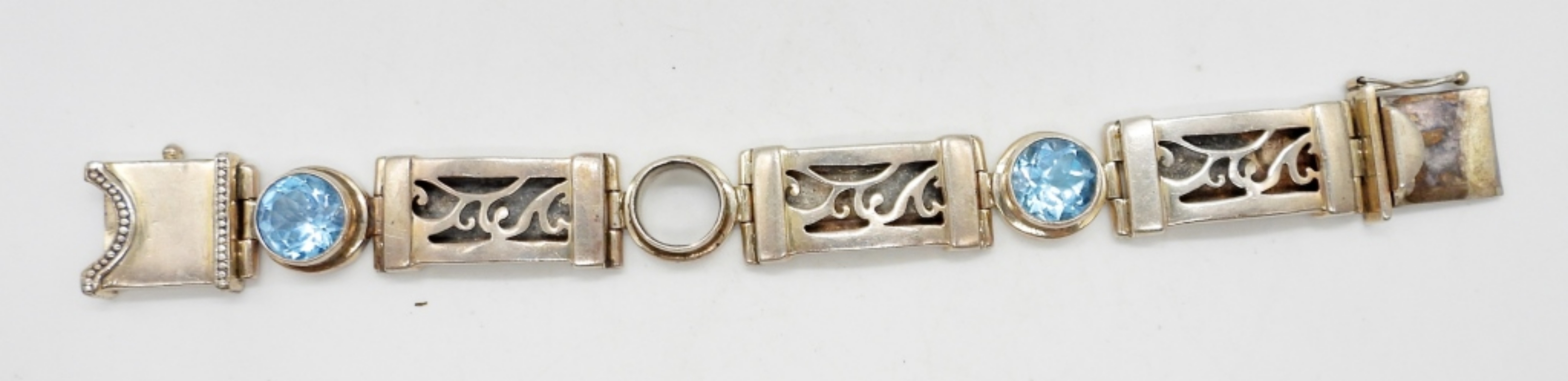 7″ LONG STERLING BRACELET WITH 3 BLUE TOPAZ GEMSTONES (MISSING 1). 3/4″ WIDE. MARKED 925. 40 DWT