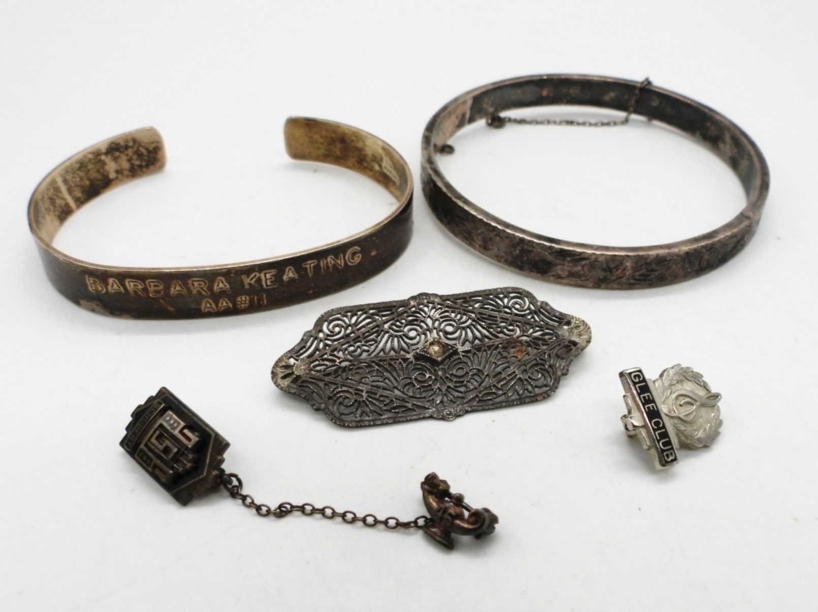 TWO VINTAGE STERLING BRACELETS. 3 VINTAGE STERLING PINS. 22.5 DWT