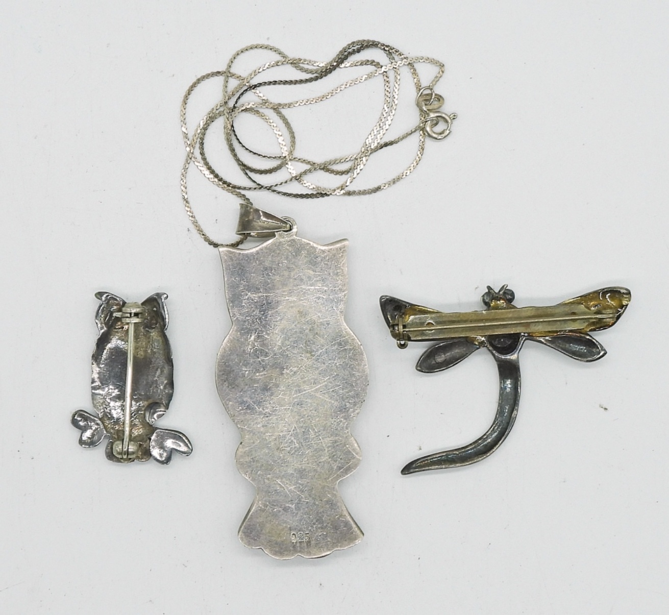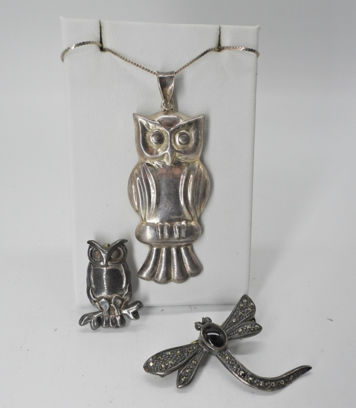 VINTAGE STERLING OWL PENDANT (2.5″L) ON 18″ STERLING CHAIN. SMALL STERLING OWL PIN & STERLING DRAGONFLY PIN. 14.9 DWT