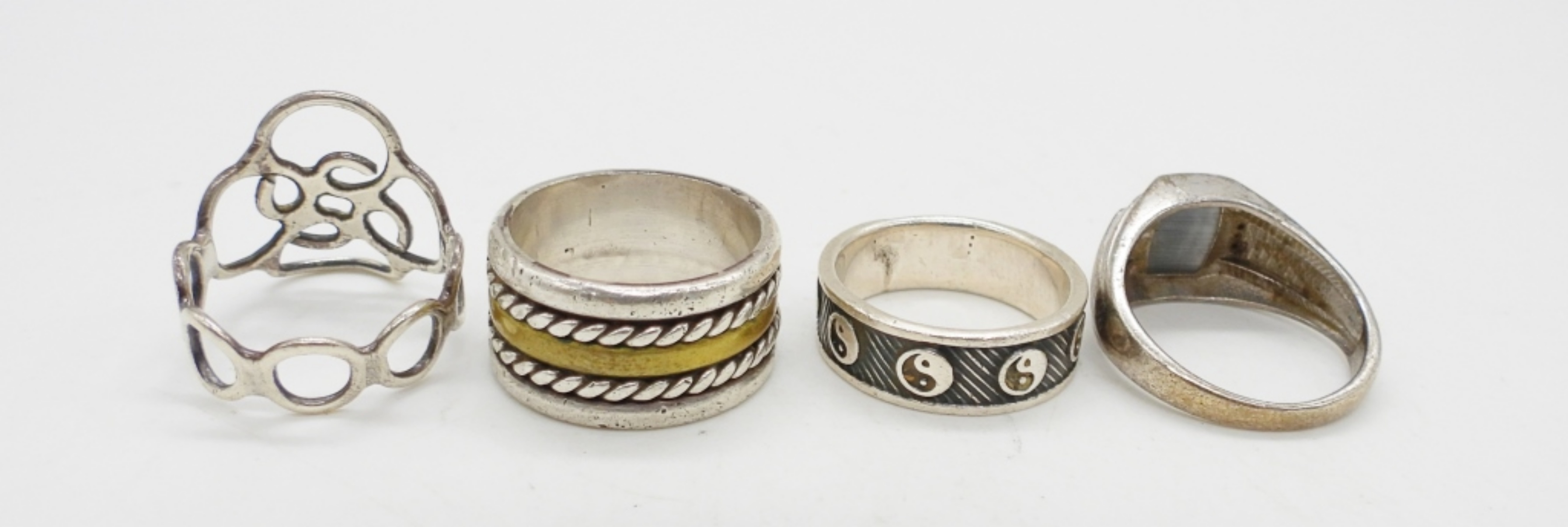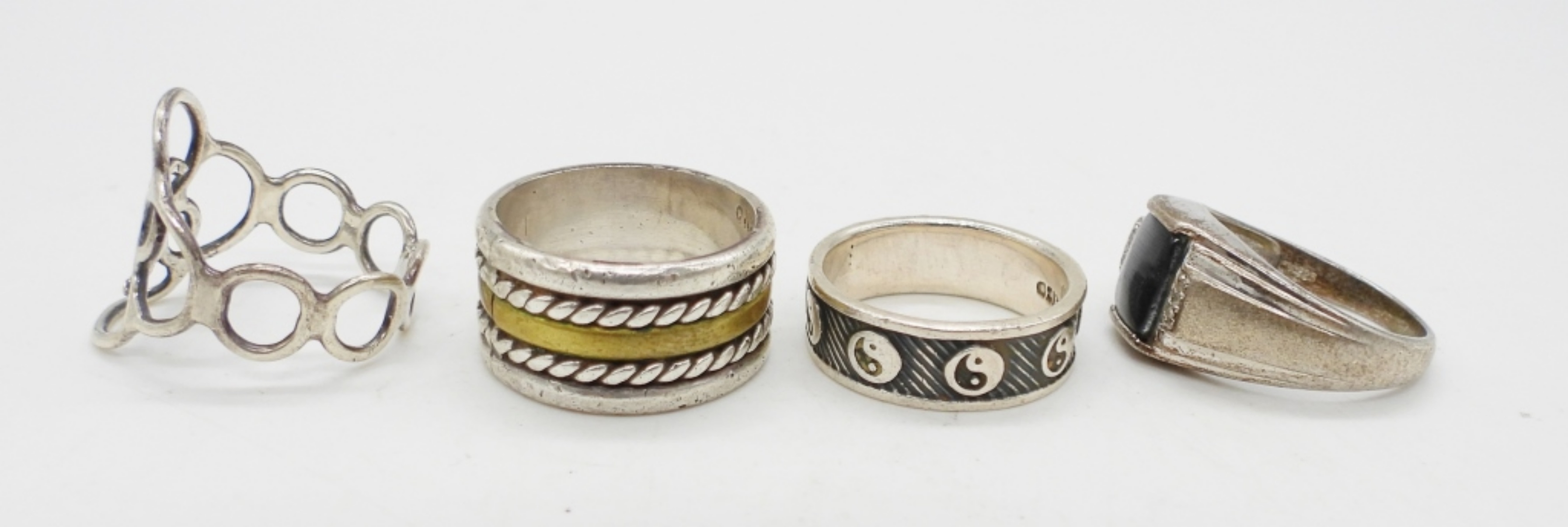 4 STERLING RINGS; CATS EYE, YIN YANG & 2 BANDS. SIZES 9, 9.5, 10, 8.5. 18.1 DWT