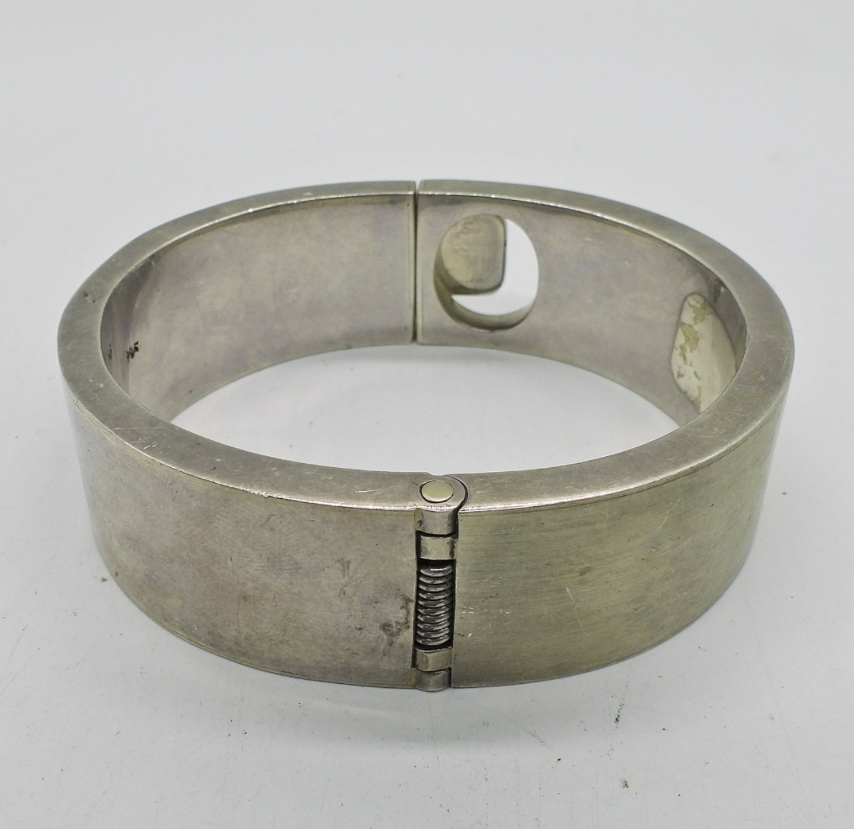 MODERNIST STERLING SILVER BRACELET, BANGLE STYLE WITH HINGE. 7″ INTERIOR. 60 DWT