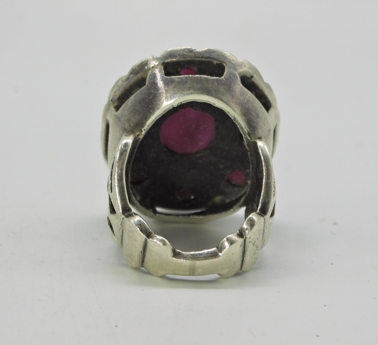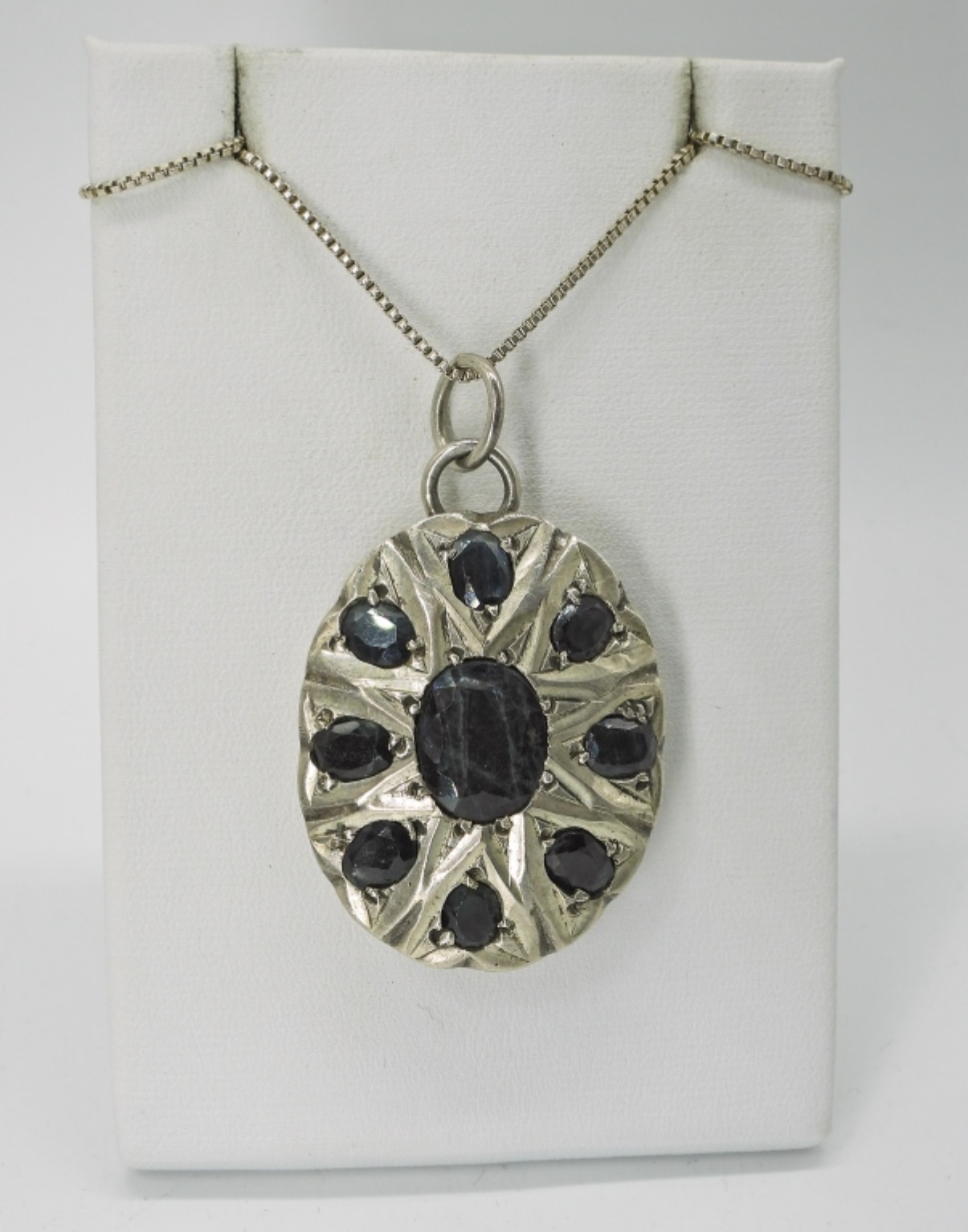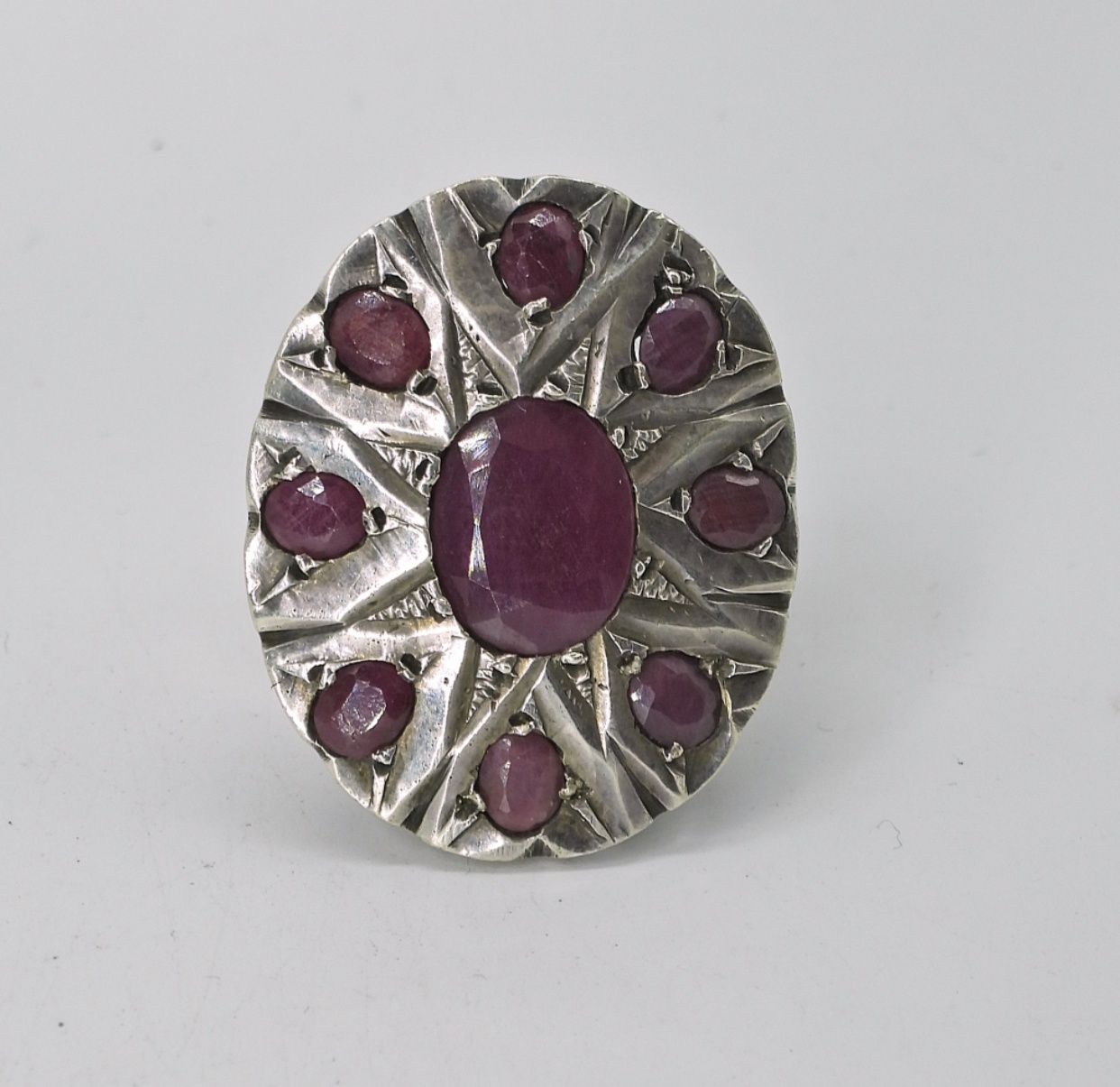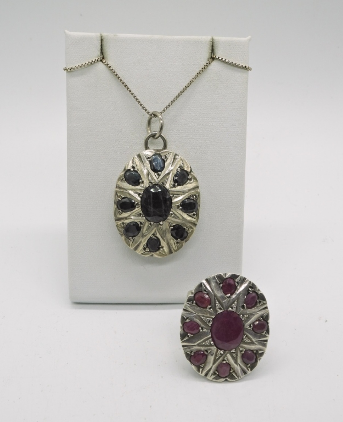 VINTAGE, NATURAL RUBY RING WITH A MATCHING PENDANT WITH NATURAL SAPPHIRE. TOP OF RING MEASURES 1.5″x1″, SIZE 9. NATURAL SAPPHIRE PENDANT ON AN 18″ STERLING CHAIN. PENDANT MEASURES 1.5″x1″. 34.3 DWT