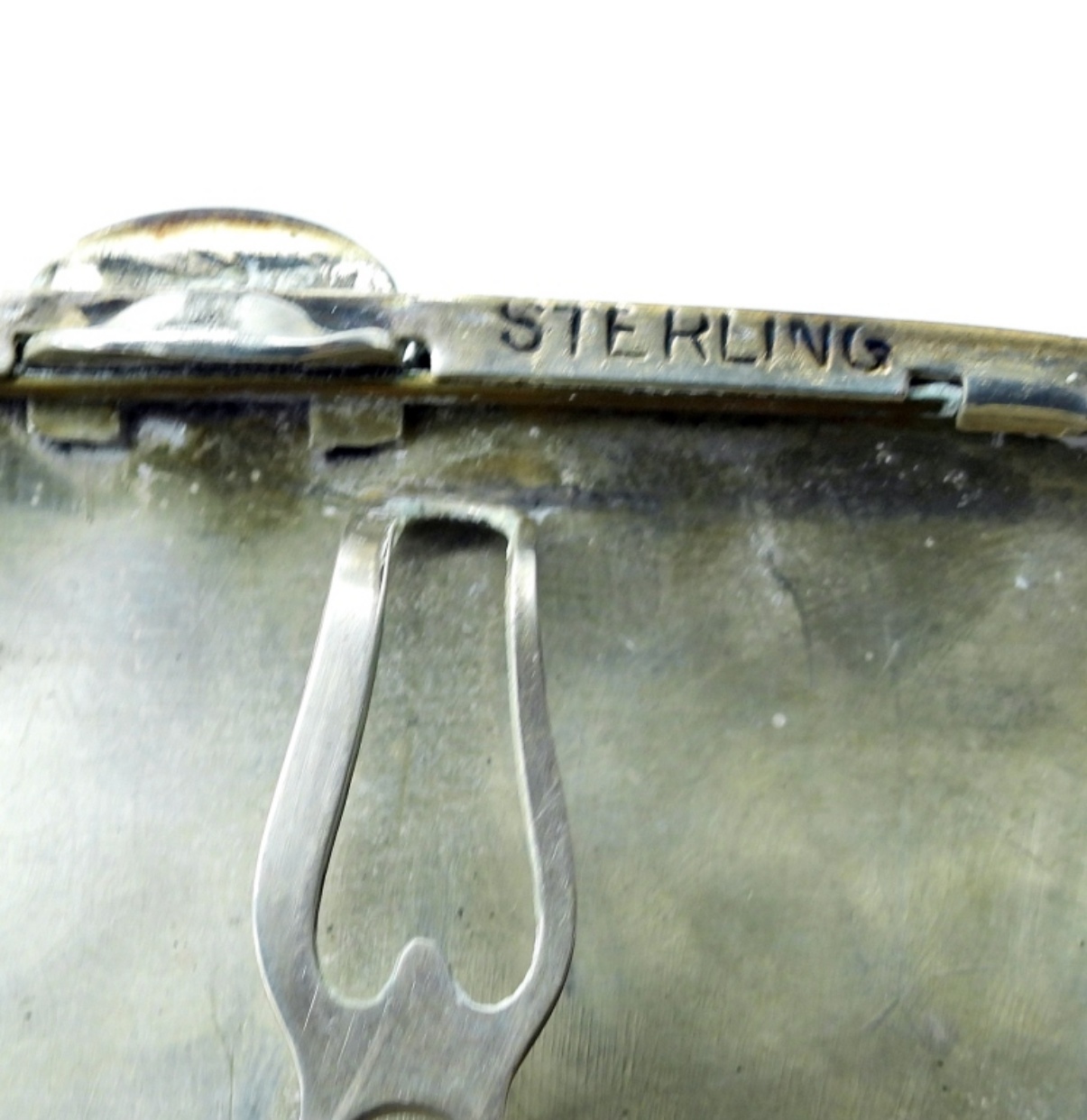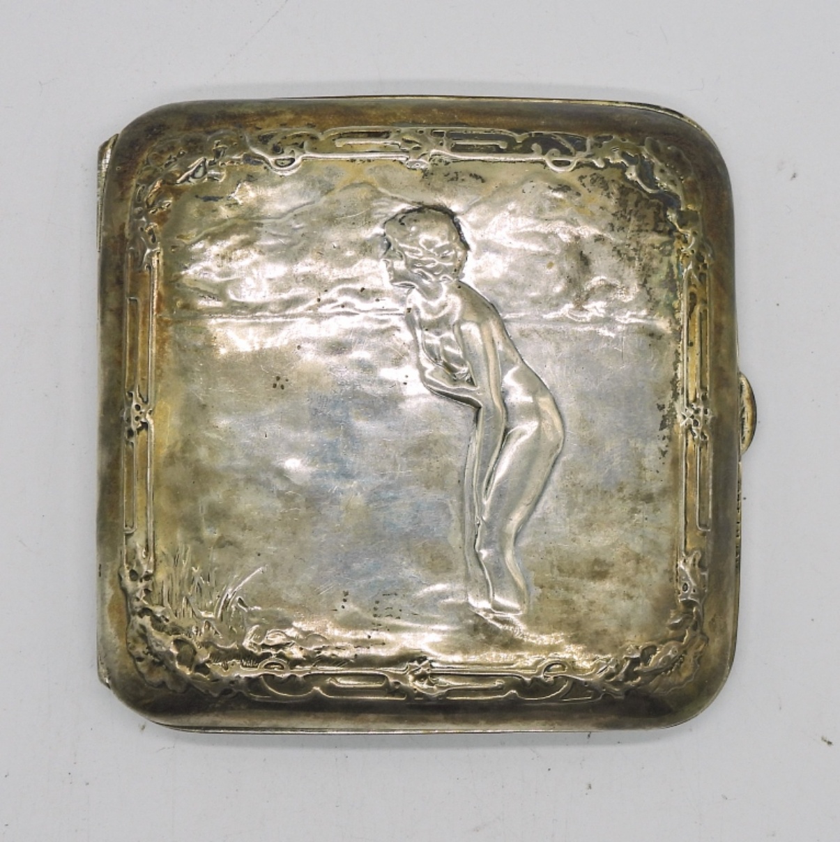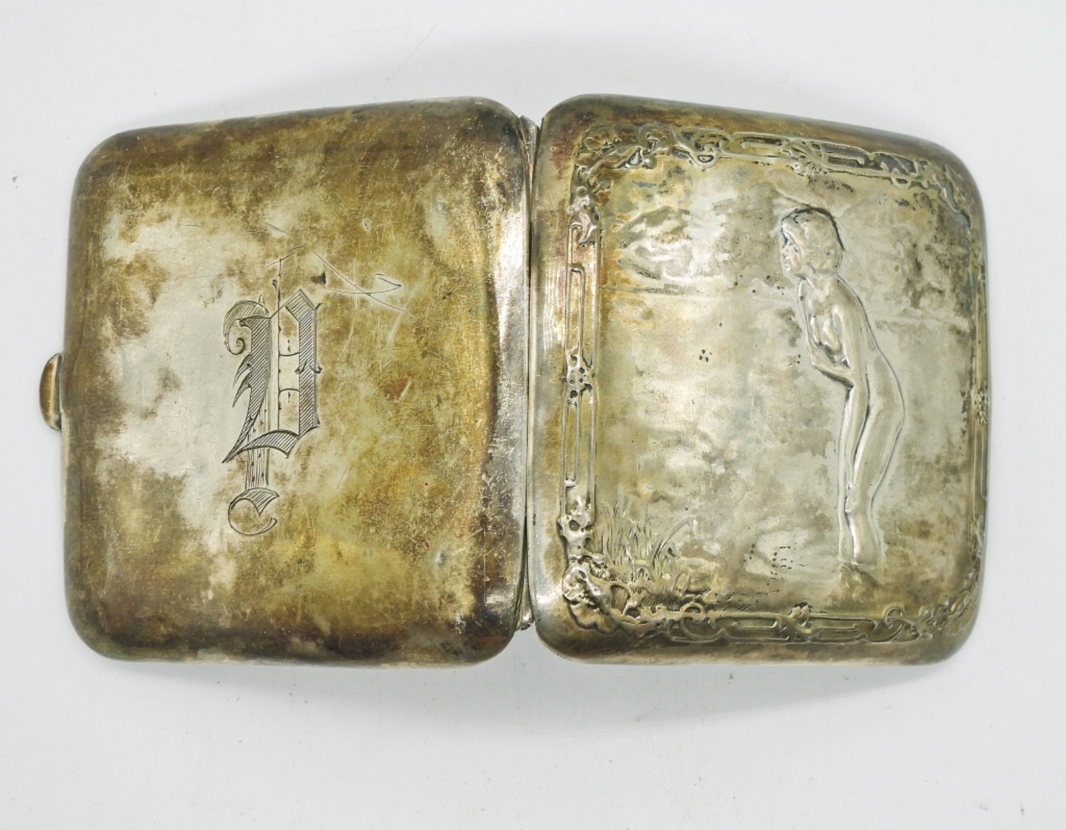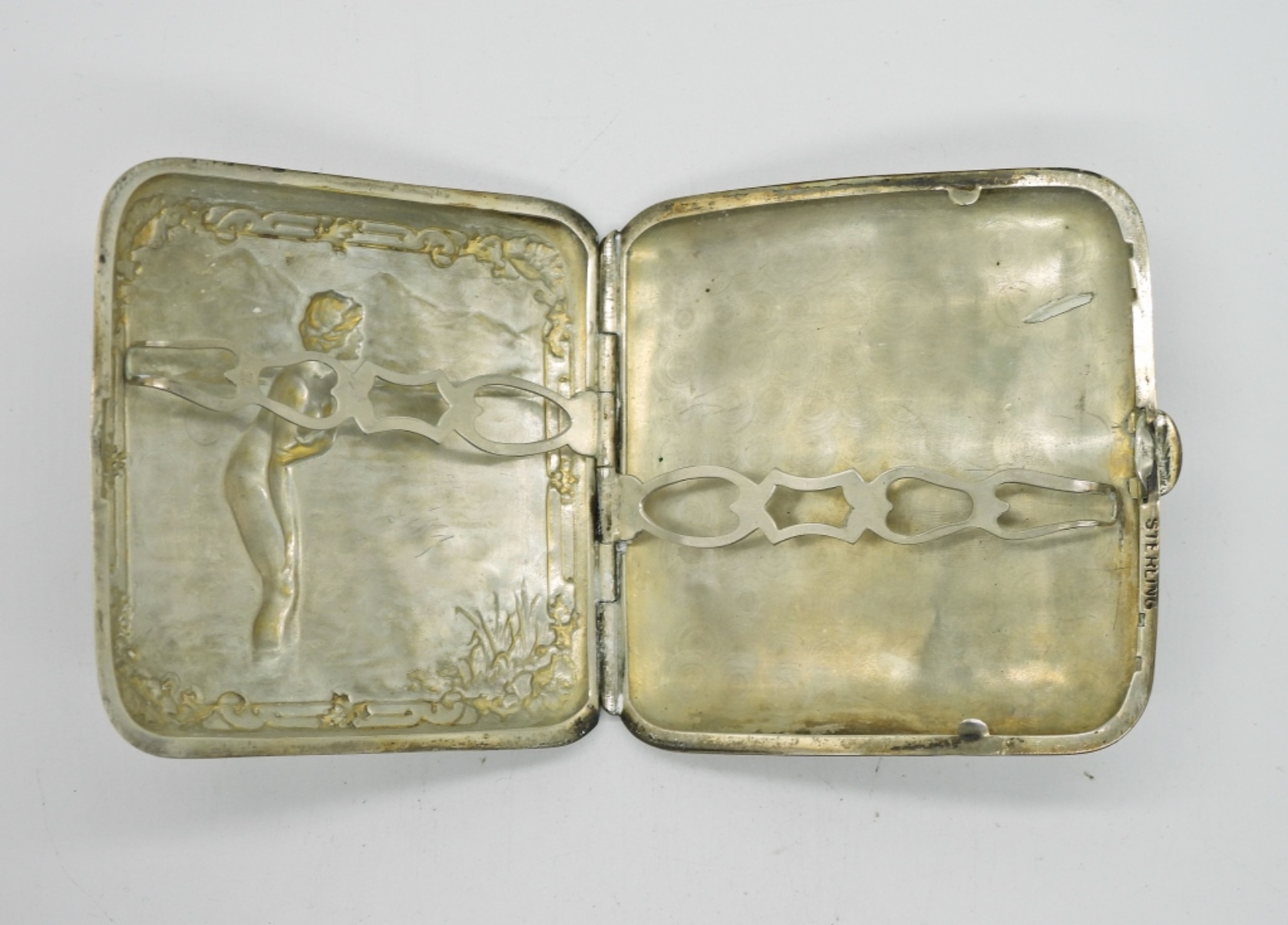 VINTAGE STERLING CIGARETTE CASE WITH NUDE WOMAN ON THE FRONT, BACK IS ENGRAVED WITH A LETTER. MEASUREMENTS ARE 3.5″x3.5″. MARKED “STERLING”. 52.7 DWT