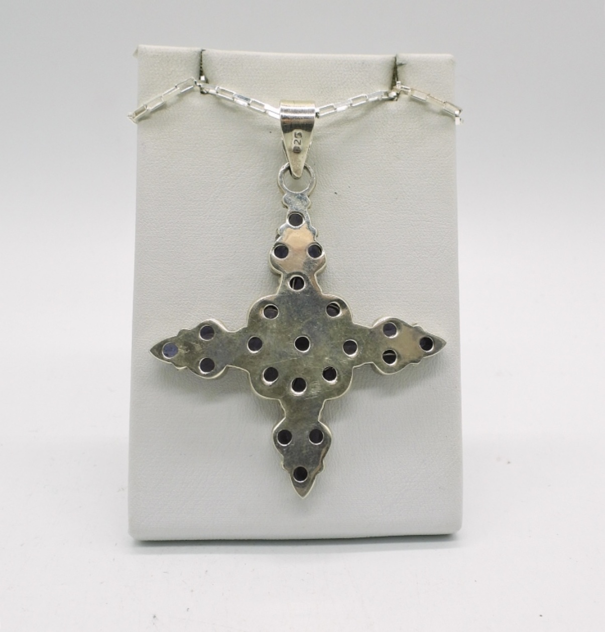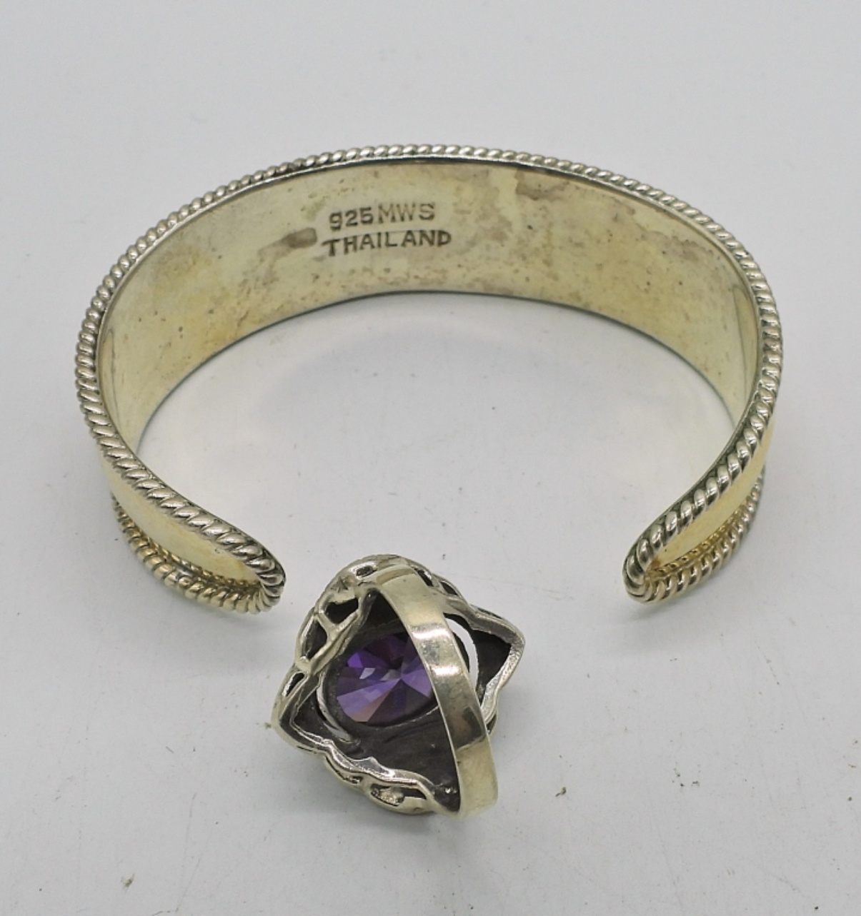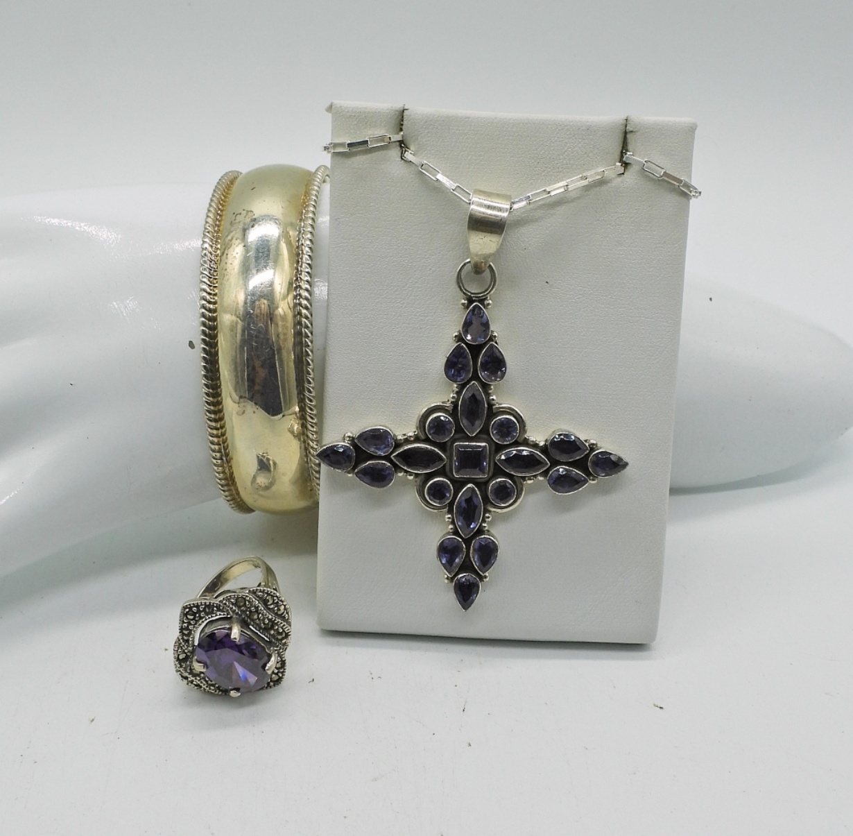 Cuff Bracelet Marked “925 MWS Thailand”, 5″. Cross Style Pendant with Purple Gemstones, Chain is 20″ and Pendant measures 2.5″x 2″. Ring with large Purple Gemstone and Marcasite Accents, Size 6 3/4. (35.5 DWT)