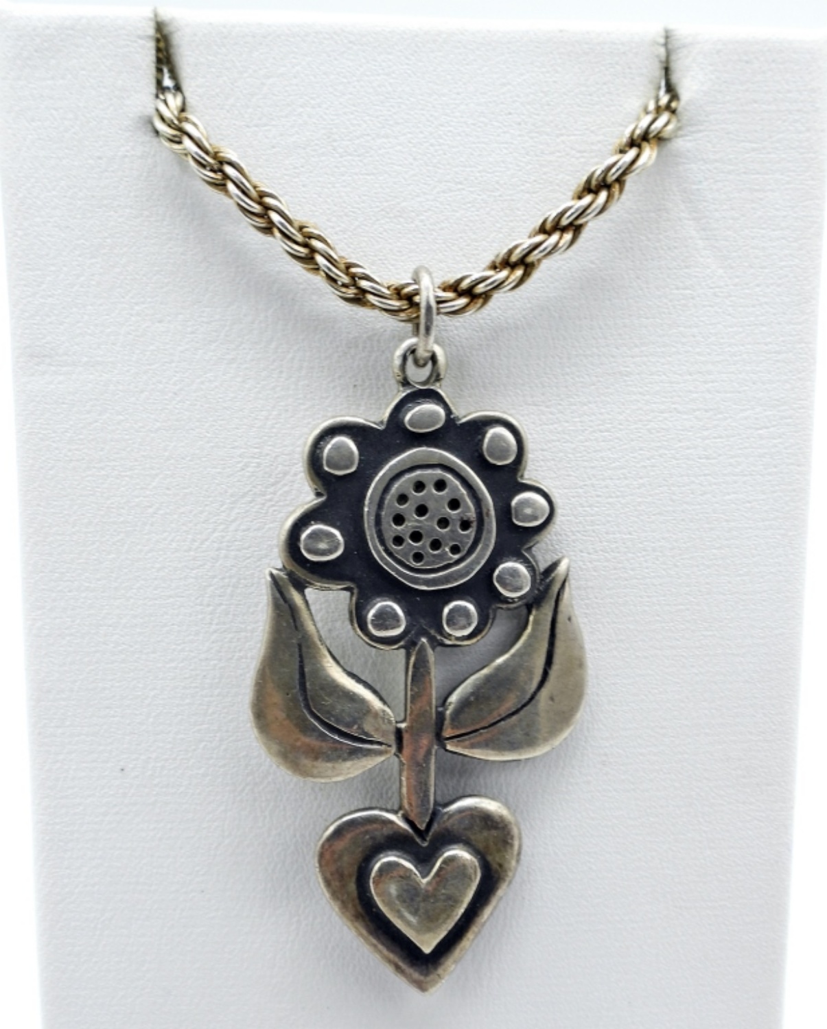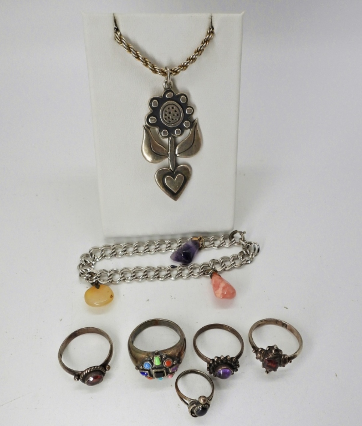 STERLING FLOWER PENDANT ON AN 18″ STERLING CHAIN. STERLING 6″ BRACELET WITH 3 GEMSTONE CHARMS. 5 STERLING RINGS, SIZES 1.5, 6.5, 7, 8. 32.5 DWT