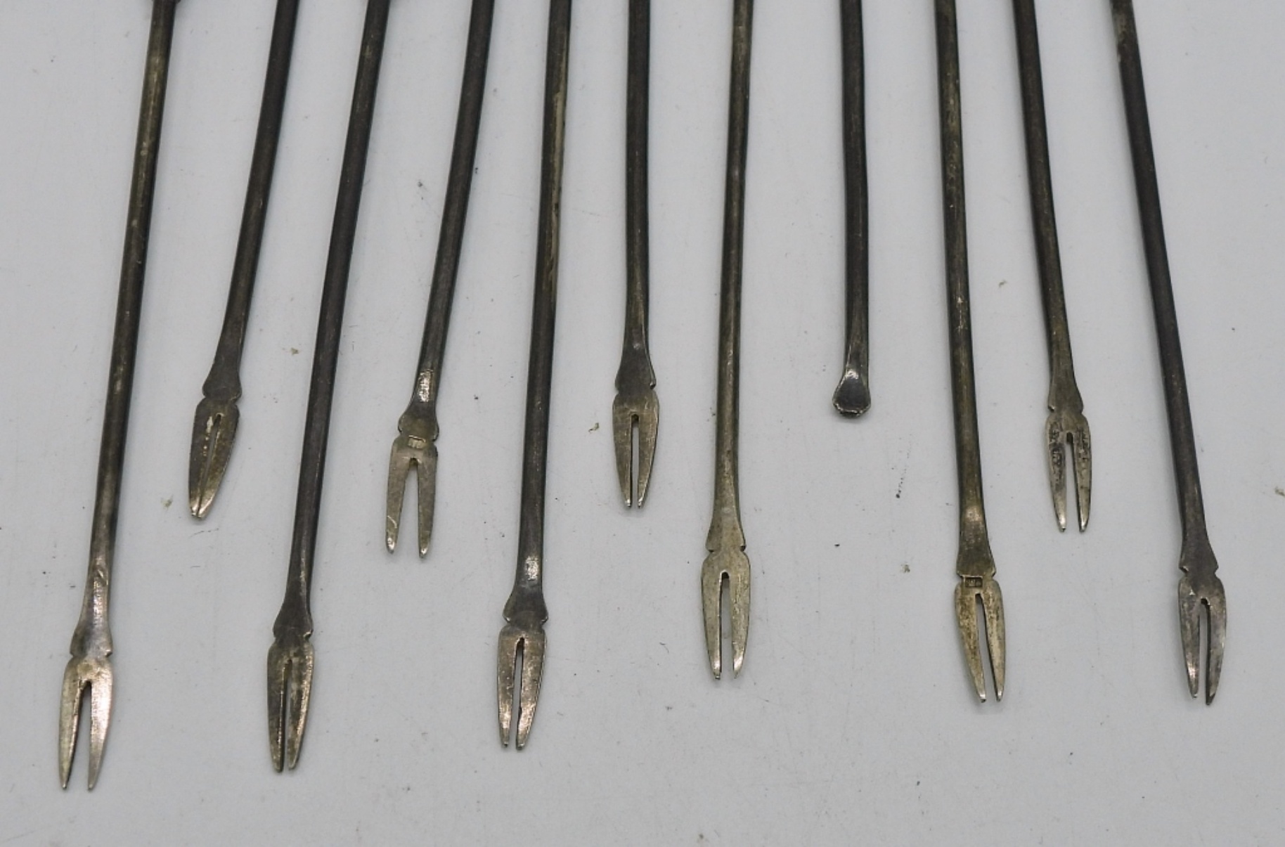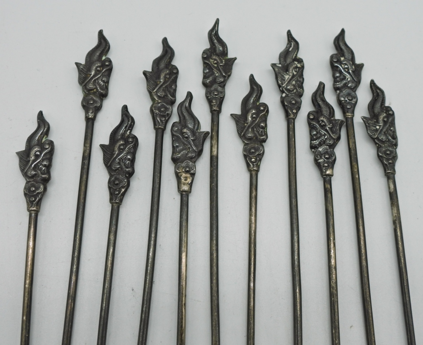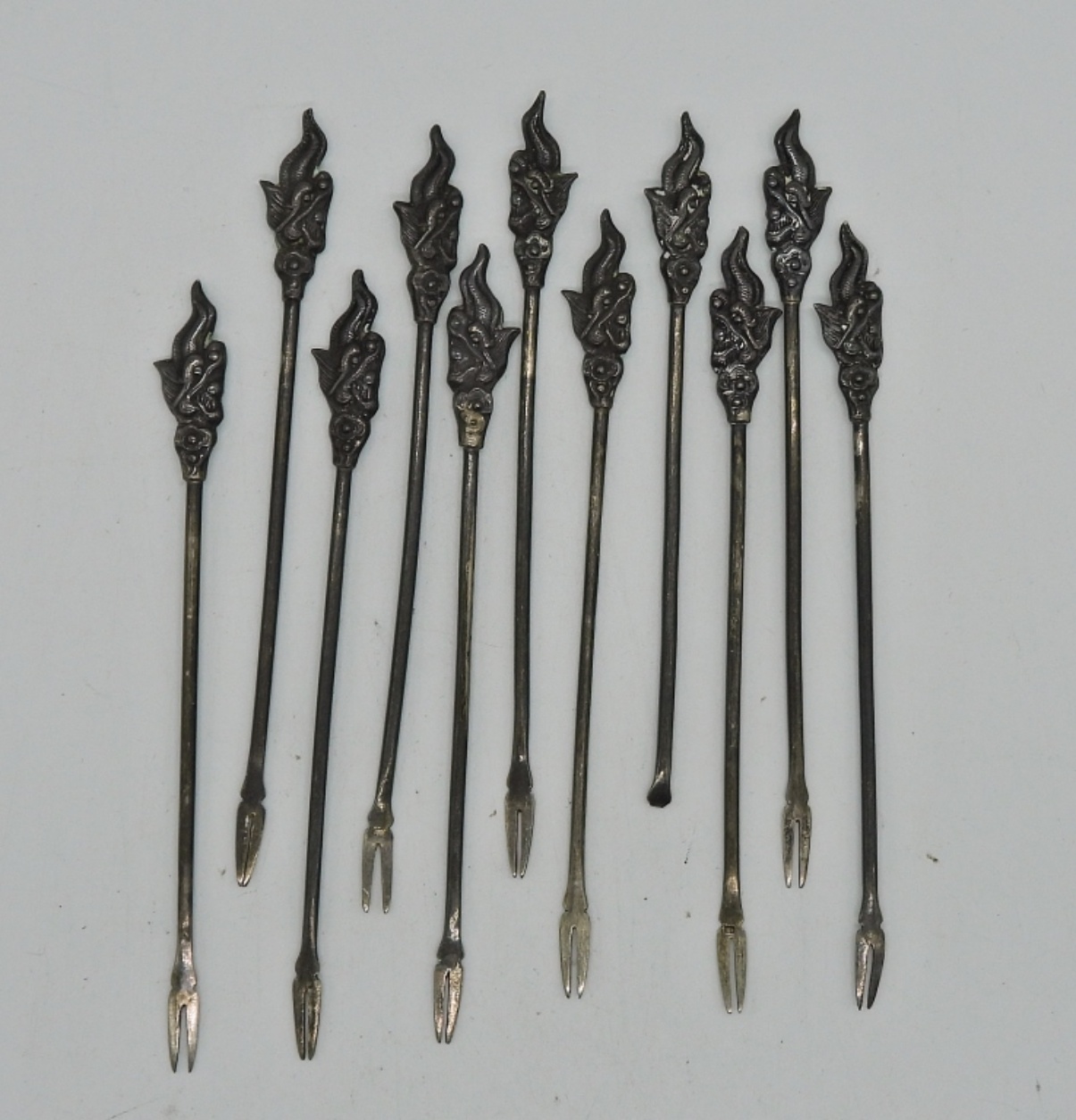Vintage Sterling cocktail olive forks. One is missing the tines. Dragon head embellishes the end of the fork. (27 DWT)