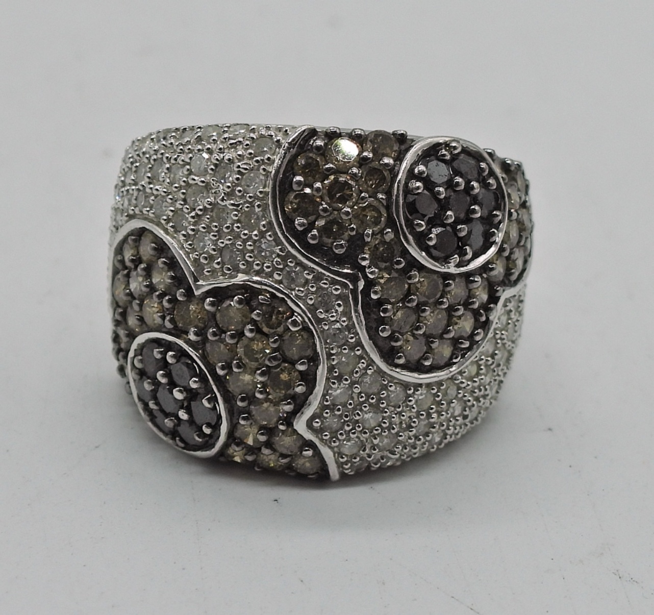 Sparkling flower motif ring size 8 in 10K white gold. White & Champagne Moissanite gemstones (tested Moissanite) (DWT 5.2)