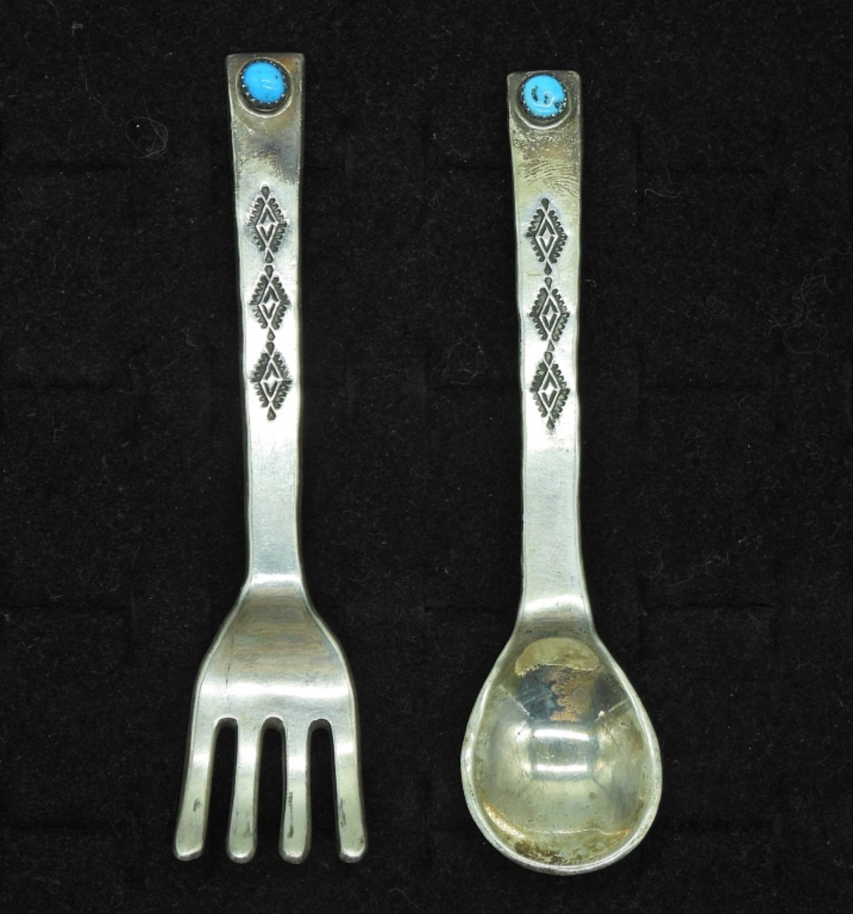 VINTAGE STERLING SOUTHWEST BABY SPOON AND FORK WITH TURQUOISE. MARKED STERLING. 20.4 DWT