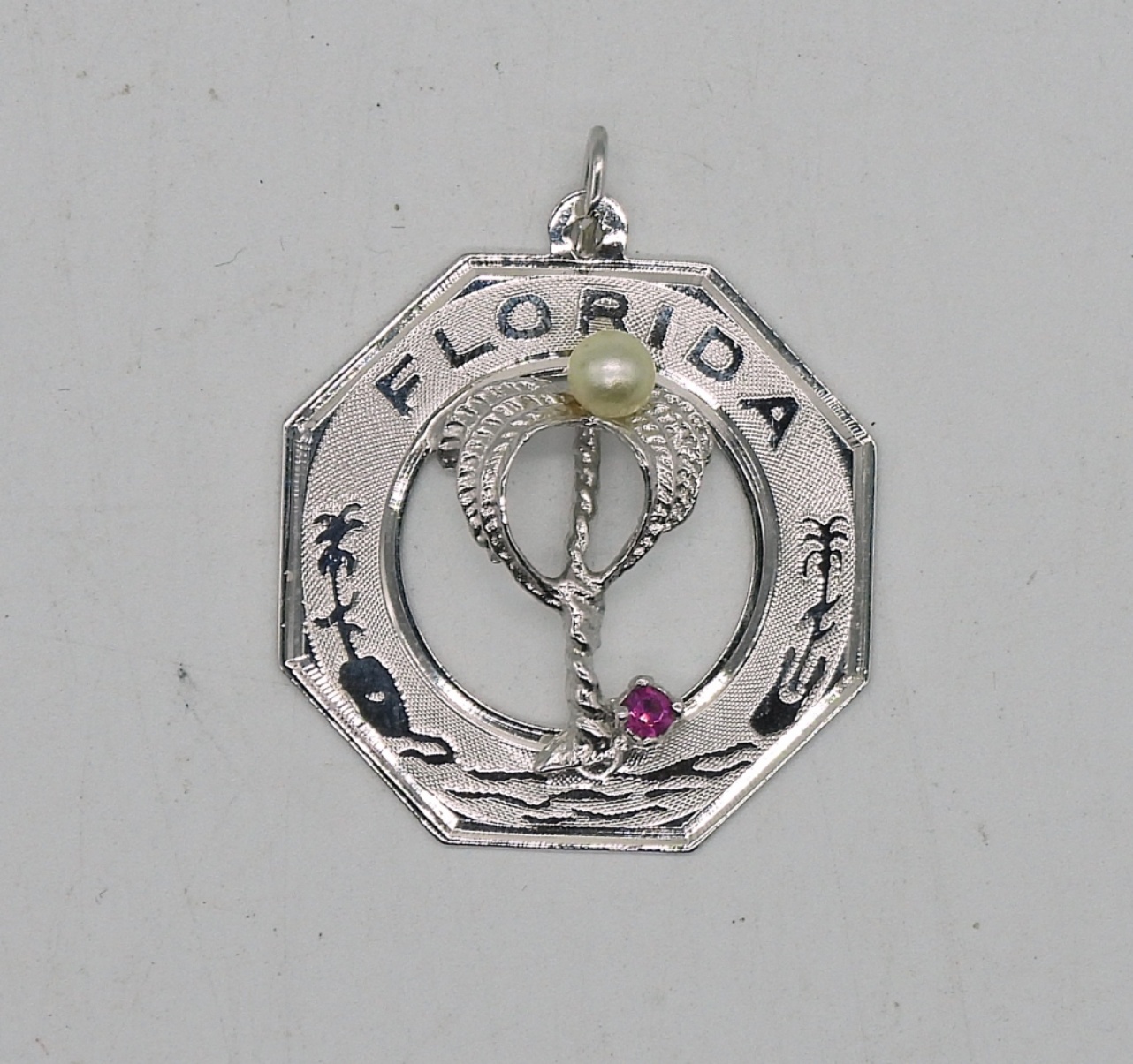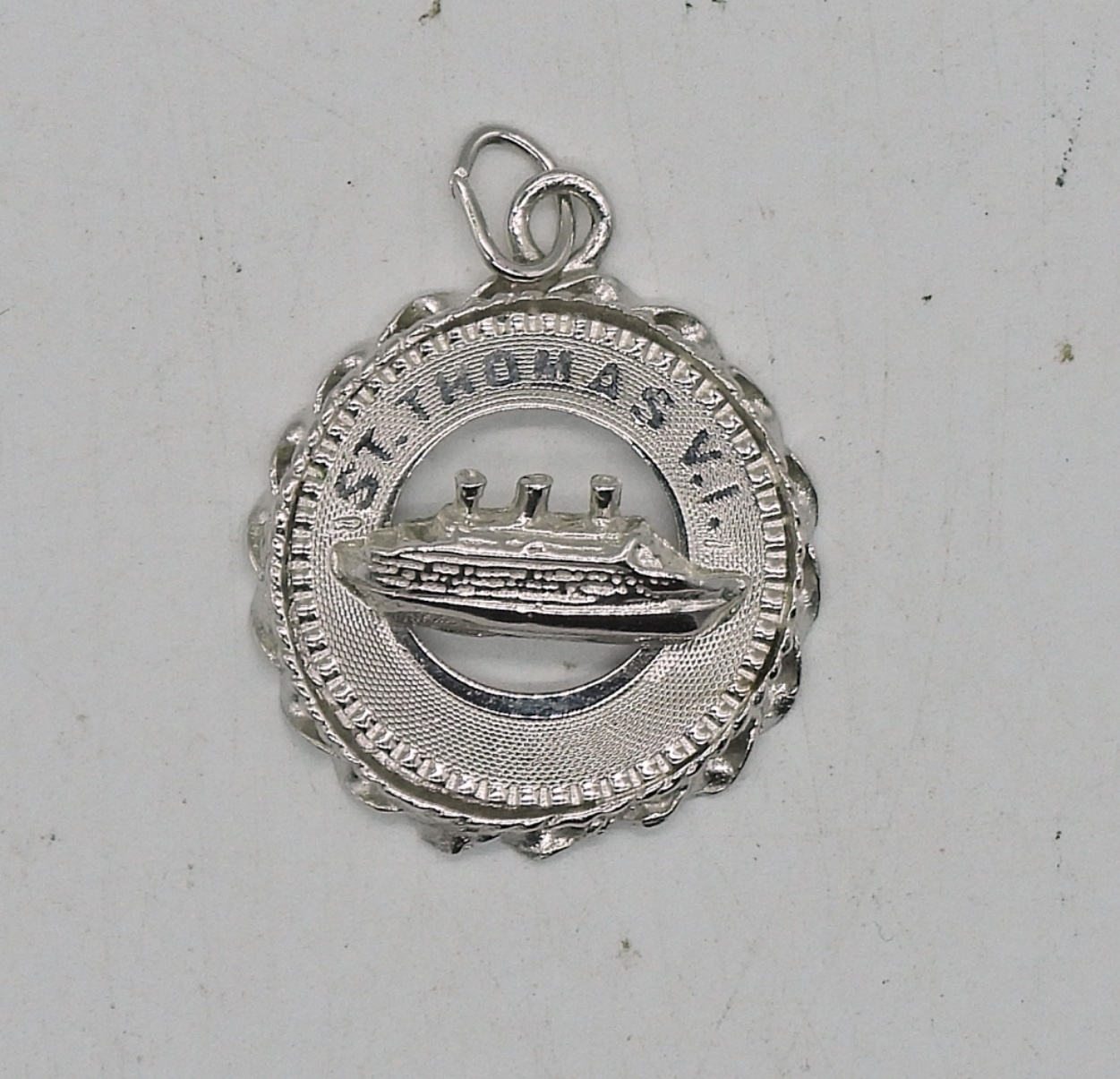 3 VINTAGE STERLING PENDANTS WITH ONE CHAIN. WALT DISNEY WORLD, MICKEY MOUSE PENDANT (STERLING-WALT DISNEY PRODUCTIONS) ON AN 18″ STERLING CHAIN. STERLING “FLORIDA” AND “ST. THOMAS V.I.” PENDANTS. 8.9 DWT