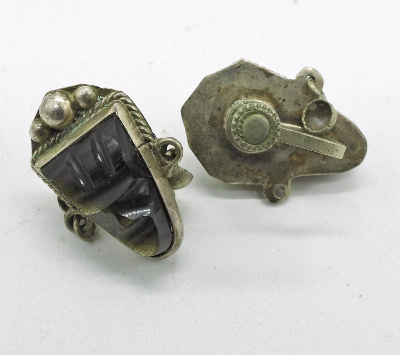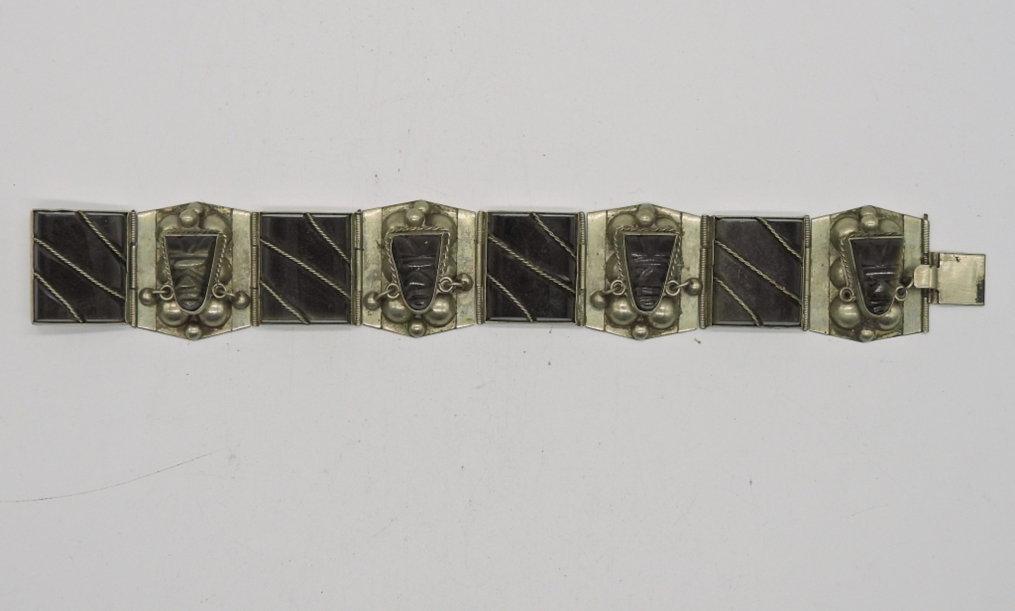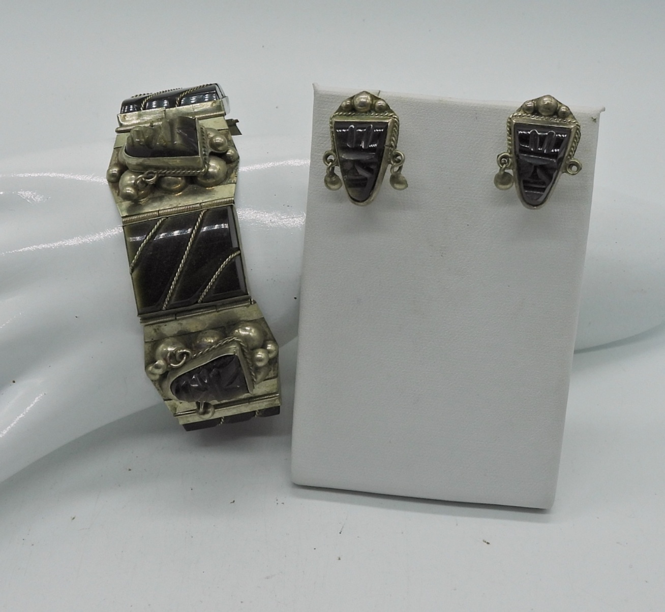 Vintage Sterling Bracelet & Matching Earrings with Onyx Gemstones. Marked “Sterling 925 N.S. Taxco”. 7.5″. 44.9 DWT